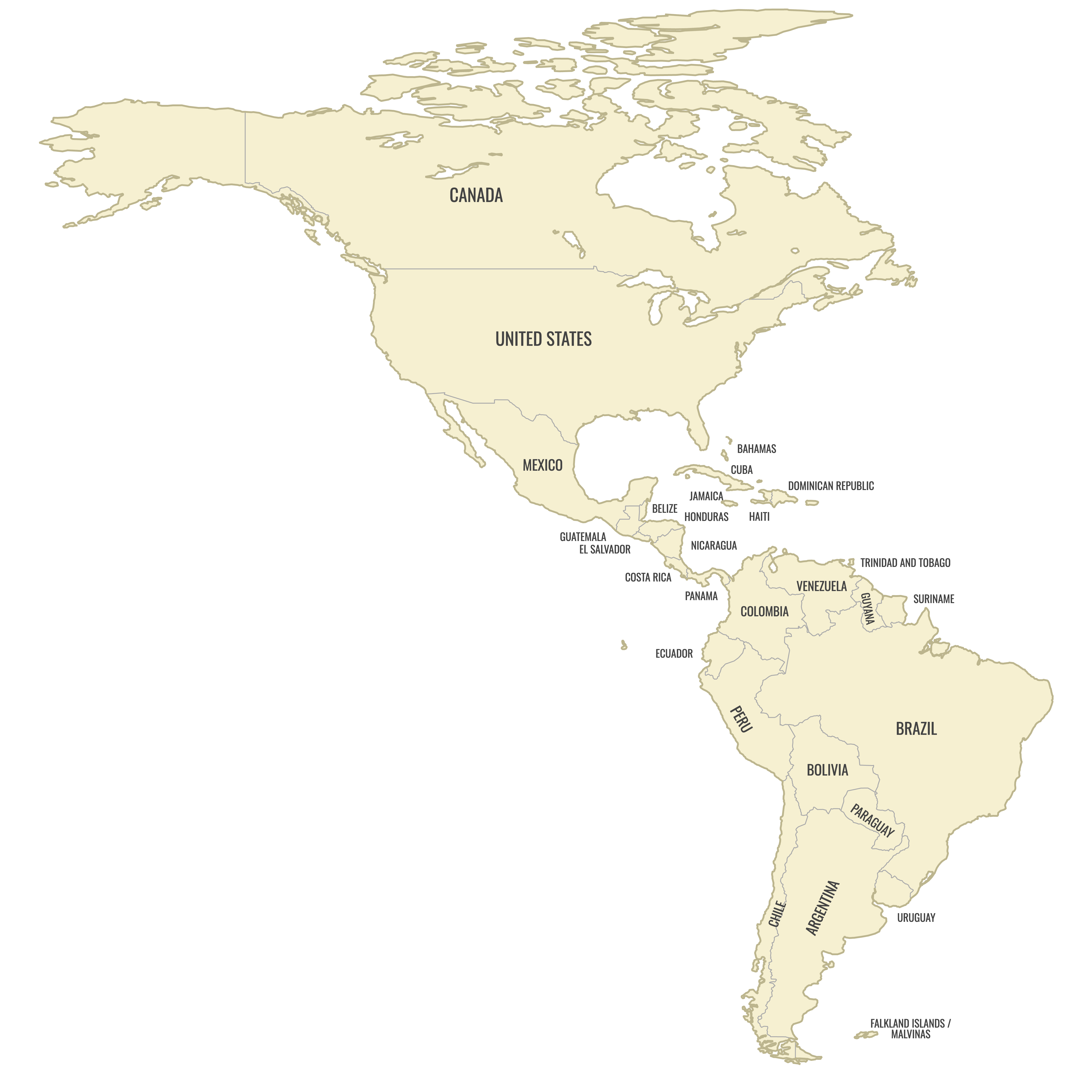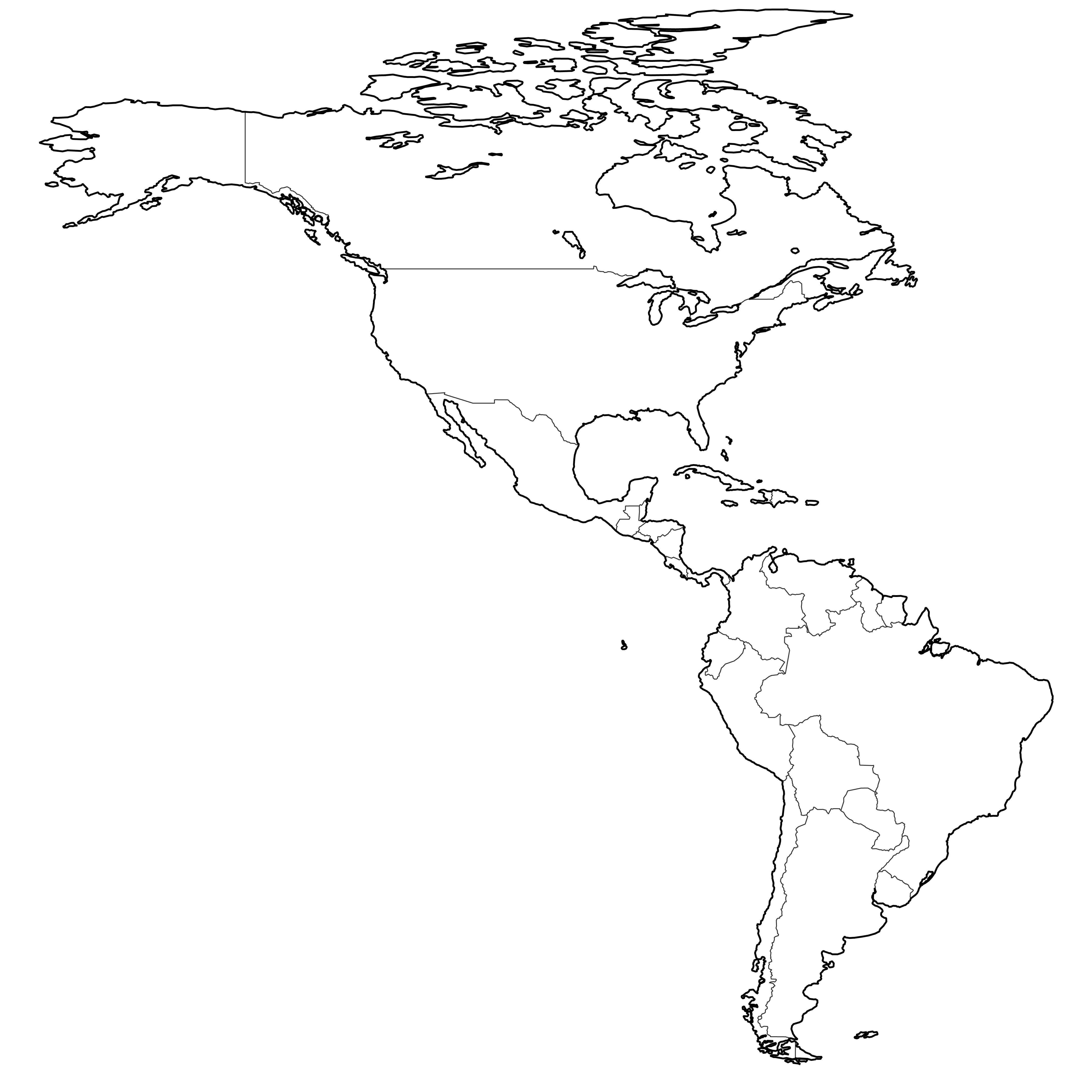 Below you can download free blank Map of Americas in high resolution PNG or SVG formats suitable for printing or further editing. Most of the maps available in different color schemes and with different features (such as labels, roads or rivers). PNG maps are in 3600x3600px resolution and come with a transparent background.