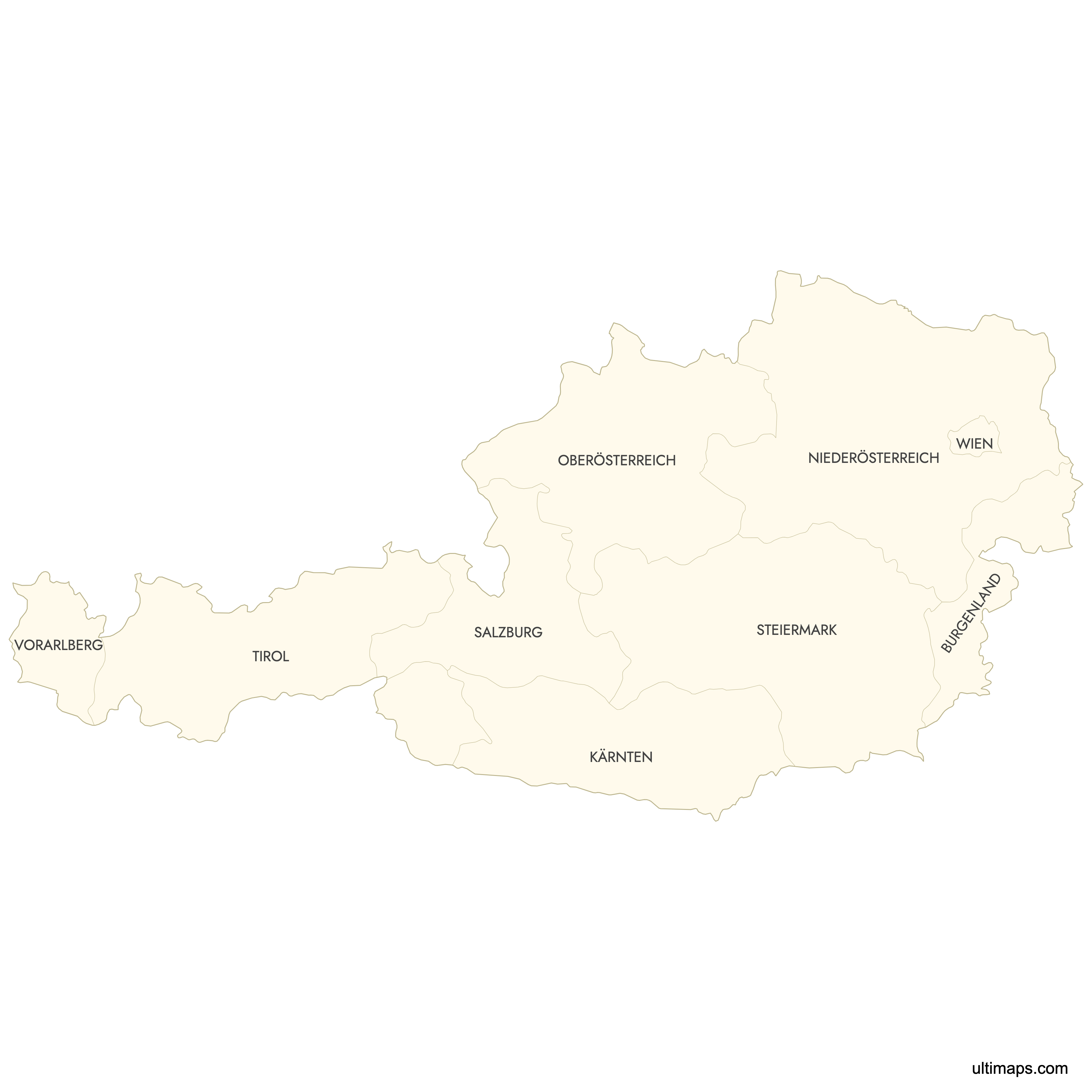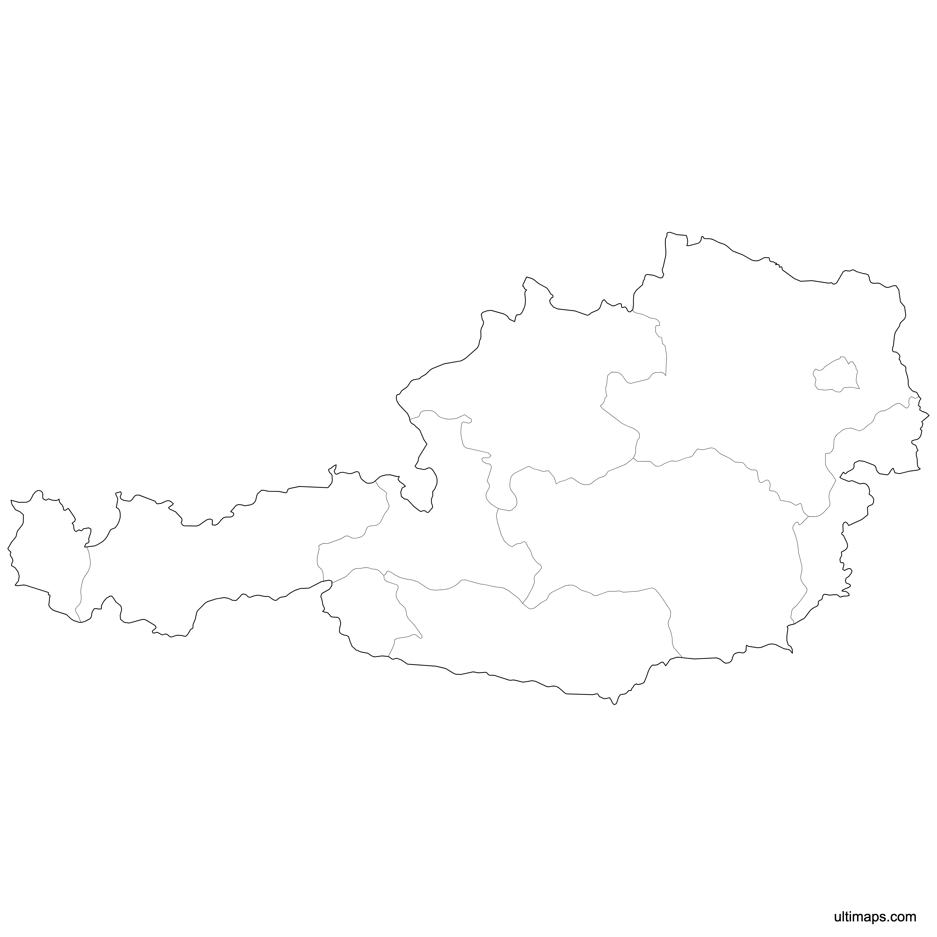 Download free blank Map of Austria States in high-resolution PNG, PDF and SVG formats. Perfect for printing, coloring, presentations, and educational projects. Most of the maps available in different color schemes and with different features (such as labels, roads or rivers).