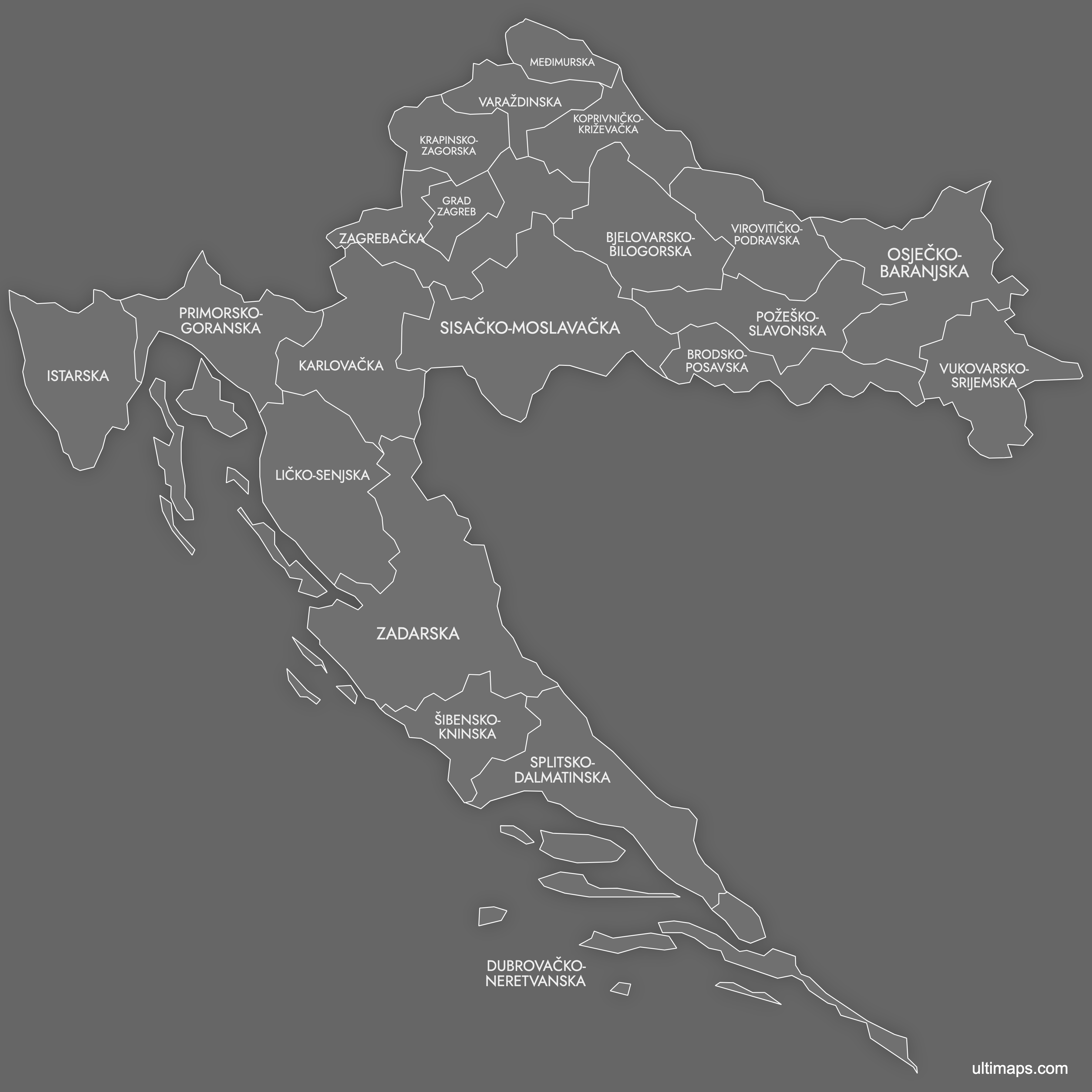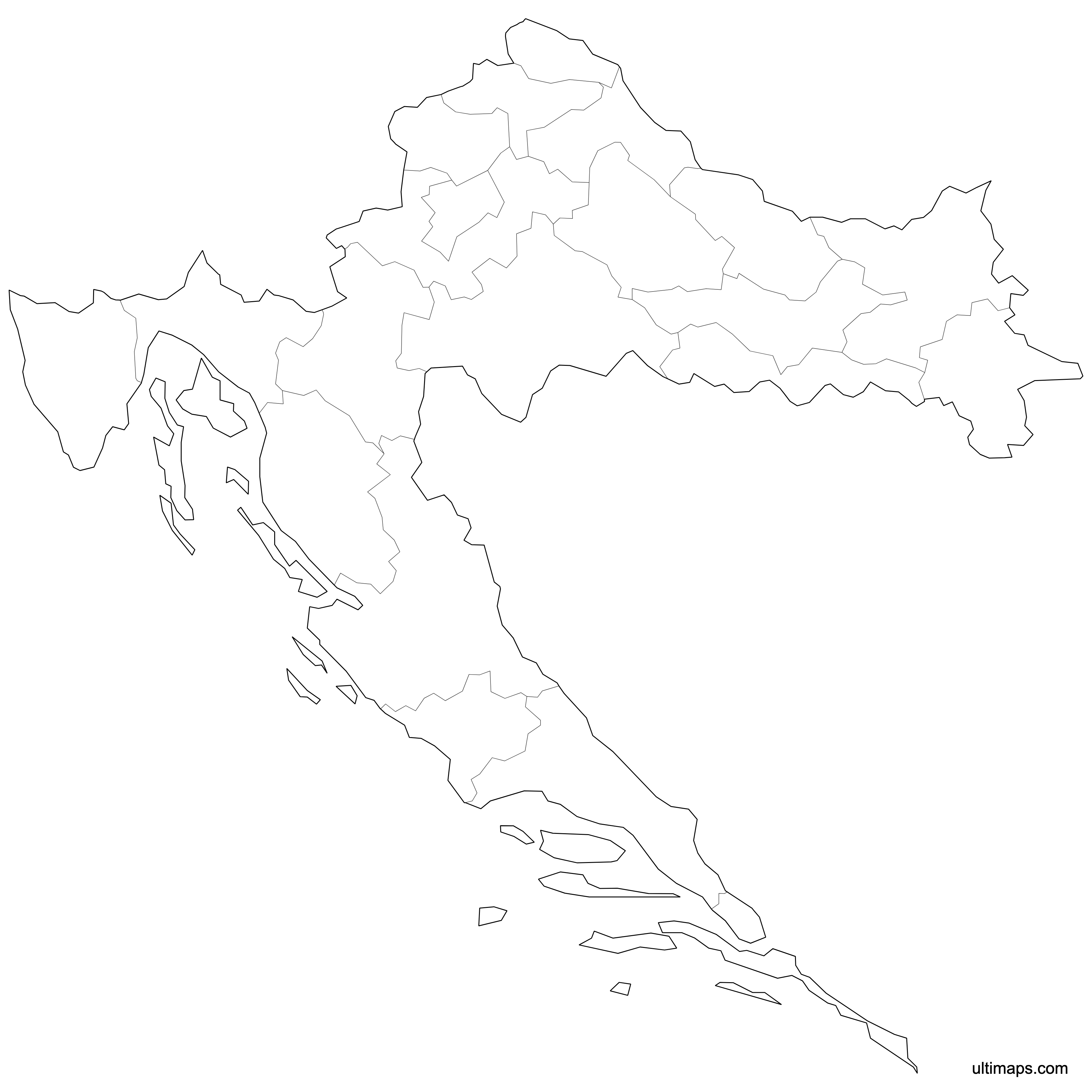 Download free blank Map of Croatia Counties in high-resolution PNG, PDF and SVG formats. Available in blank, outline, and labeled versions - perfect for printing, coloring, presentations, and educational projects. All maps are editable in graphics software and can be customized further in Ultimaps Studio.