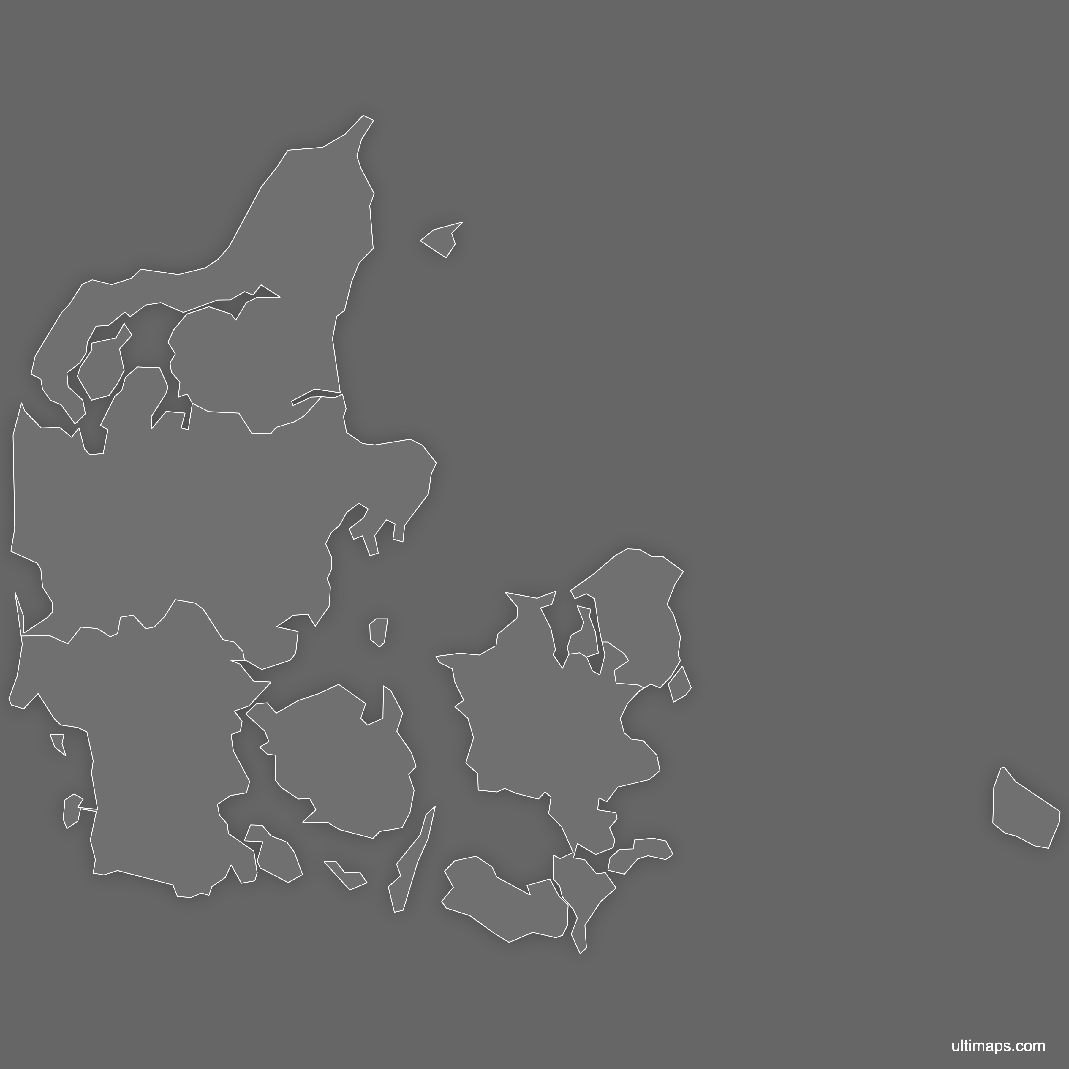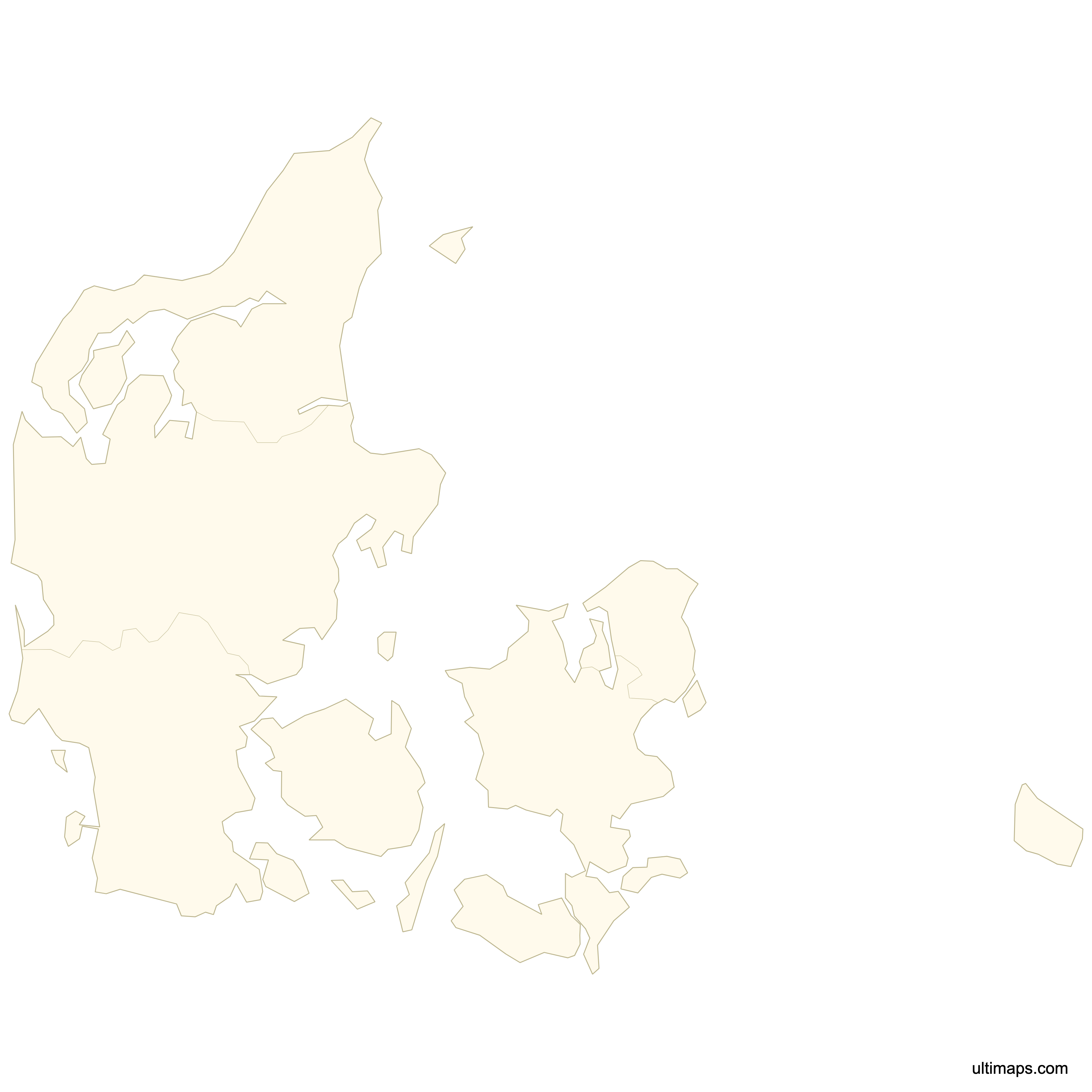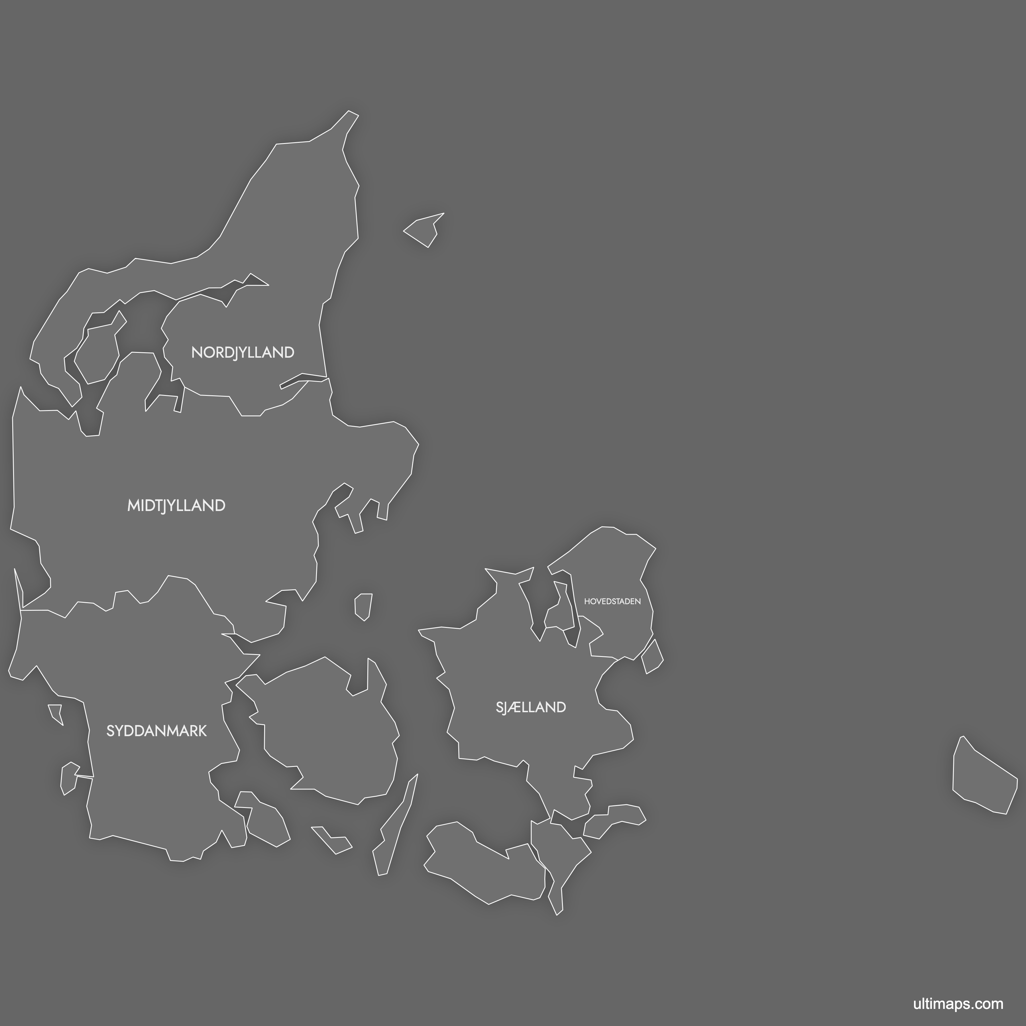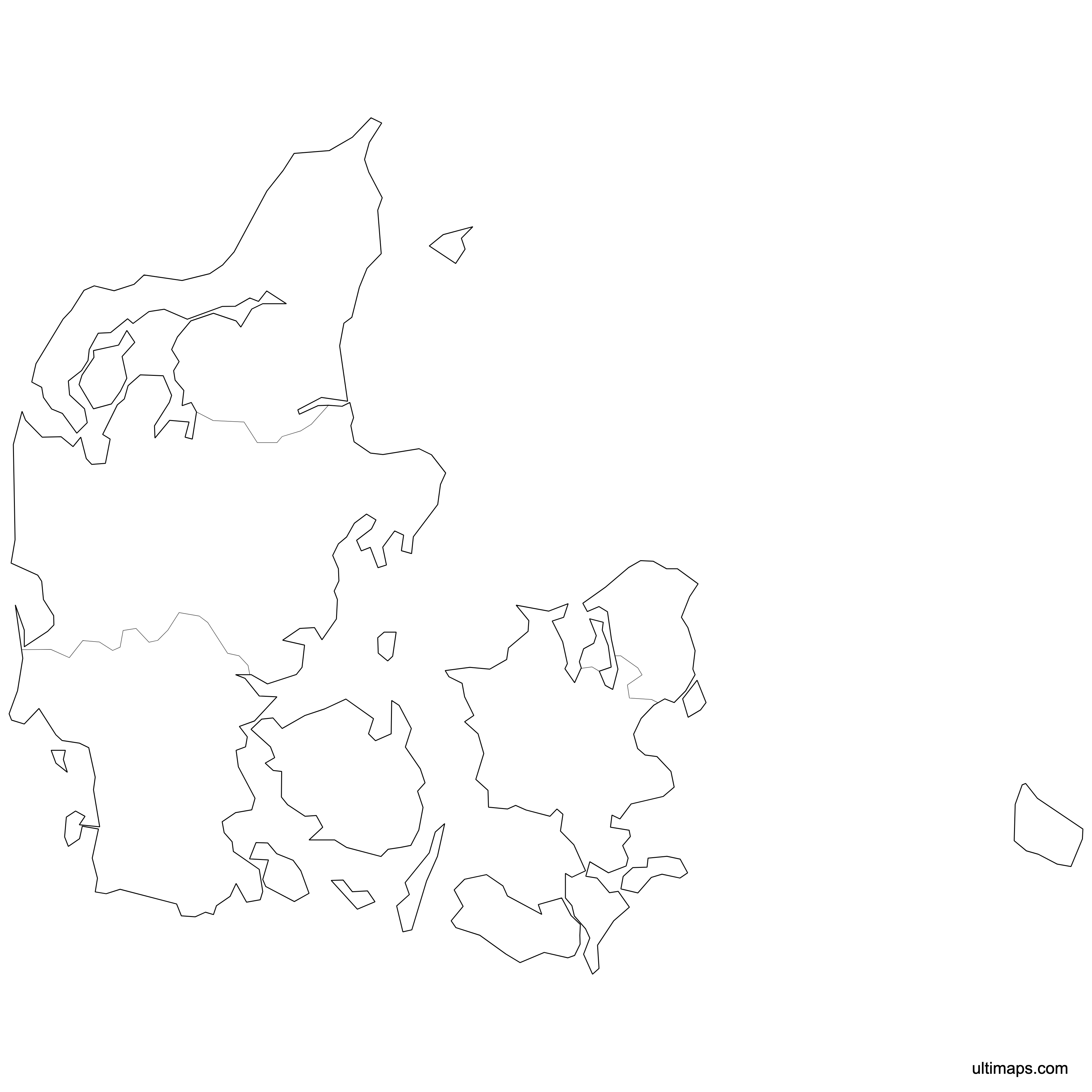Download free blank Map of Denmark Regions in high-resolution PNG, PDF and SVG formats. Available in blank, outline, and labeled versions - perfect for printing, coloring, presentations, and educational projects. All maps are editable in graphics software and can be customized further in Ultimaps Studio.