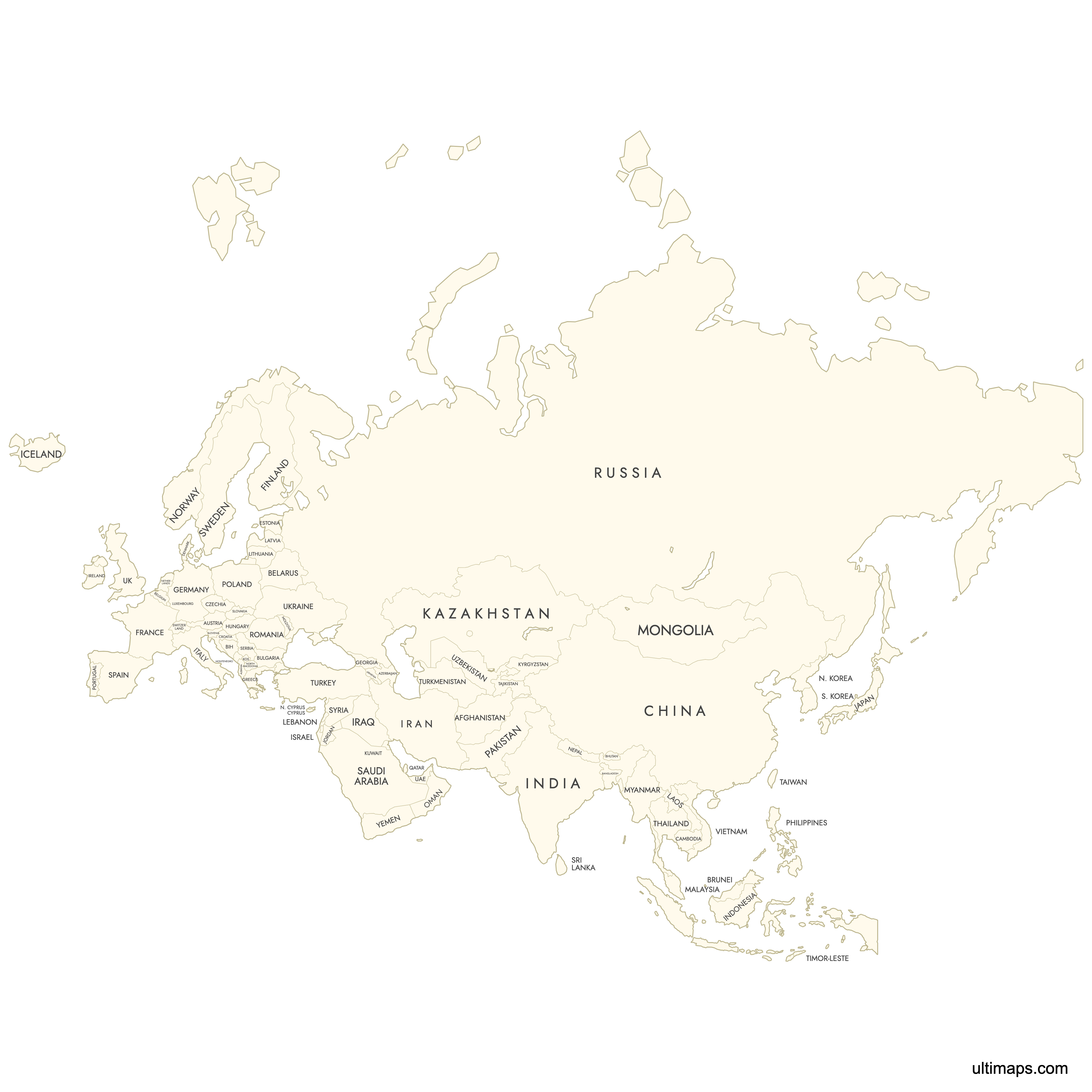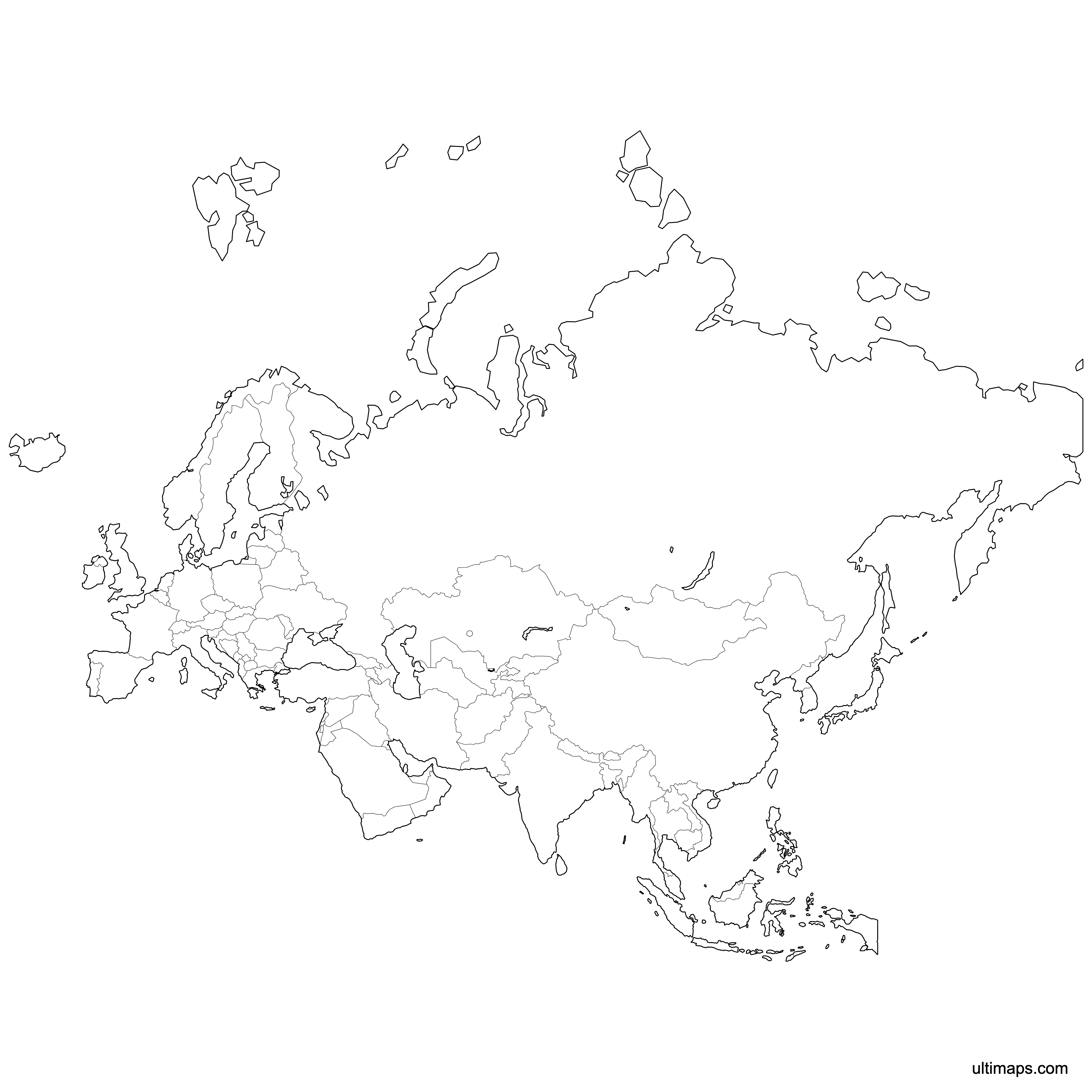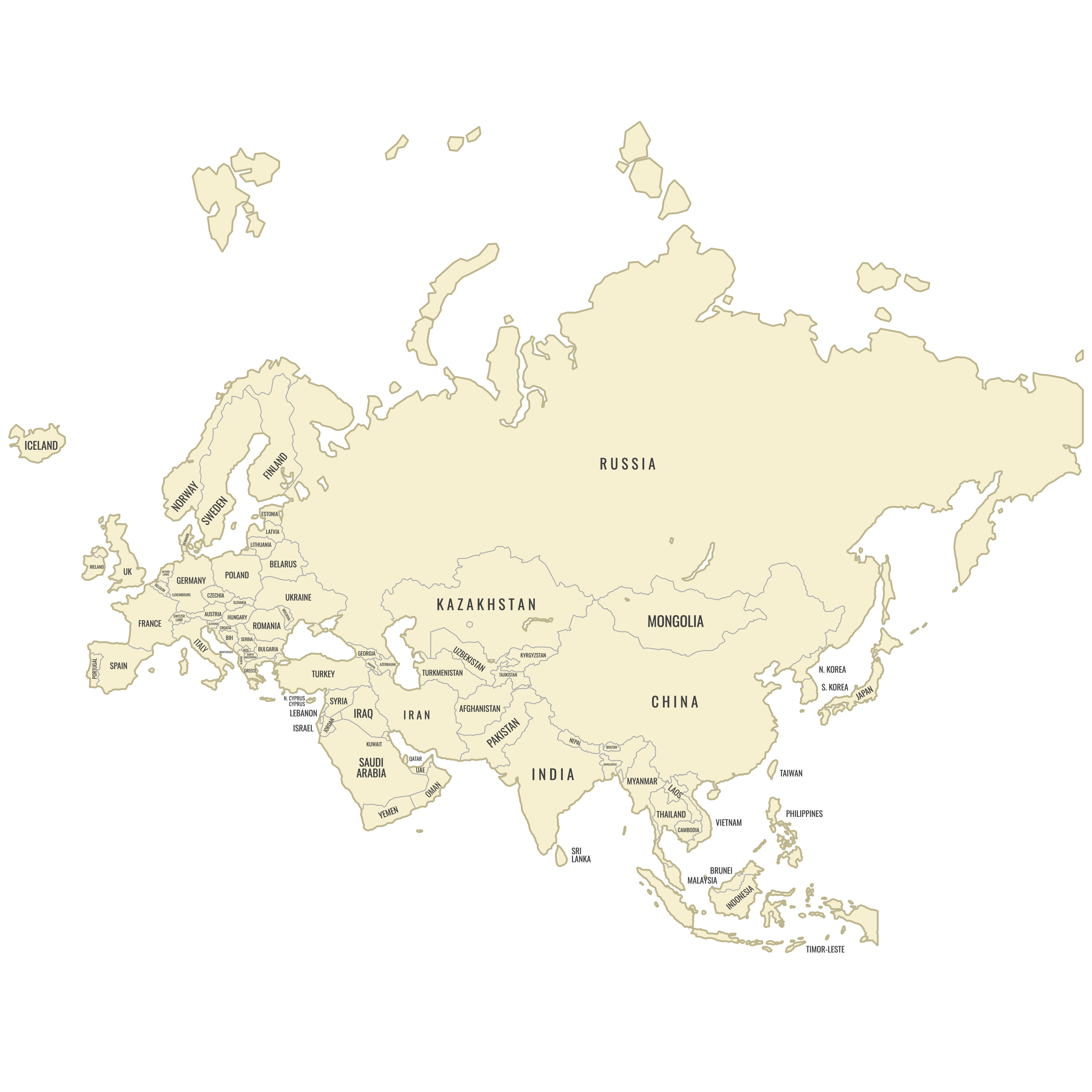 Below you can download free blank Map of Eurasia in high resolution PNG or SVG formats suitable for printing or further editing. Most of the maps available in different color schemes and with different features (such as labels, roads or rivers). PNG maps are in 3600x3600px resolution and come with a transparent background.