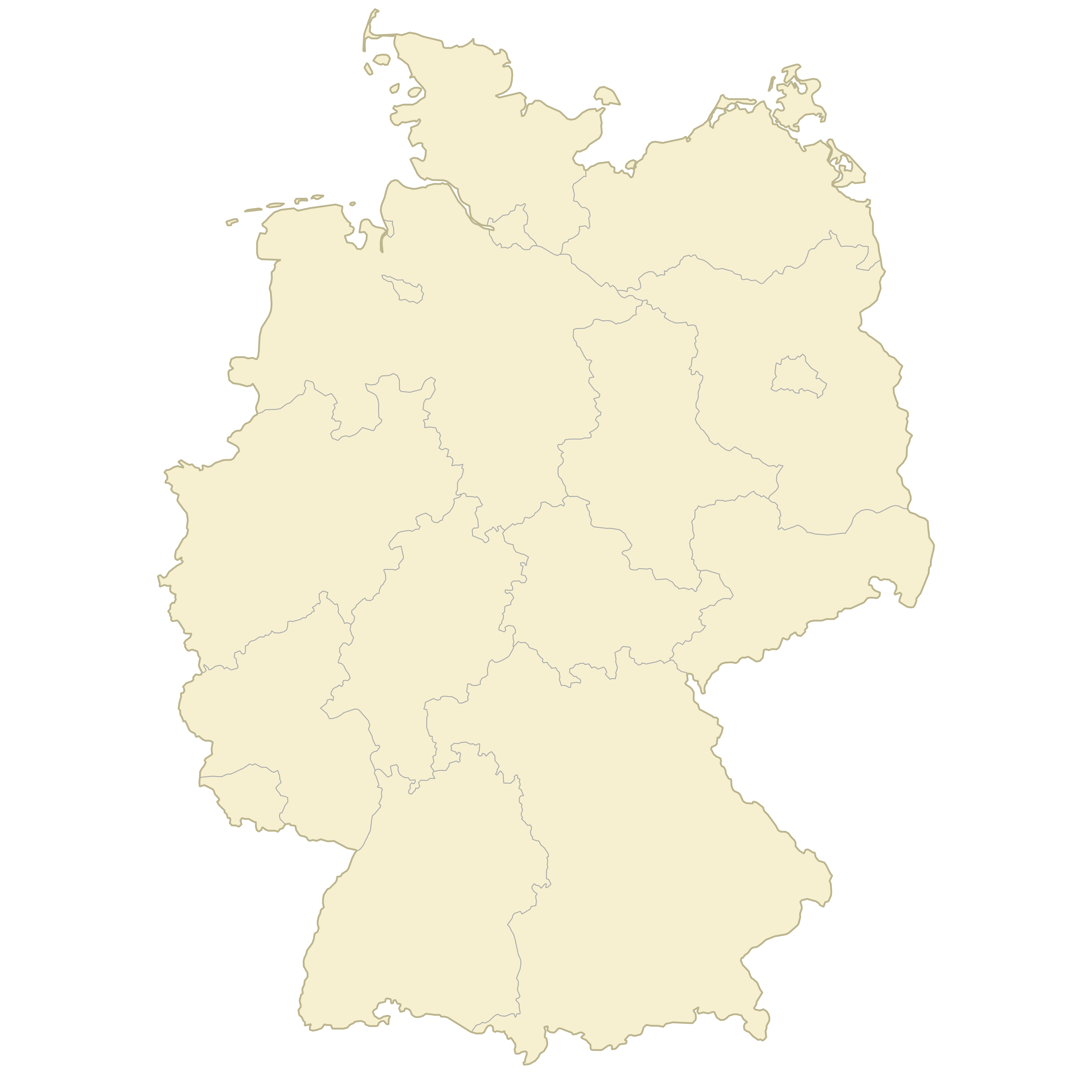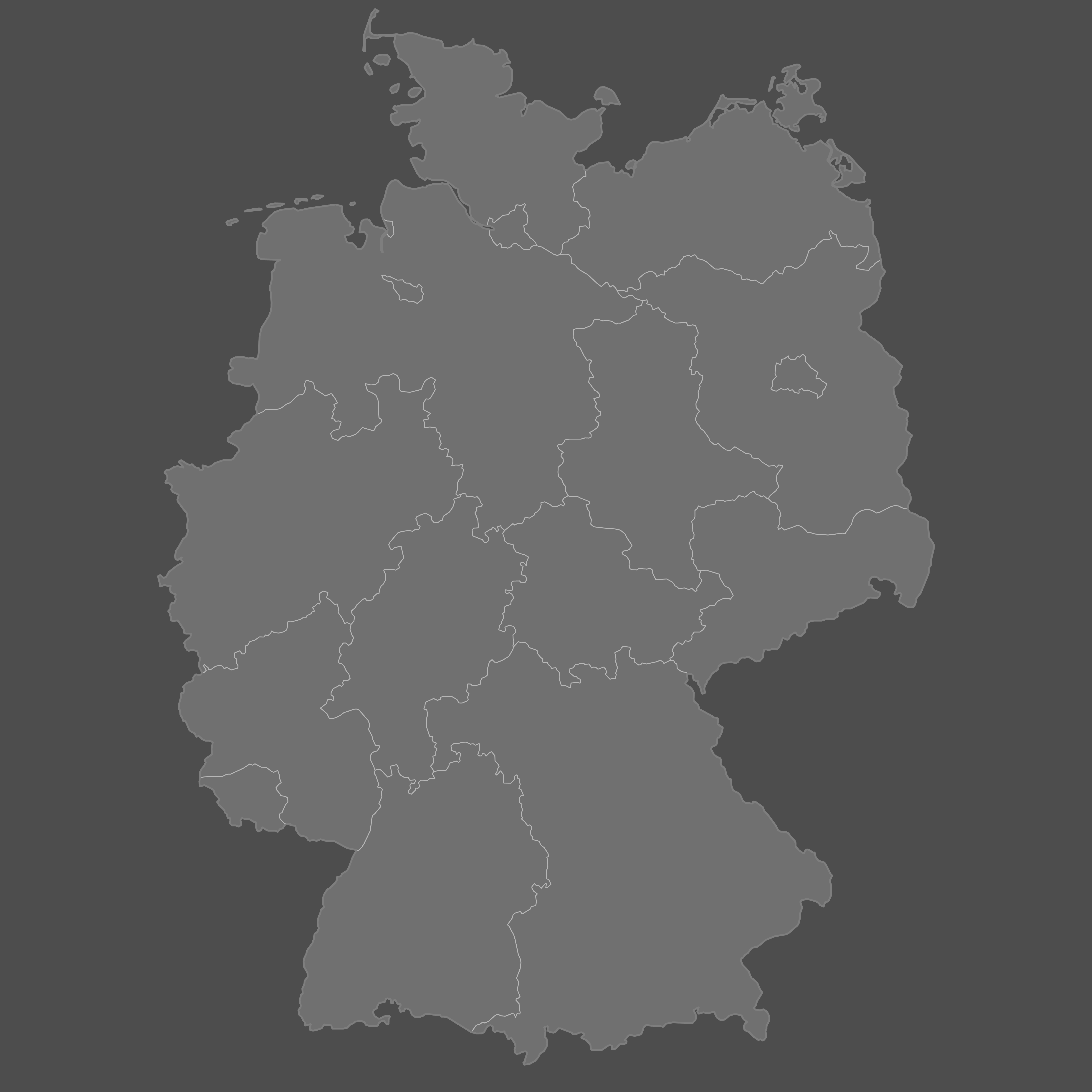 Below you can download free blank Germany States Map in high resolution PNG or SVG formats suitable for printing or further editing. Most of the maps available in different color schemes and with different features (such as labels, roads or rivers). PNG maps are in 3600x3600px resolution and come with a transparent background.