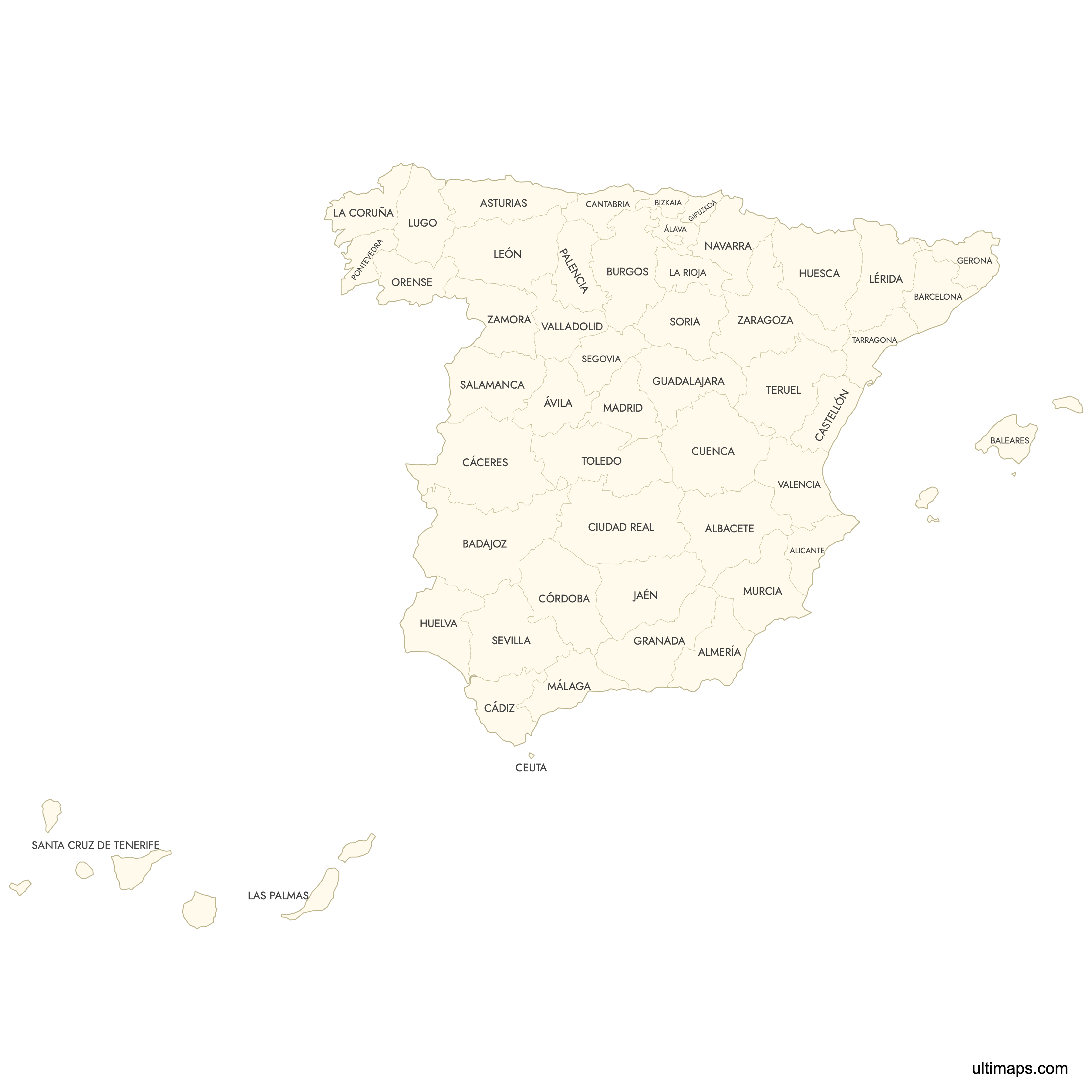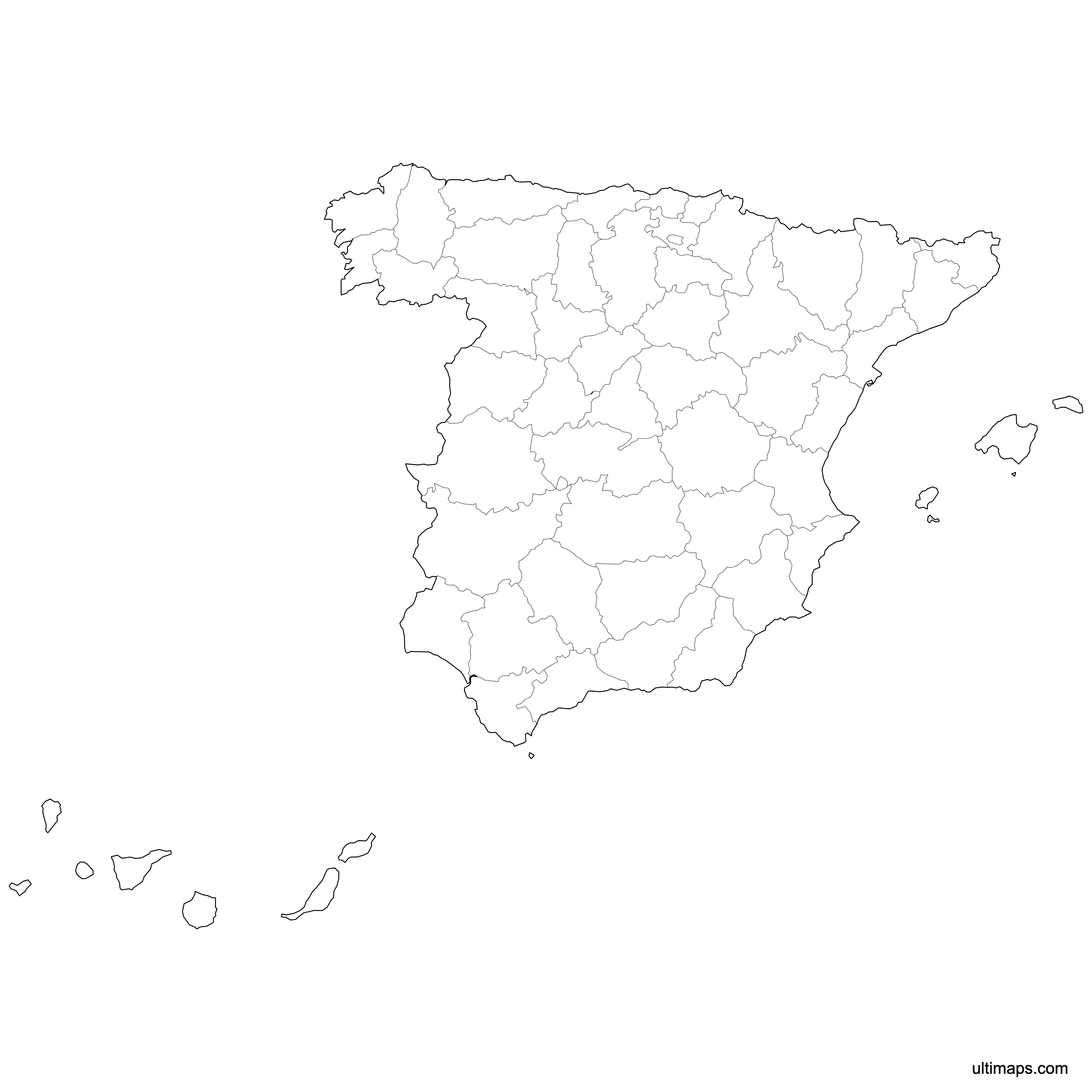 Download free blank Map of Spain Provinces in high-resolution PNG, PDF and SVG formats. Perfect for printing, coloring, presentations, and educational projects. Most of the maps available in different color schemes and with different features (such as labels, roads or rivers).
