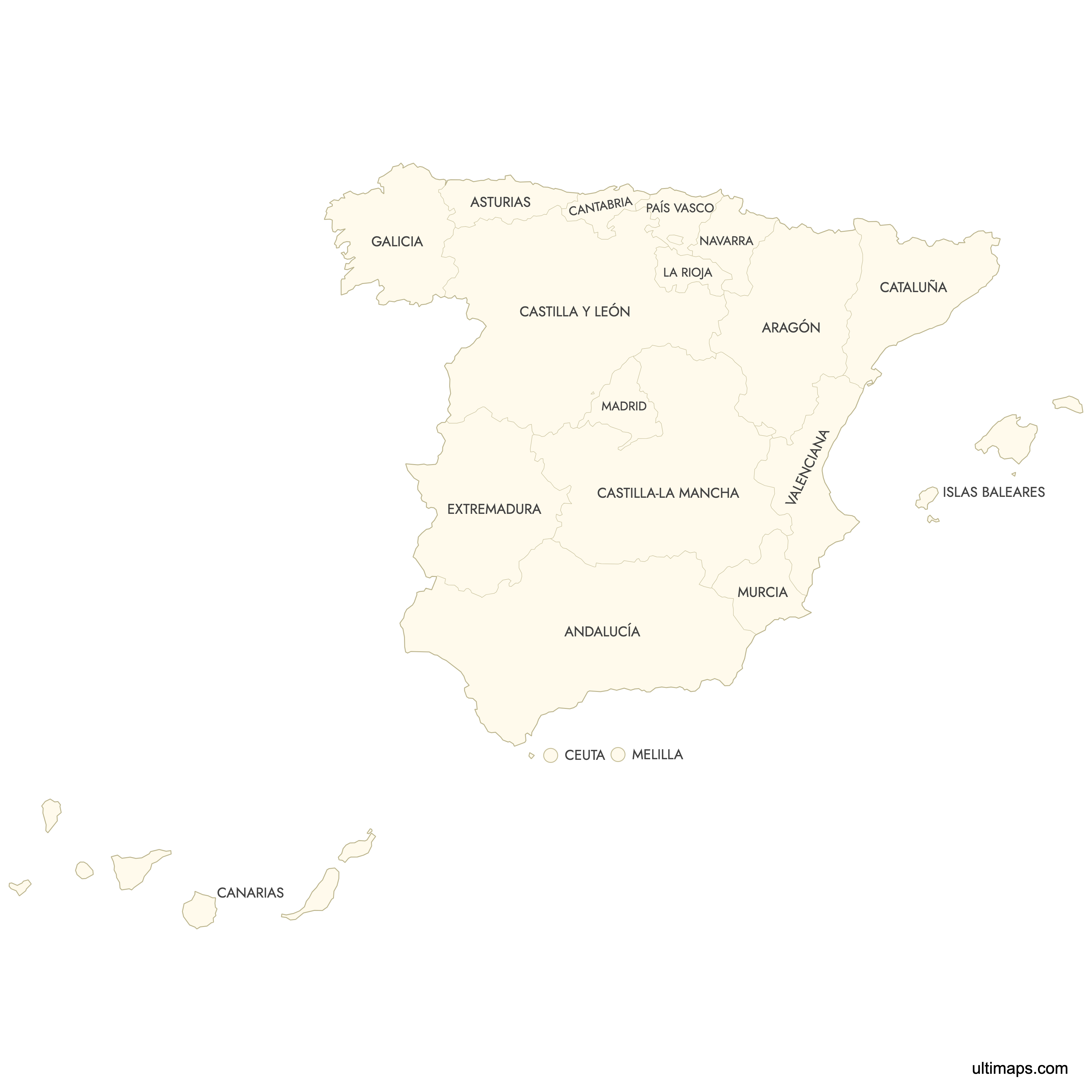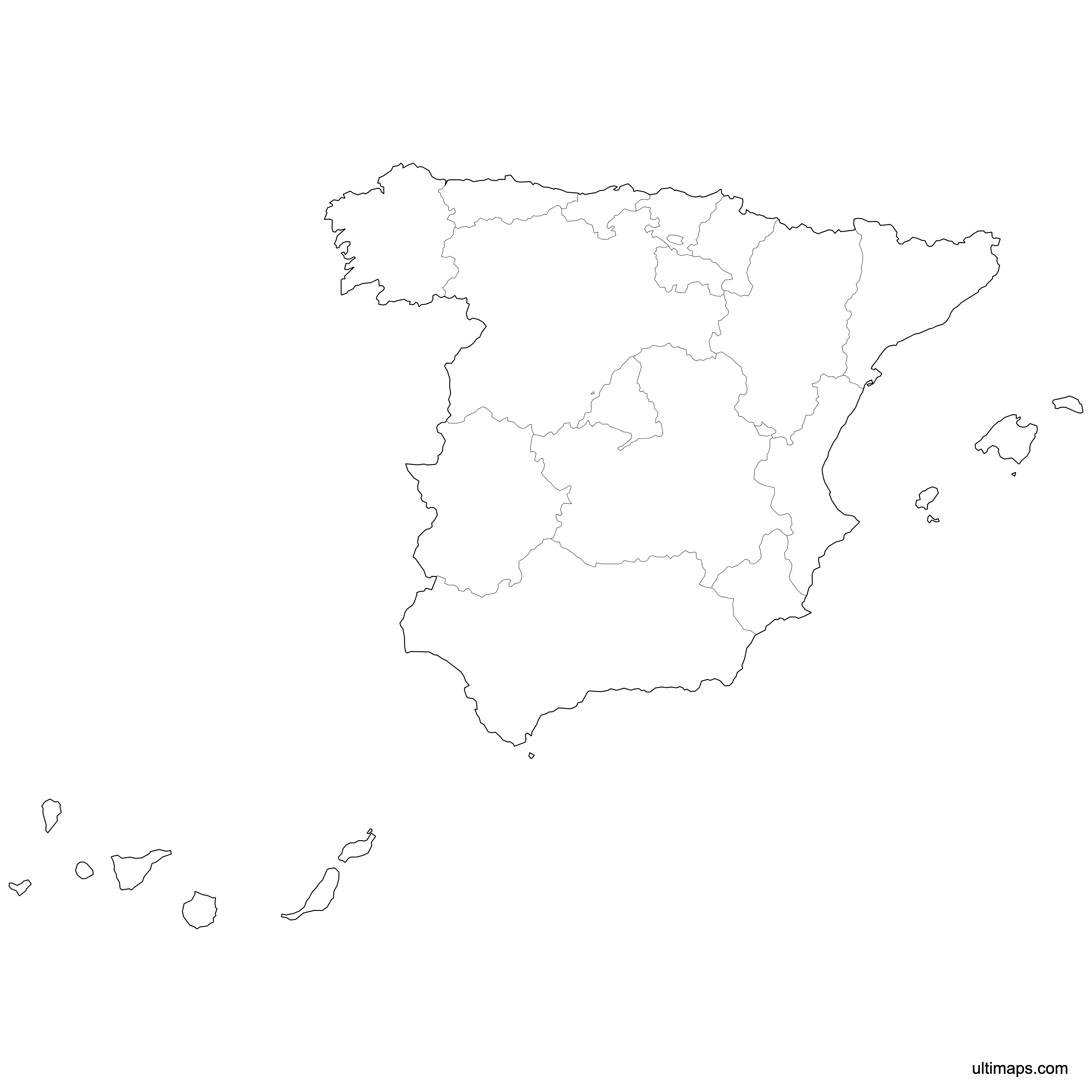 Download free blank Map of Spain Communities in high-resolution PNG, PDF and SVG formats. Perfect for printing, coloring, presentations, and educational projects. Most of the maps available in different color schemes and with different features (such as labels, roads or rivers).