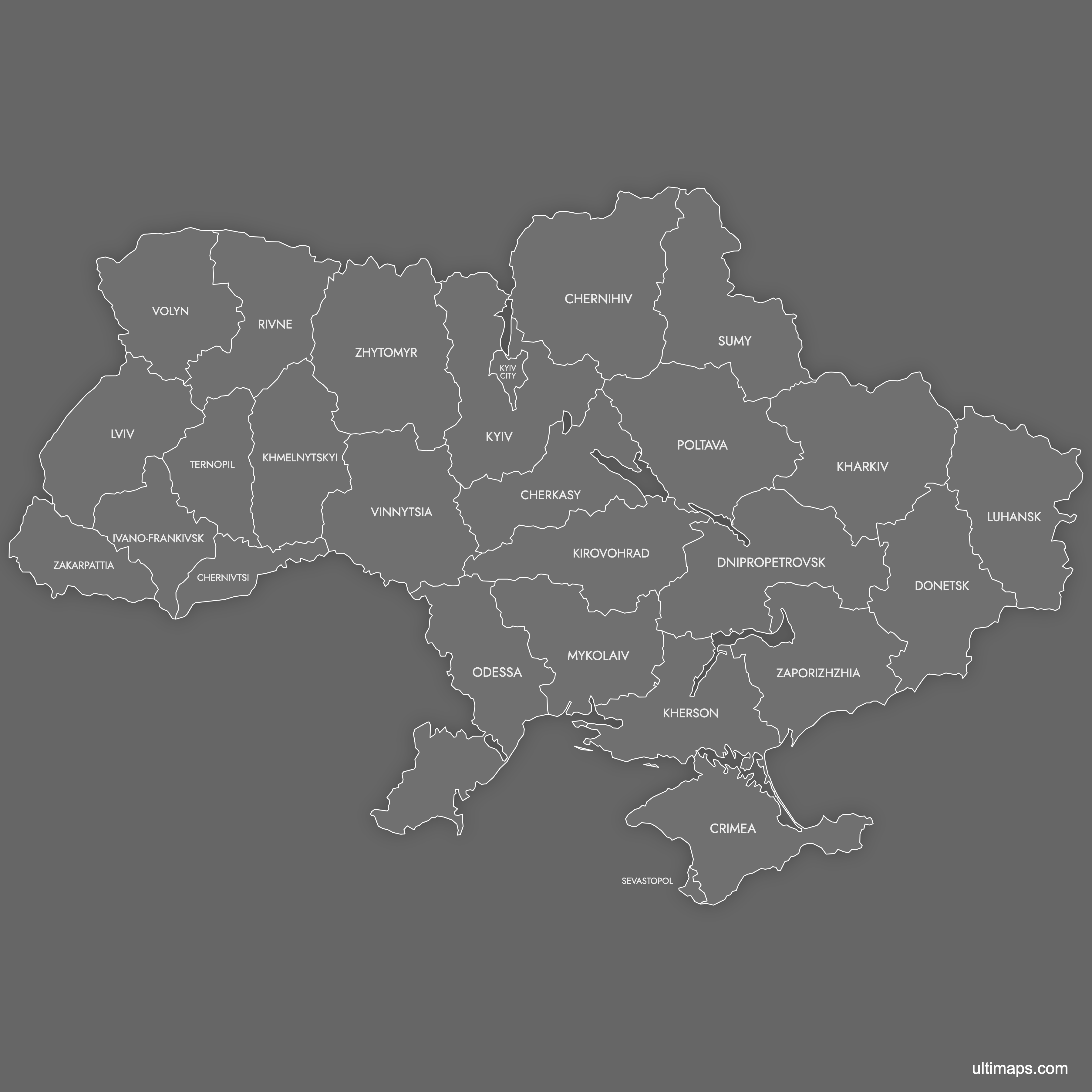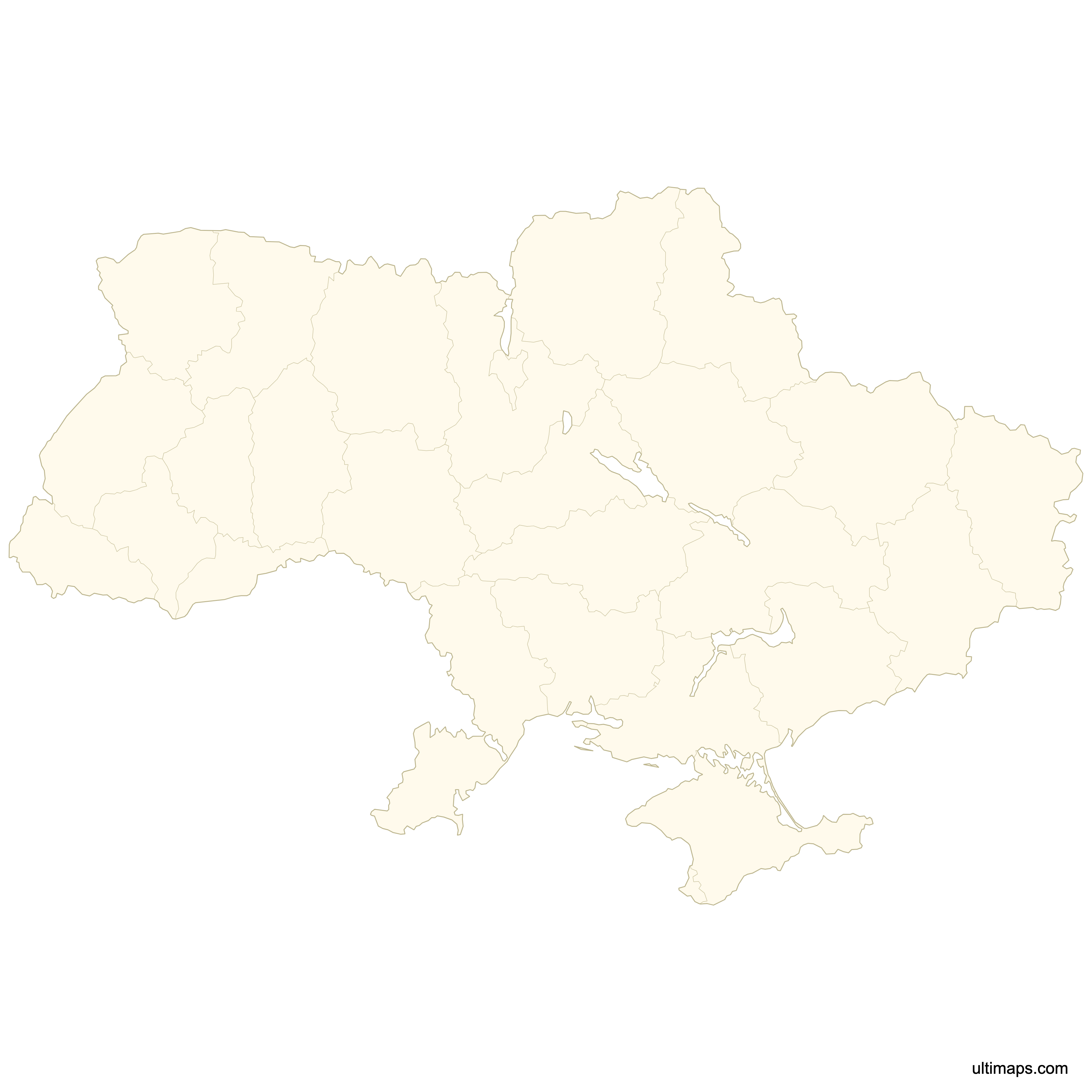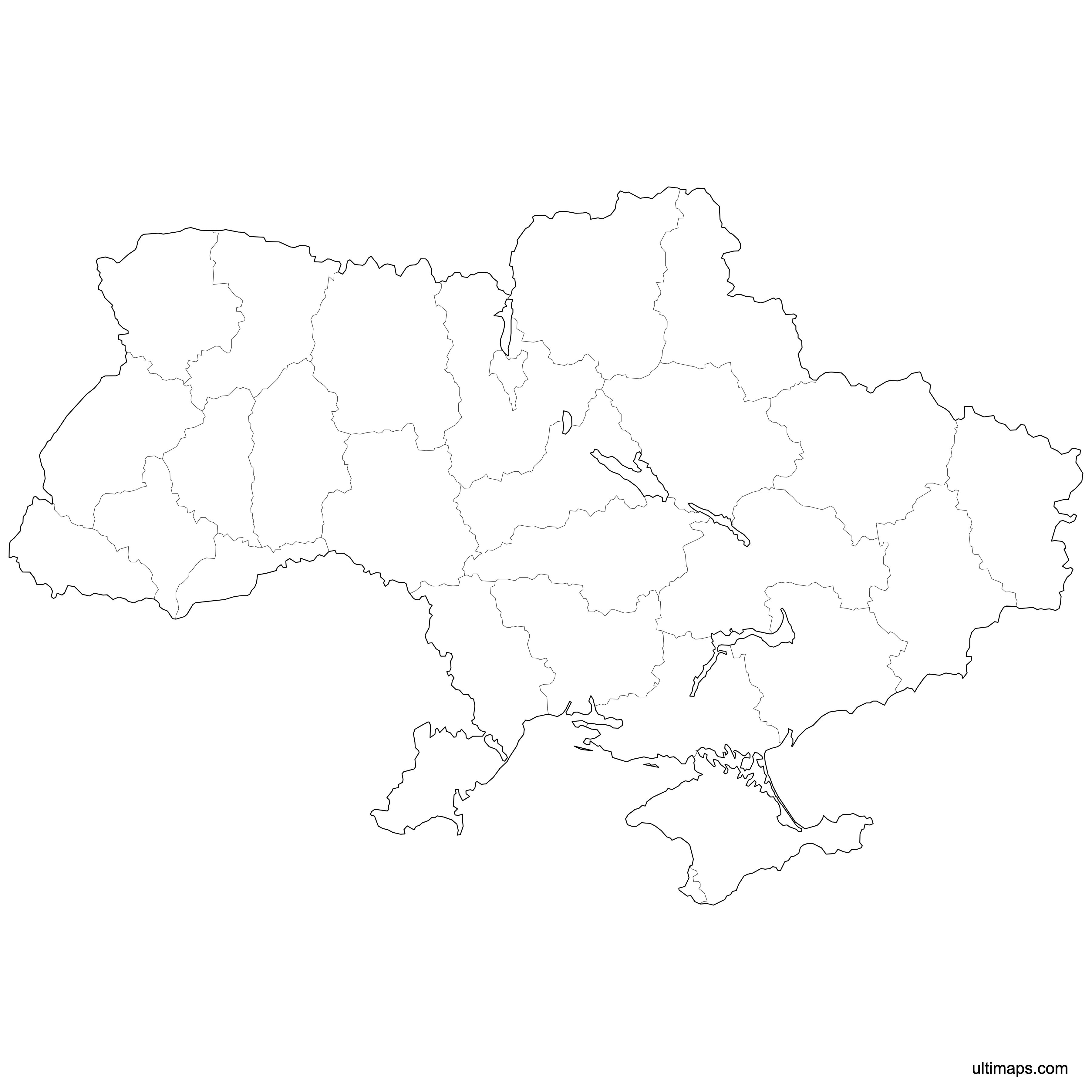 Download free blank Map of Ukraine Regions in high-resolution PNG, PDF and SVG formats. Available in blank, outline, and labeled versions - perfect for printing, coloring, presentations, and educational projects. All maps are editable in graphics software and can be customized further in Ultimaps Studio.