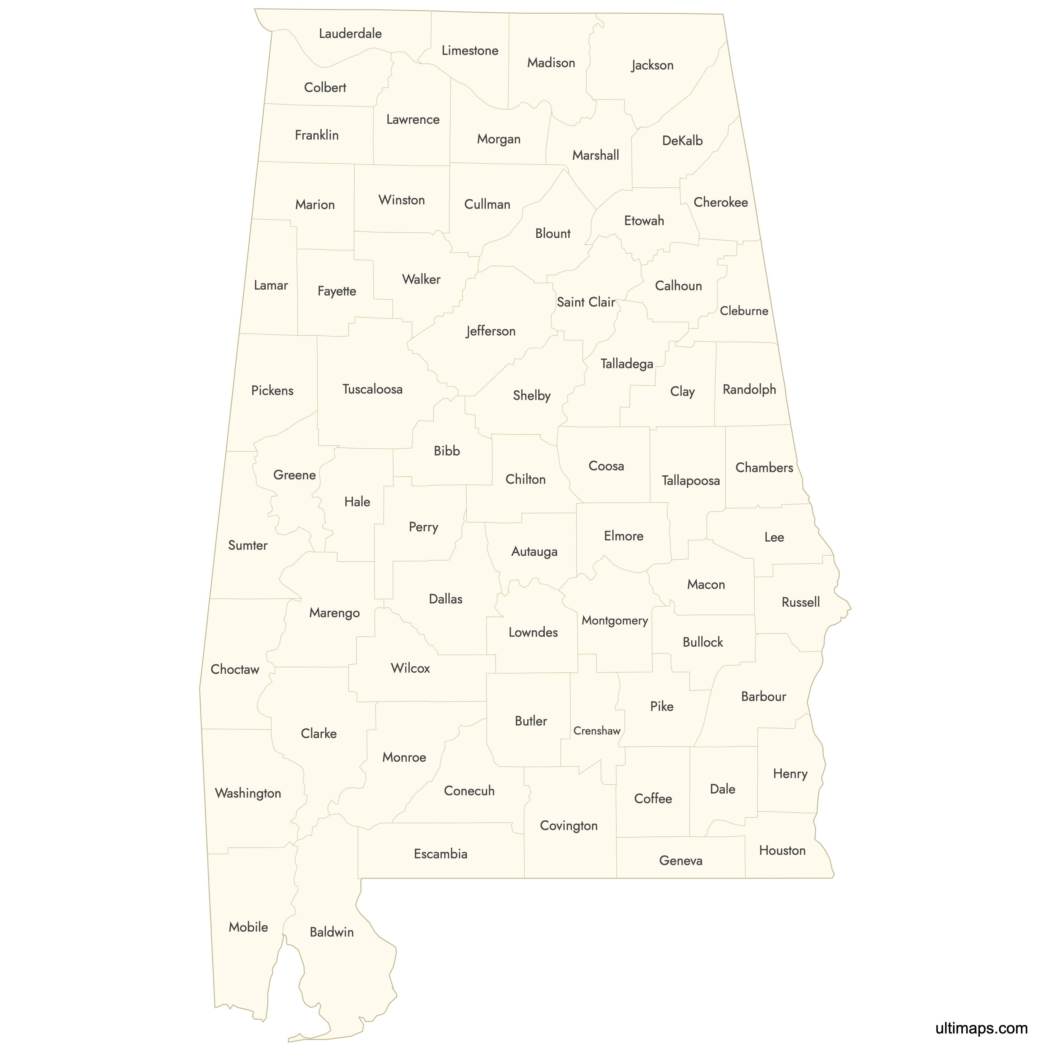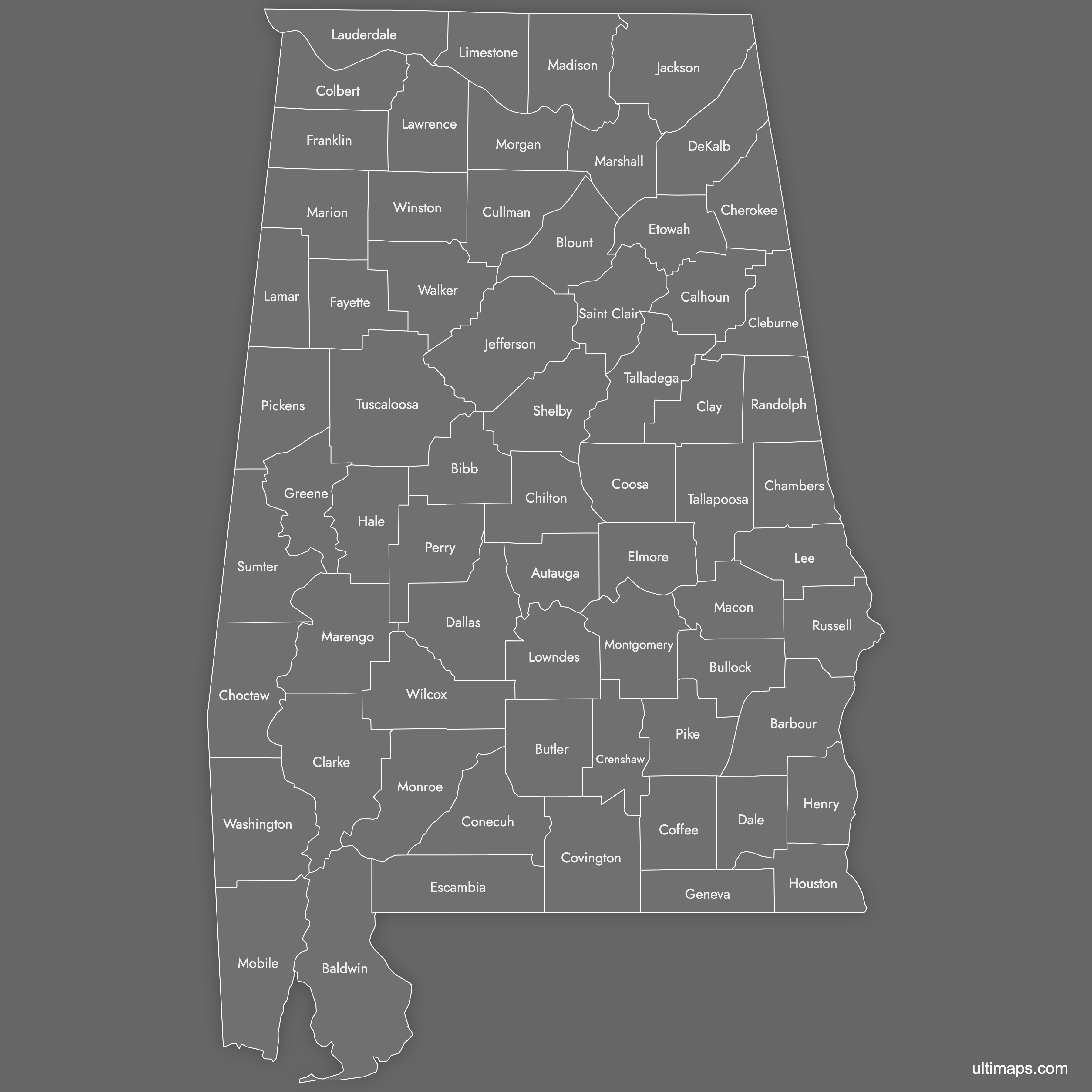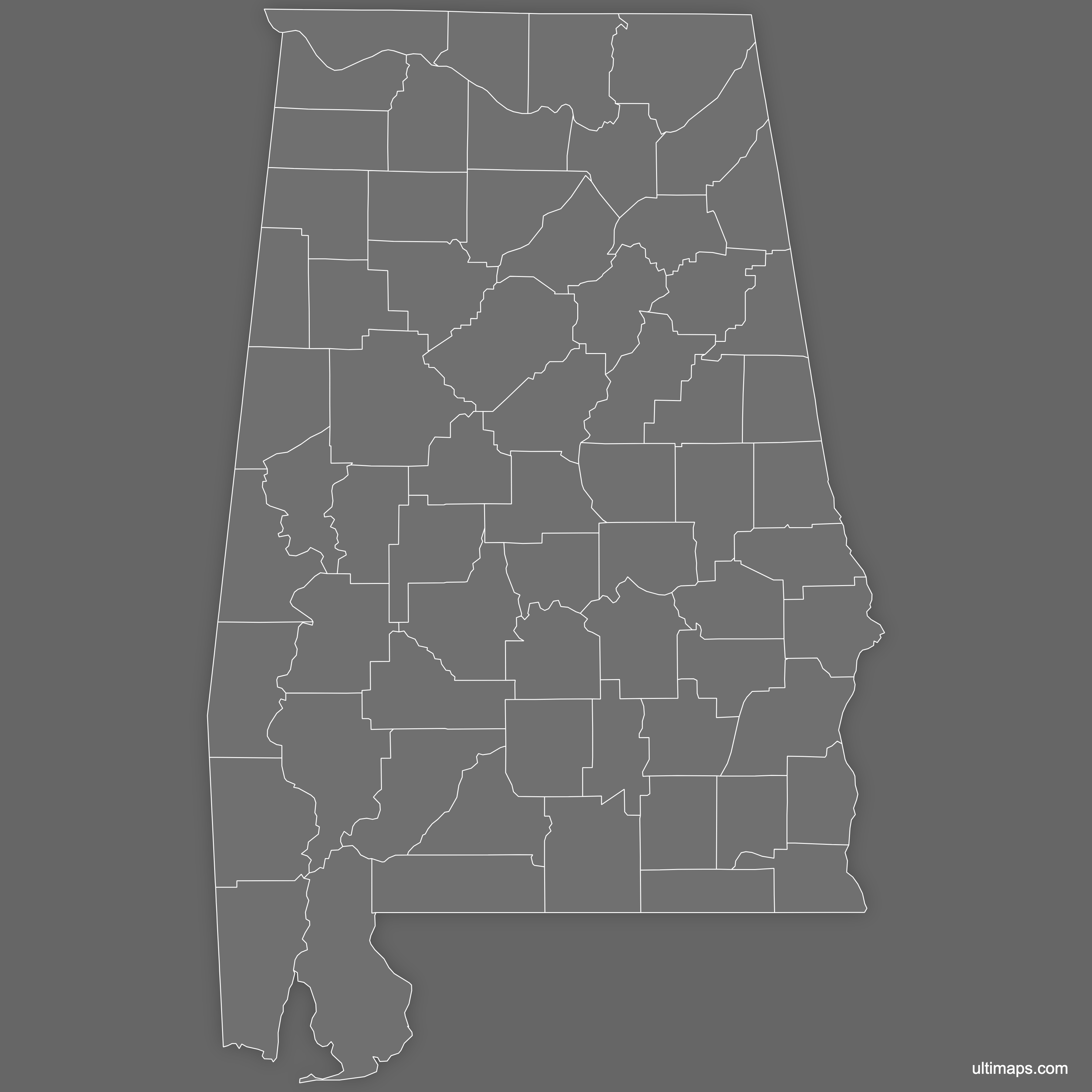 Download free blank Map of Alabama Counties in high-resolution PNG, PDF and SVG formats. Perfect for printing, coloring, presentations, and educational projects. Most of the maps available in different color schemes and with different features (such as labels, roads or rivers).