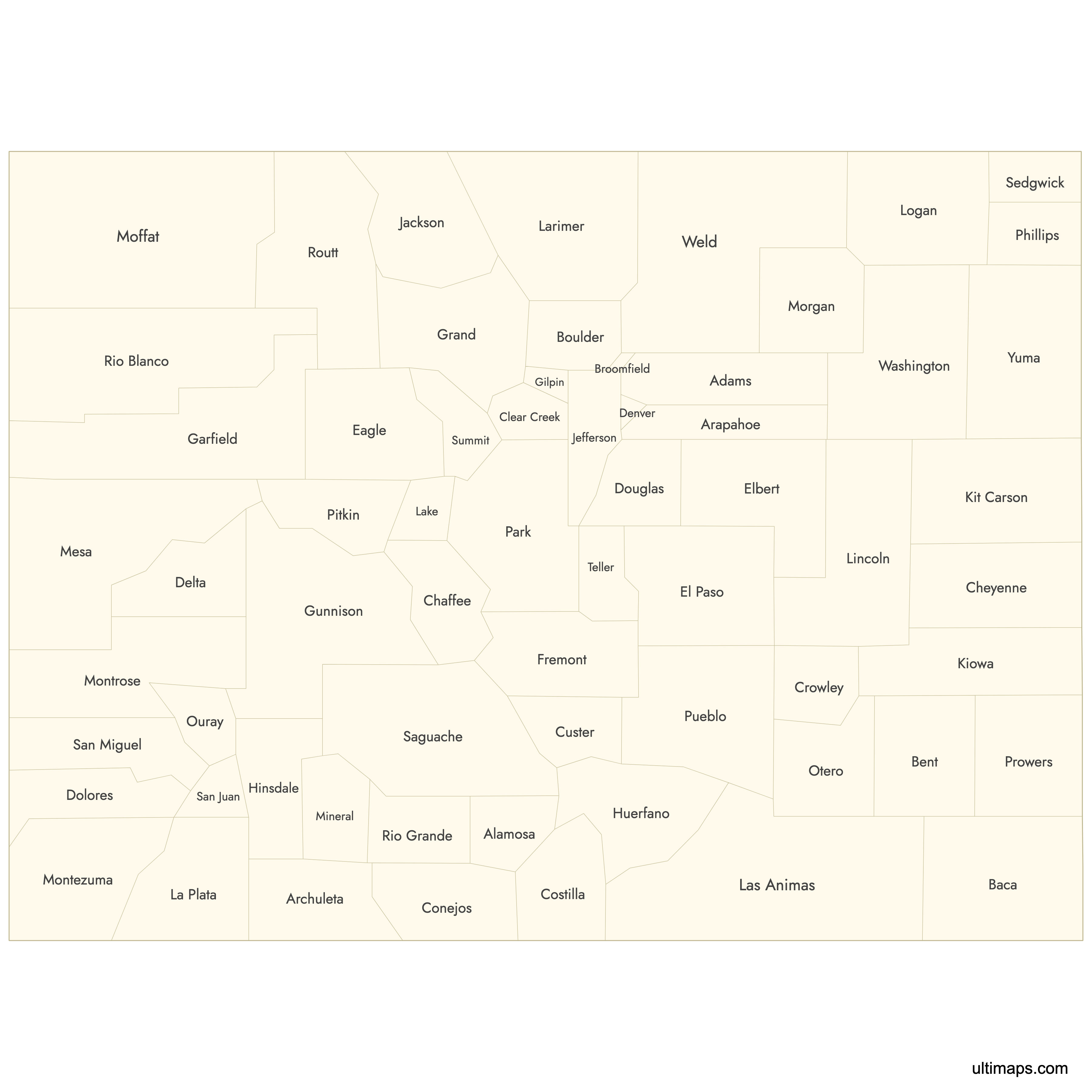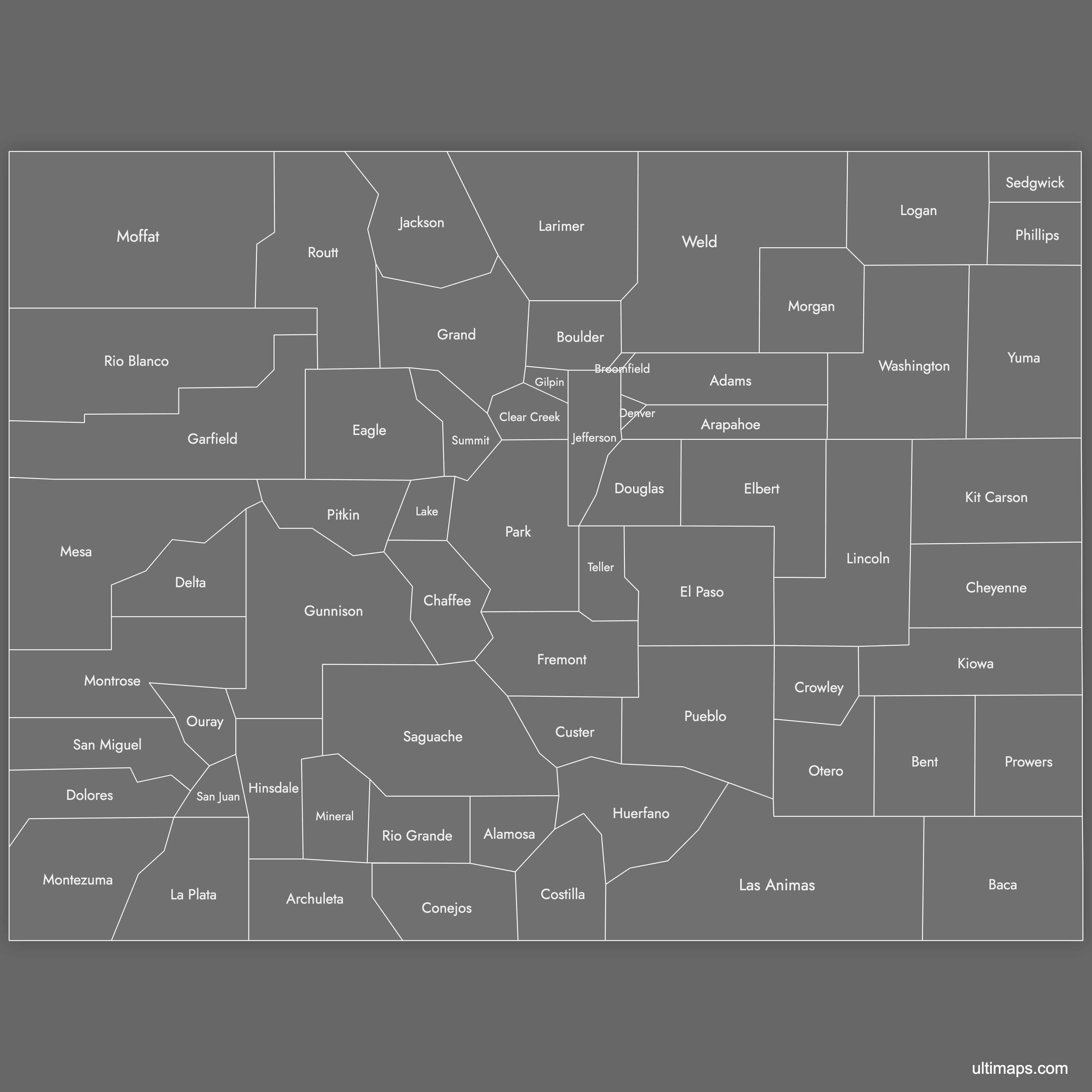 Download free blank Map of Colorado Counties in high-resolution PNG, PDF and SVG formats. Perfect for printing, coloring, presentations, and educational projects. Most of the maps available in different color schemes and with different features (such as labels, roads or rivers).