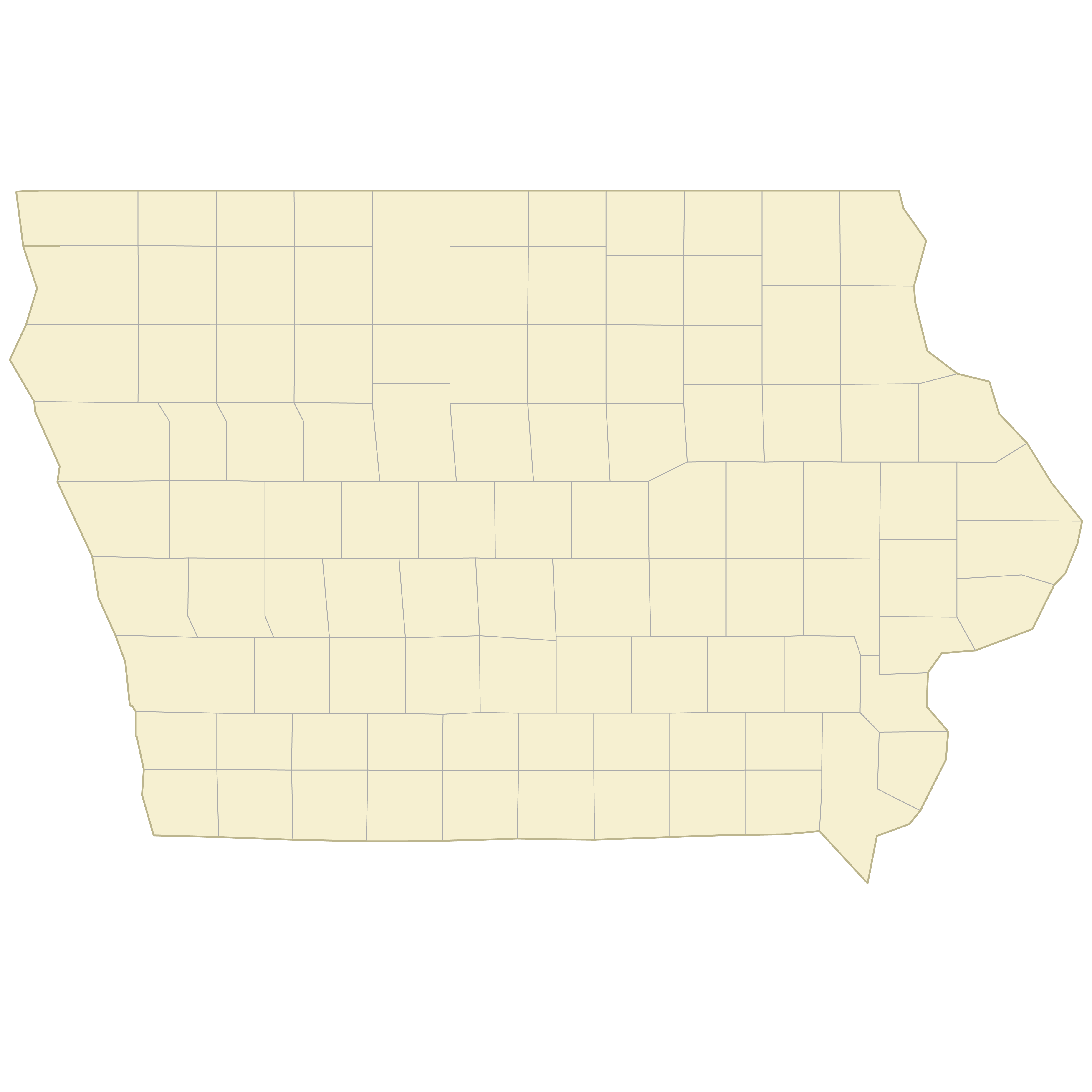 Below you can download free blank Map of Iowa Counties in high resolution PNG or SVG formats suitable for printing or further editing. Most of the maps available in different color schemes and with different features (such as labels, roads or rivers). PNG maps are in 3600x3600px resolution and come with a transparent background.