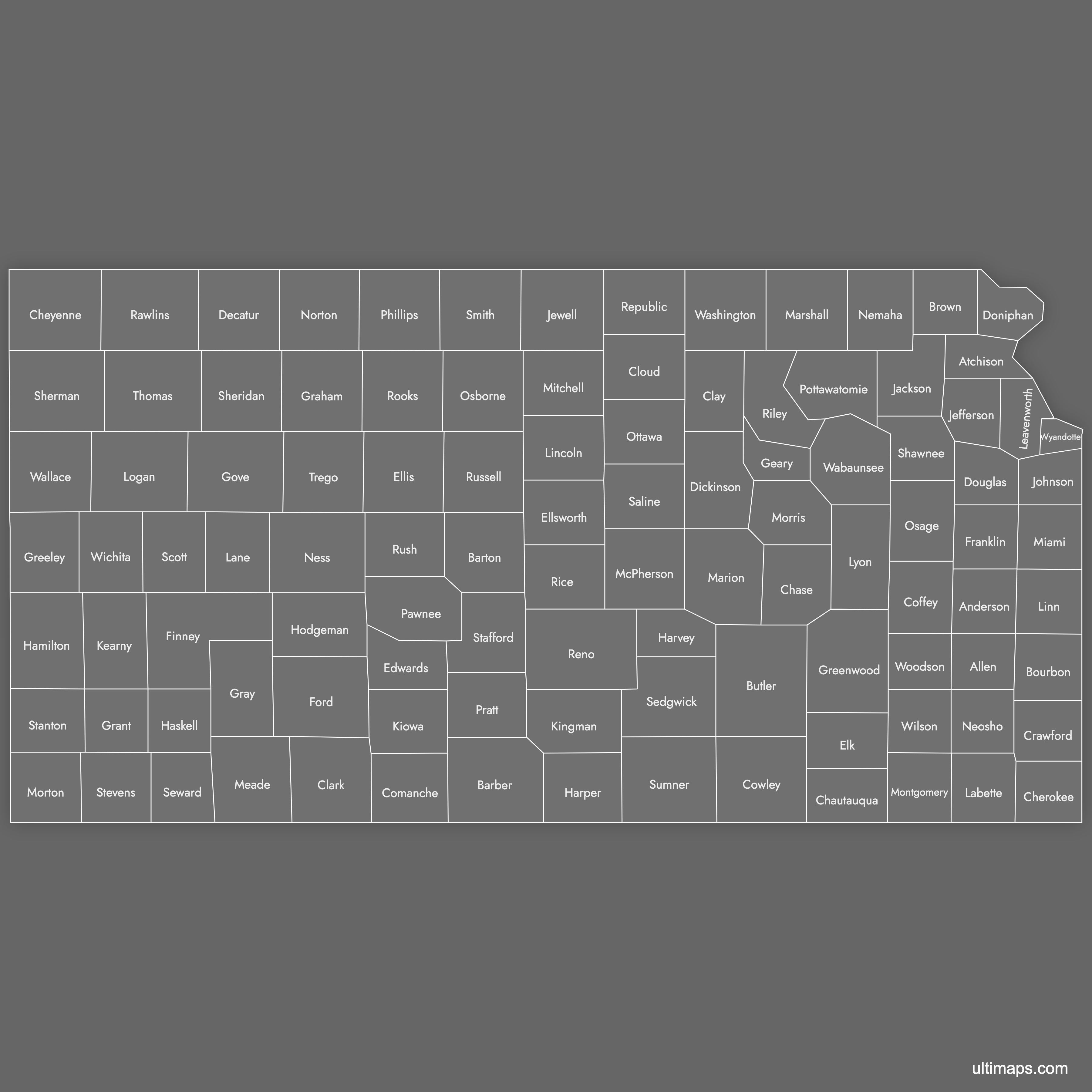 Download free blank Map of Kansas Counties in high-resolution PNG, PDF and SVG formats. Perfect for printing, coloring, presentations, and educational projects. Most of the maps available in different color schemes and with different features (such as labels, roads or rivers).