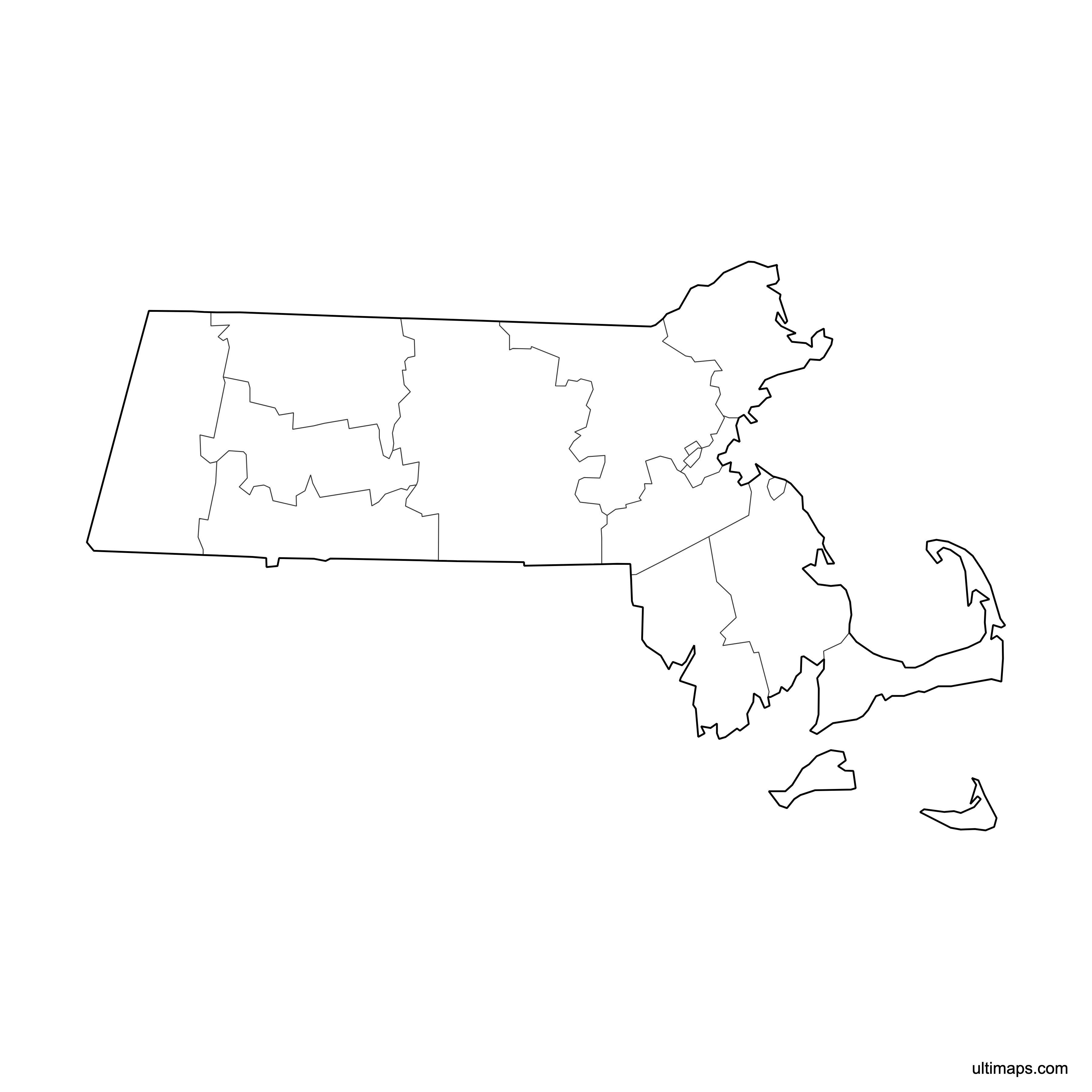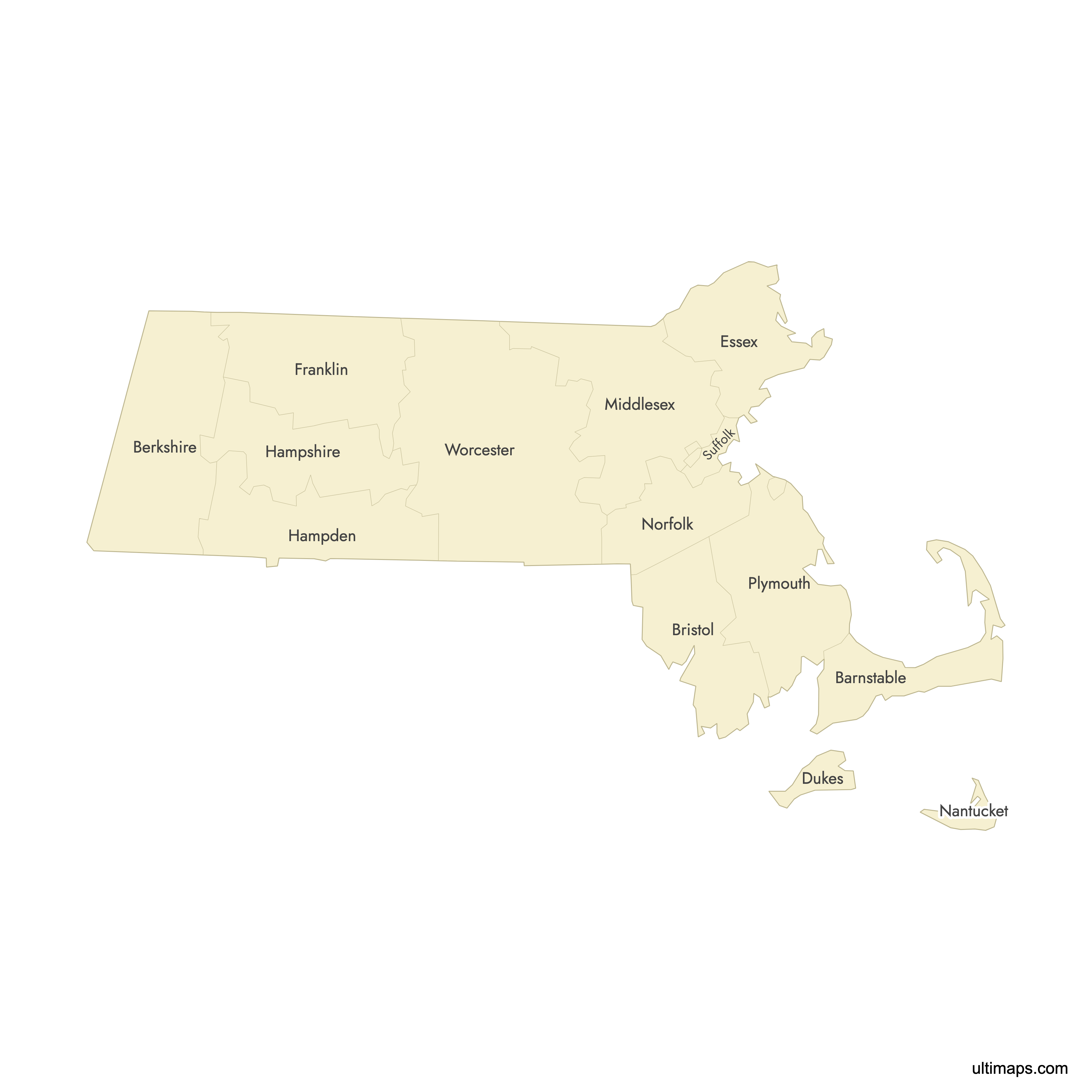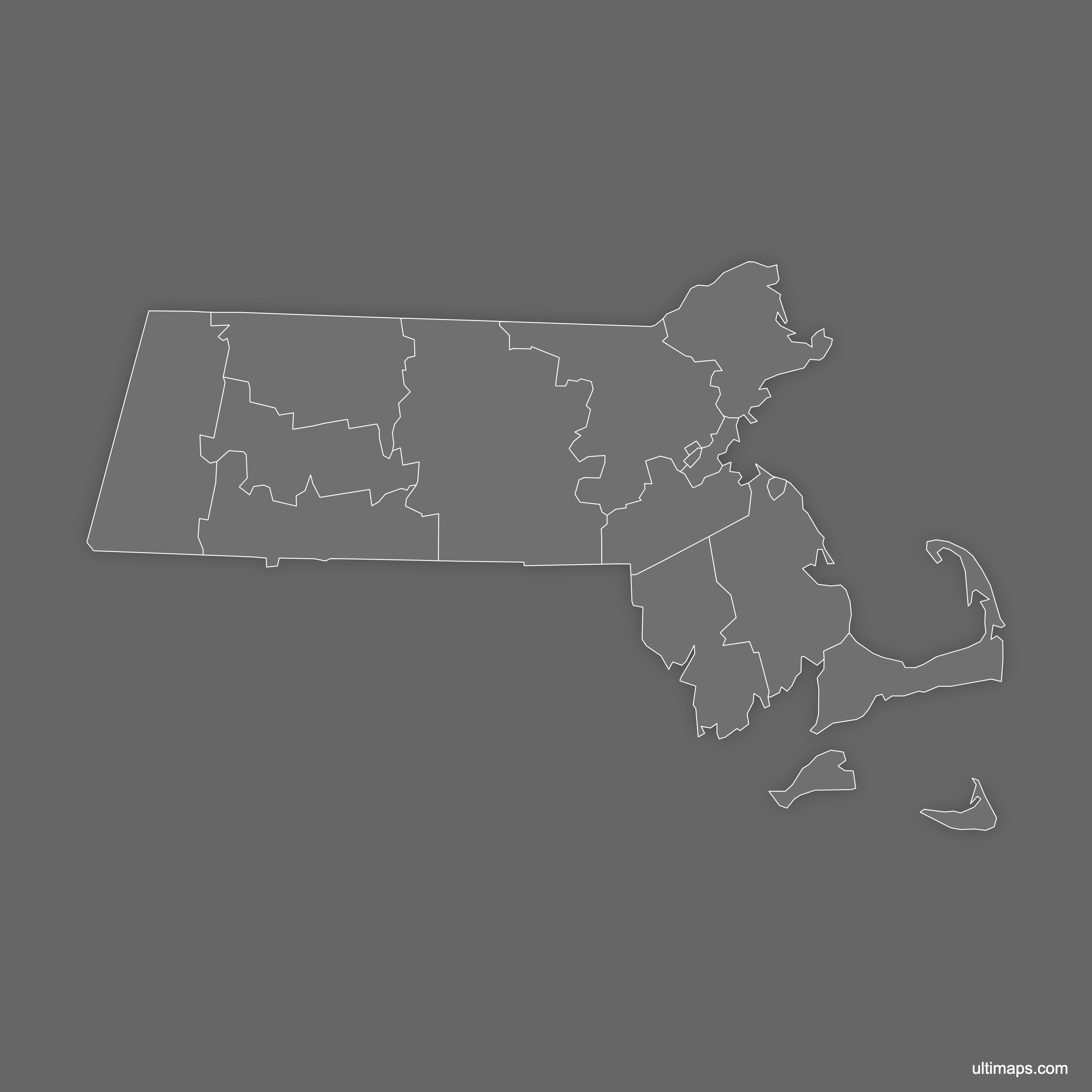 Below you can download free blank Map of Massachusetts Counties in high resolution PNG or SVG formats suitable for printing or further editing. Most of the maps available in different color schemes and with different features (such as labels, roads or rivers). PNG maps are in 3600x3600px resolution and come with a transparent background.