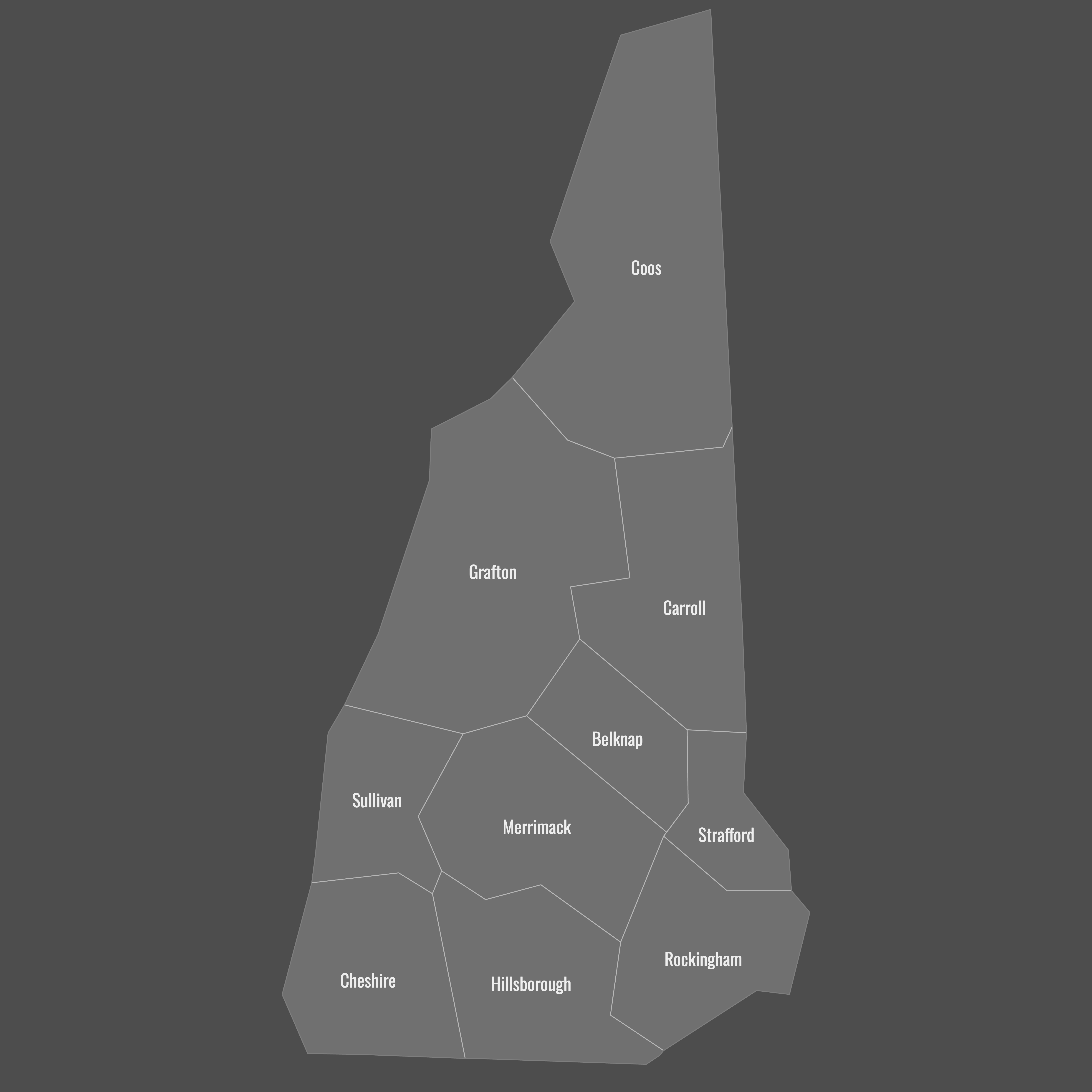 Below you can download free blank Map of New Hampshire Counties in high resolution PNG or SVG formats suitable for printing or further editing. Most of the maps available in different color schemes and with different features (such as labels, roads or rivers). PNG maps are in 3600x3600px resolution and come with a transparent background.