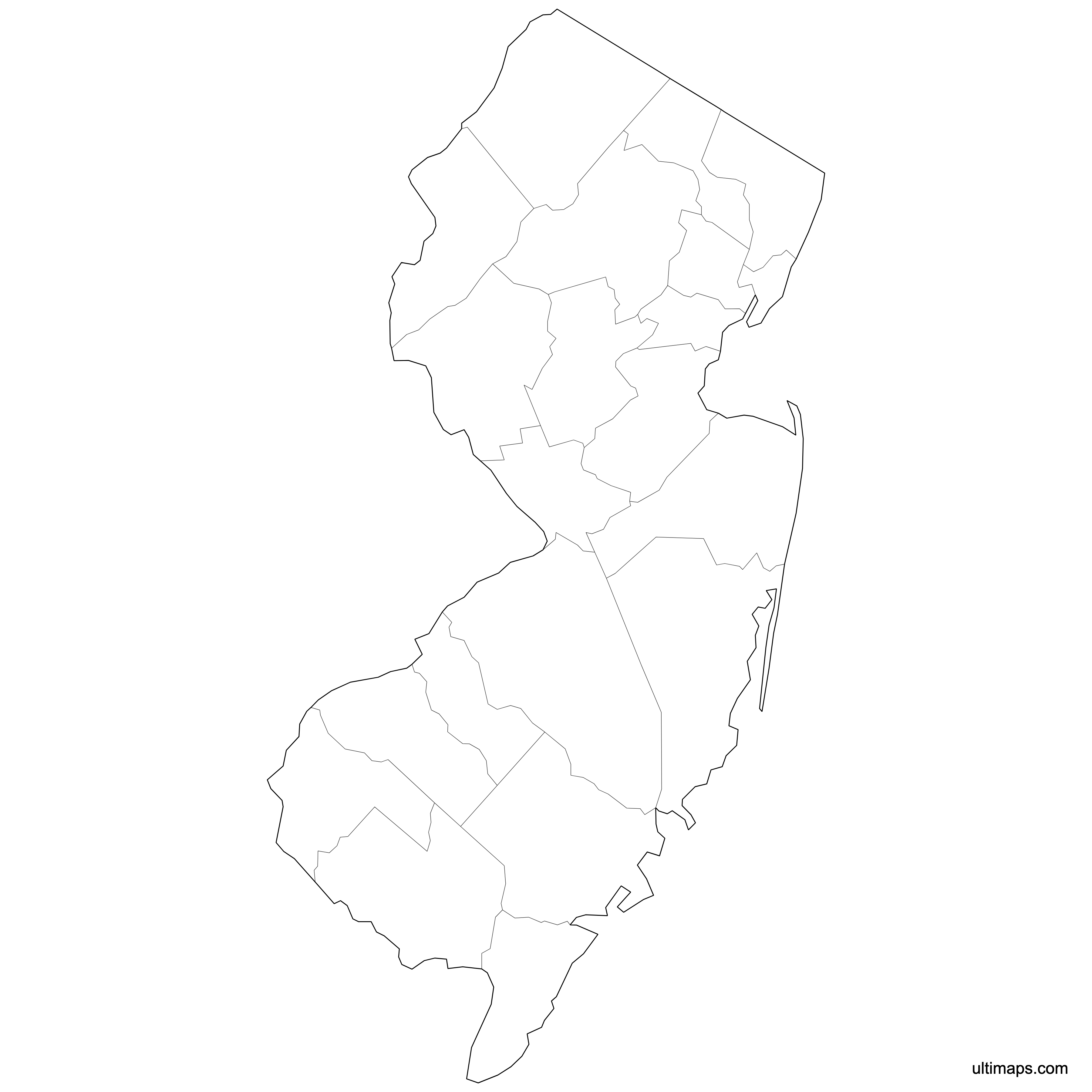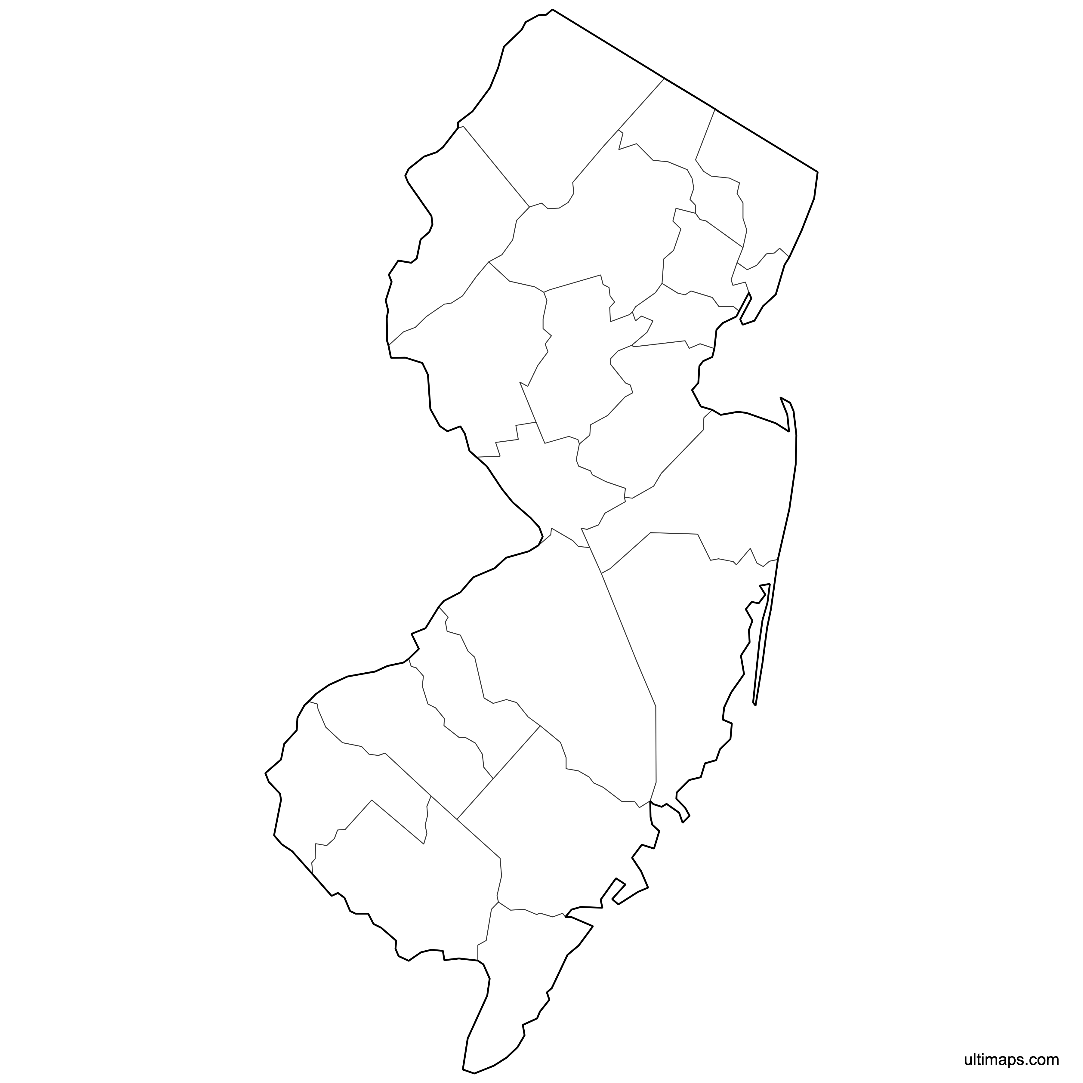 Below you can download free blank Map of New Jersey Counties in high resolution PNG or SVG formats suitable for printing or further editing. Most of the maps available in different color schemes and with different features (such as labels, roads or rivers). PNG maps are in 3600x3600px resolution and come with a transparent background.