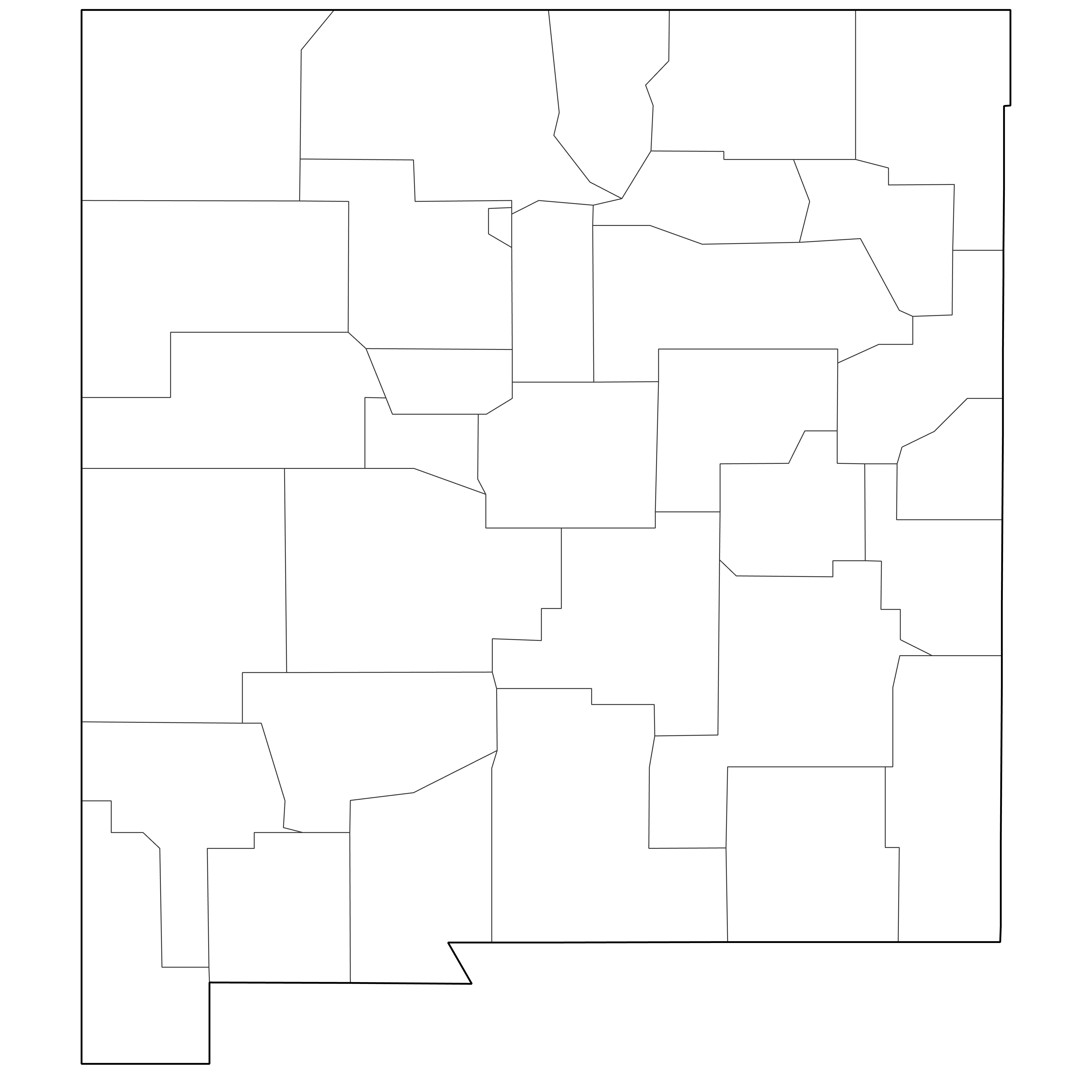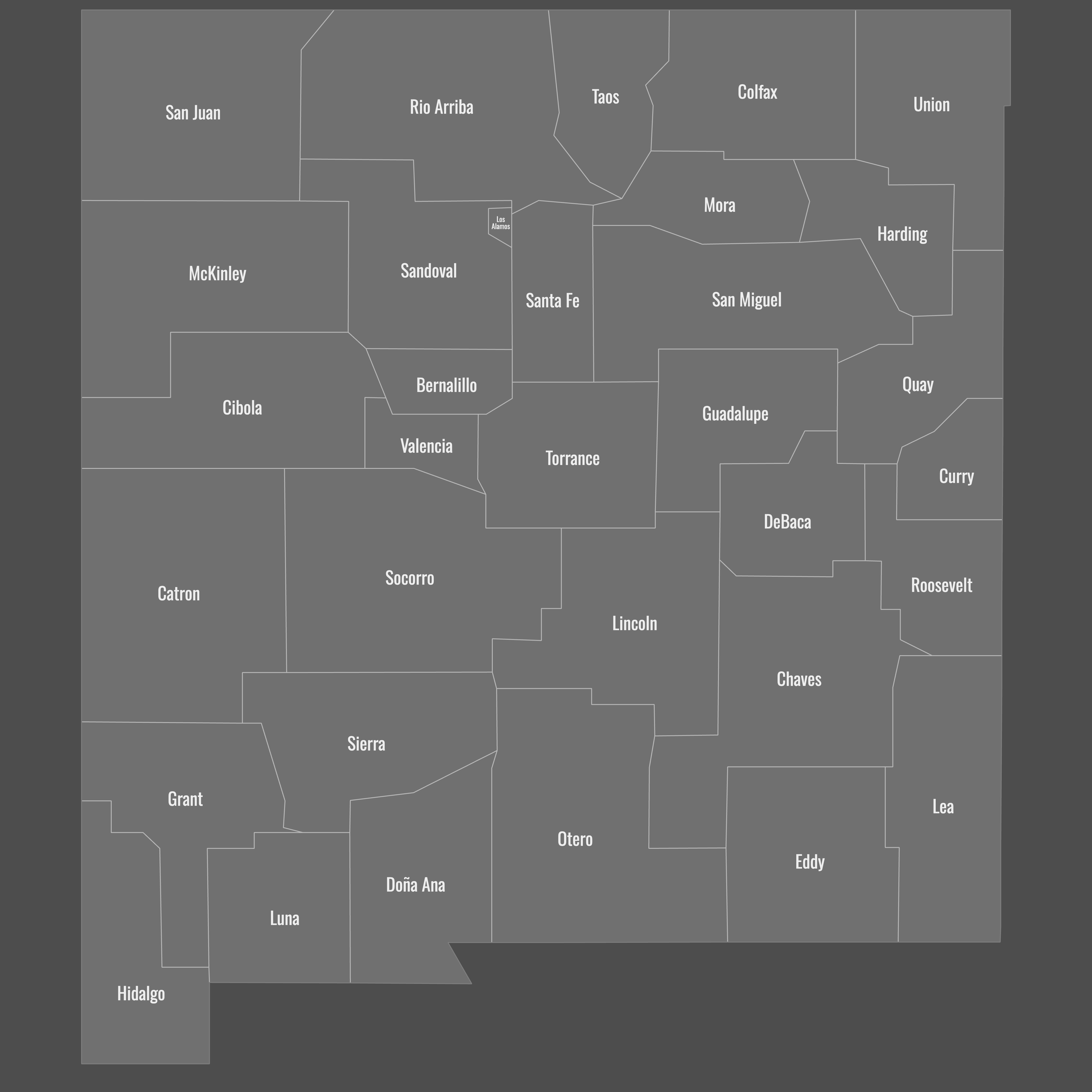 Below you can download free blank Map of New Mexico Counties in high resolution PNG or SVG formats suitable for printing or further editing. Most of the maps available in different color schemes and with different features (such as labels, roads or rivers). PNG maps are in 3600x3600px resolution and come with a transparent background.