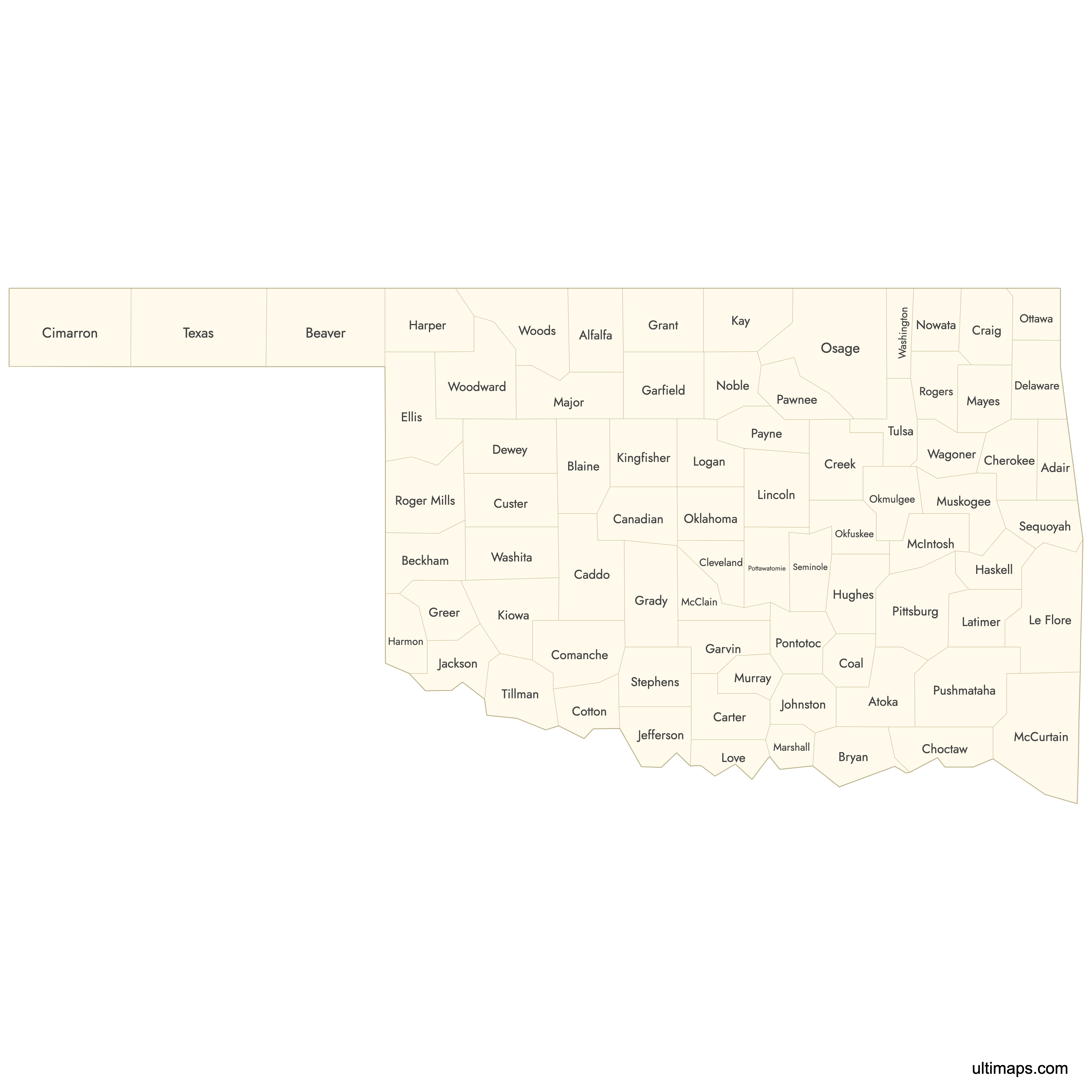 Download free blank Map of Oklahoma Counties in high-resolution PNG, PDF and SVG formats. Perfect for printing, coloring, presentations, and educational projects. Most of the maps available in different color schemes and with different features (such as labels, roads or rivers).