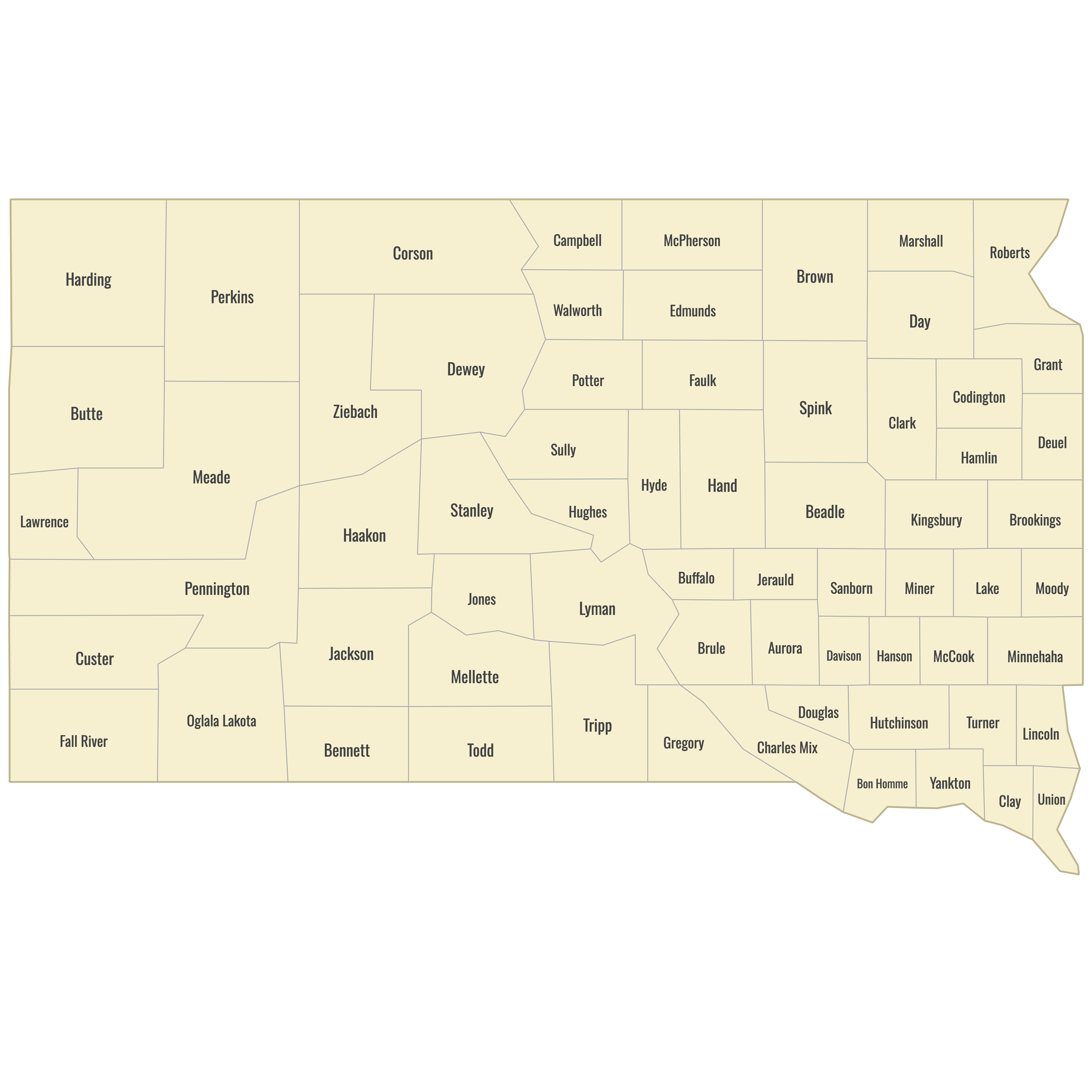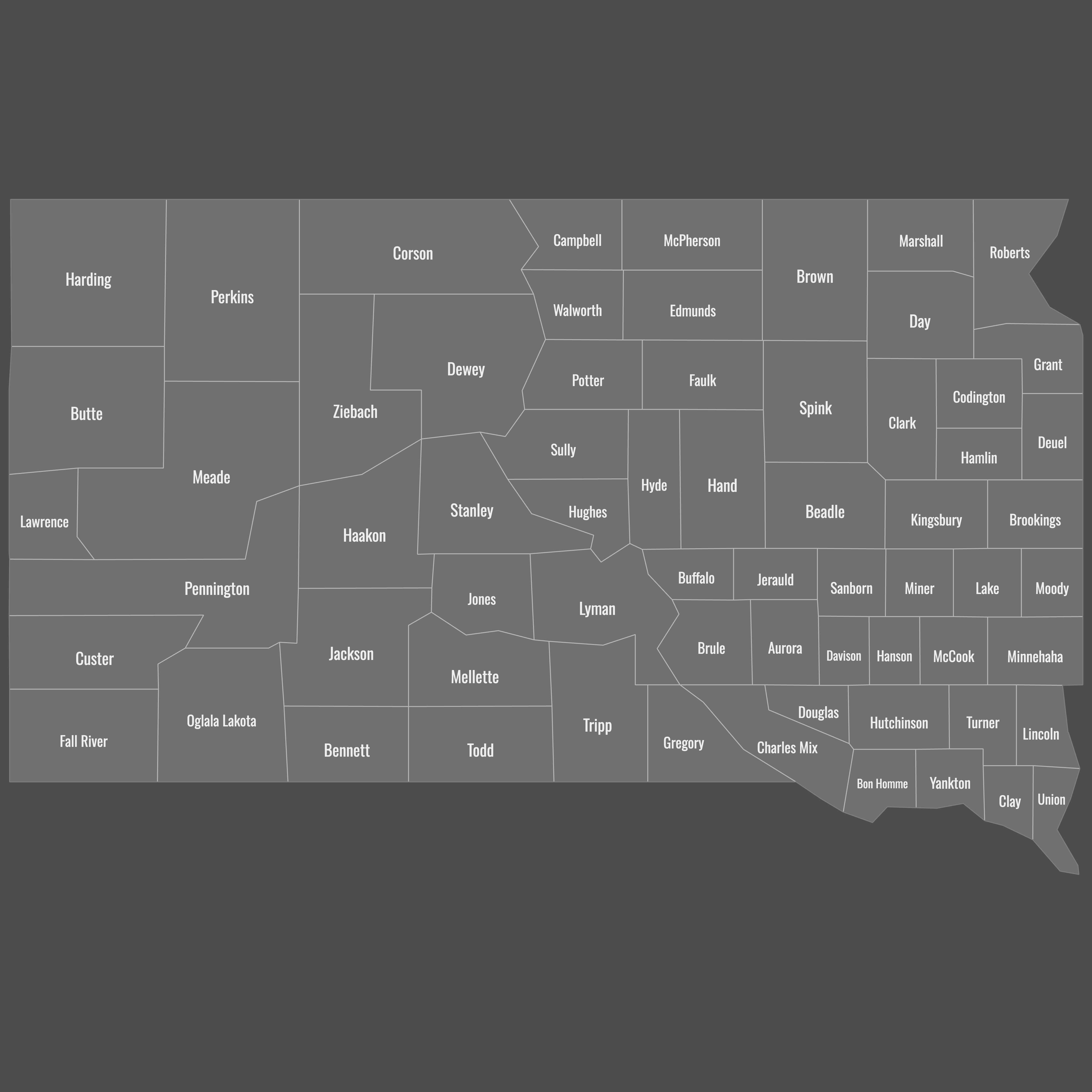 Below you can download free blank Map of South Dakota Counties in high resolution PNG or SVG formats suitable for printing or further editing. Most of the maps available in different color schemes and with different features (such as labels, roads or rivers). PNG maps are in 3600x3600px resolution and come with a transparent background.