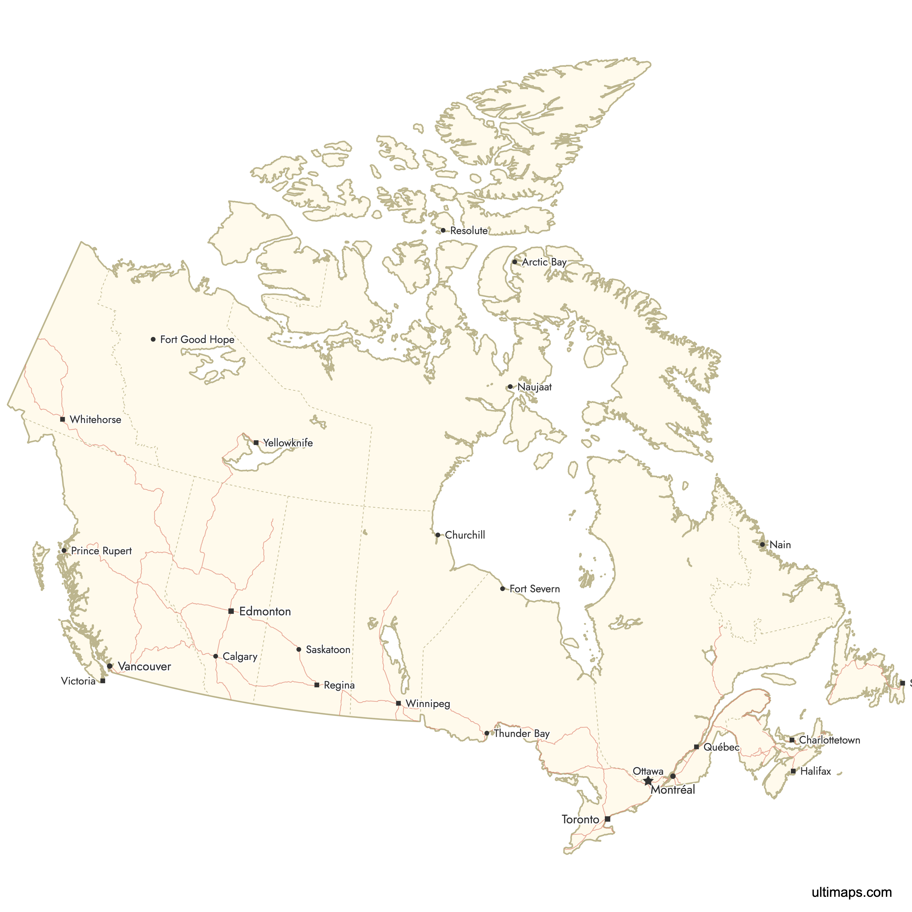 You can use Ultimaps to create custom maps of Canada. Color-code provinces manually or upload your data, place pins, customize the look and feel, and export to PNG, PDF, or SVG. No sign-up required.