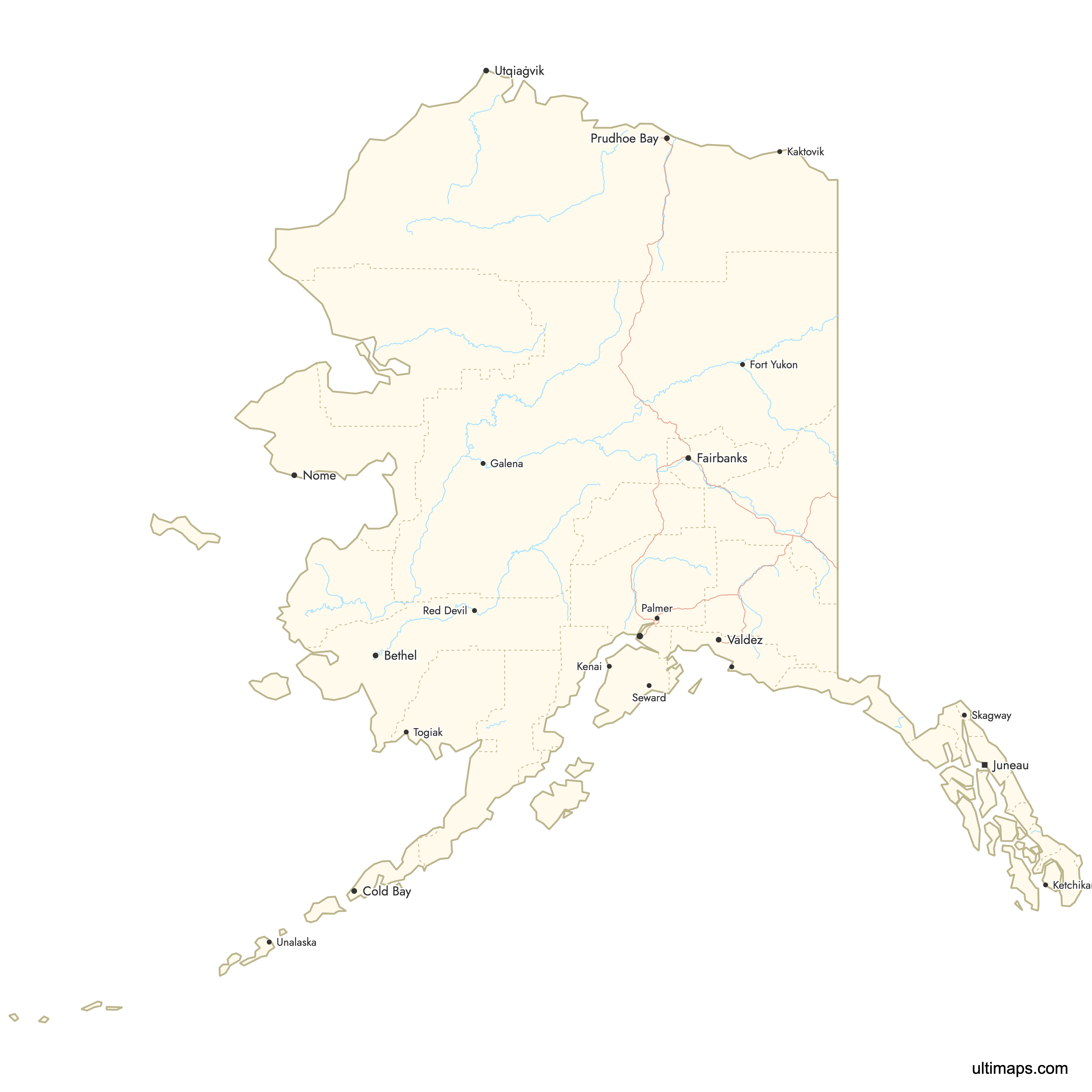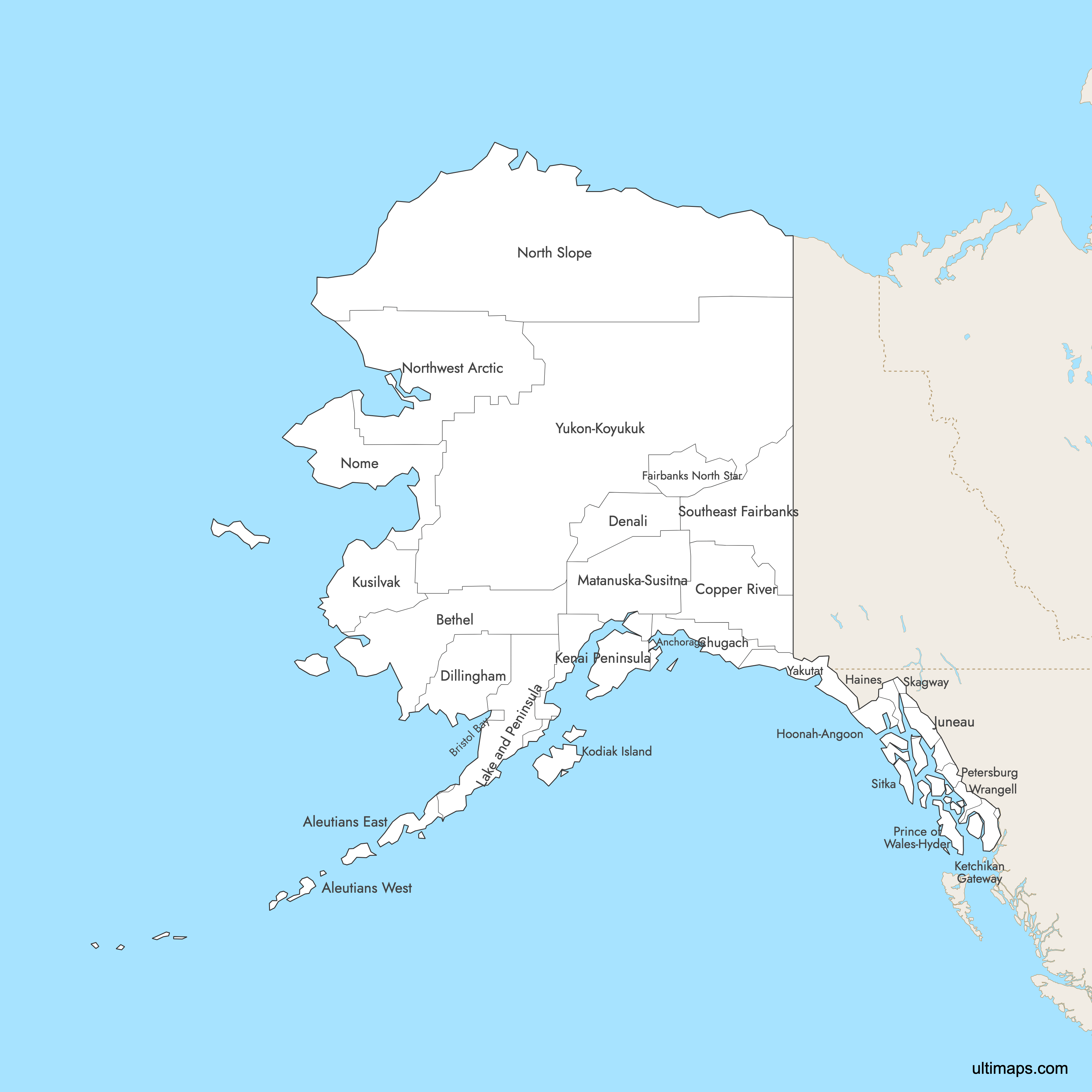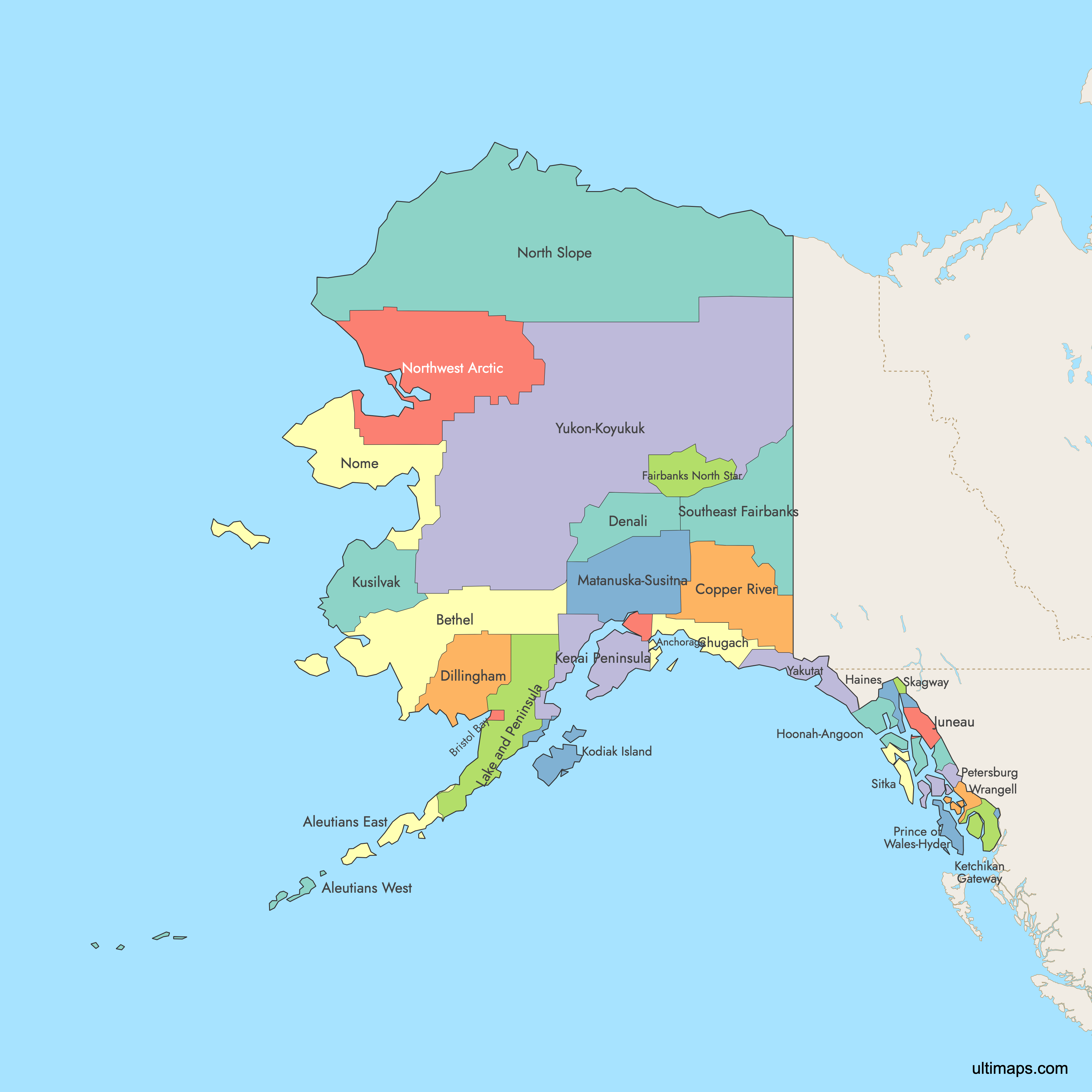 You can use Ultimaps to create custom maps of Alaska. Color-code boroughs manually or upload your data, place pins, customize the look and feel, and export to PNG, PDF, or SVG. No sign-up required.