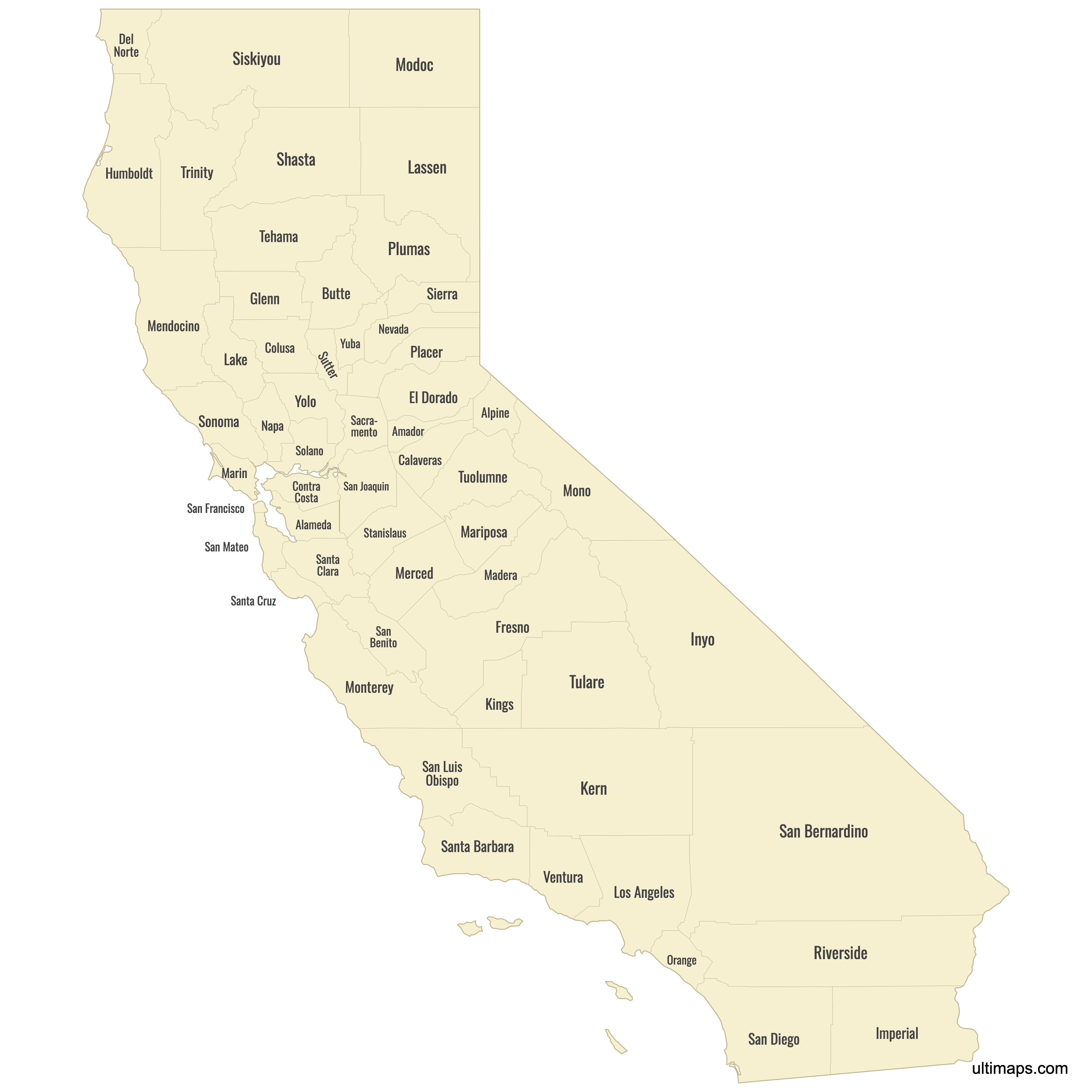 Below you can download free printable Map of California Counties in high resolution PNG or SVG formats.