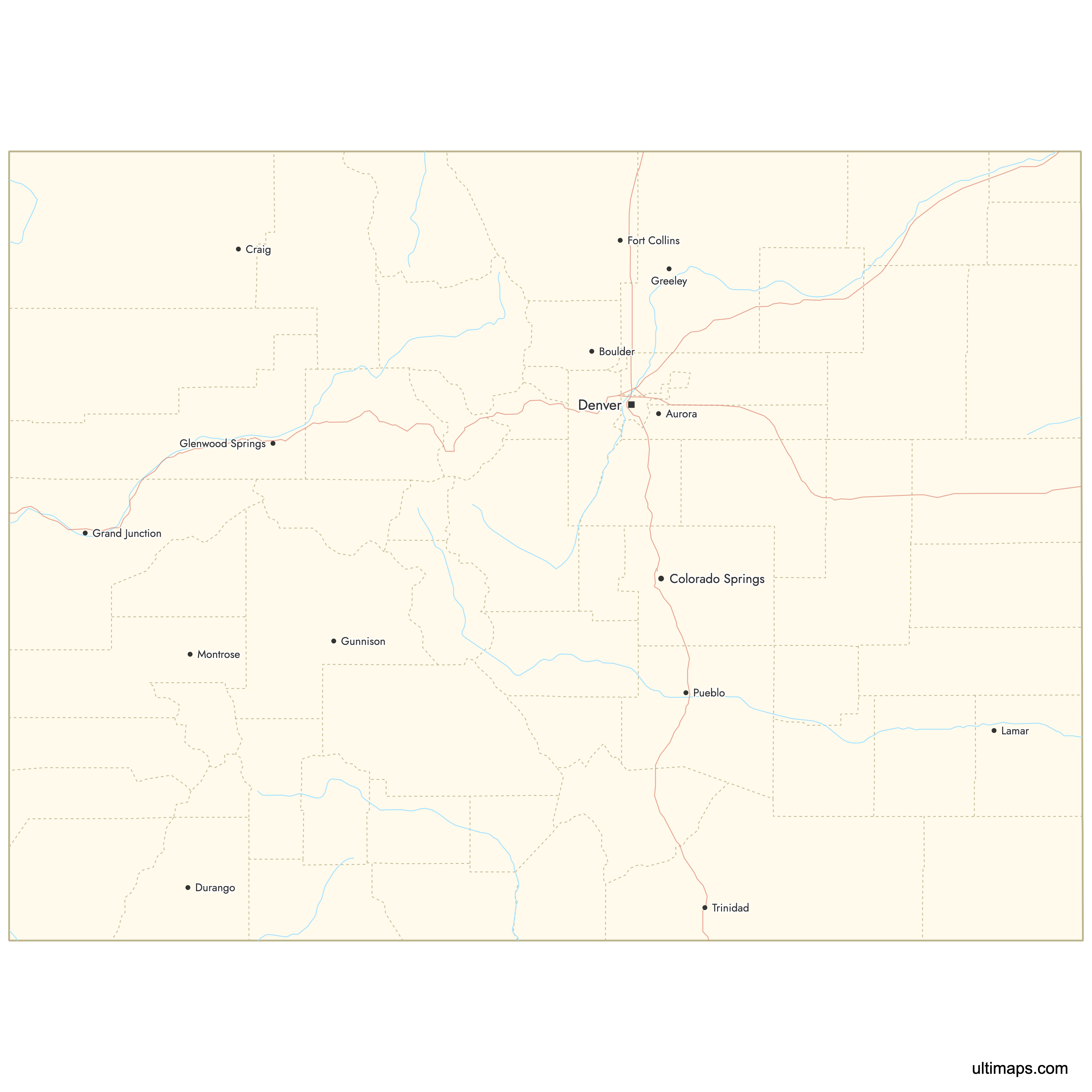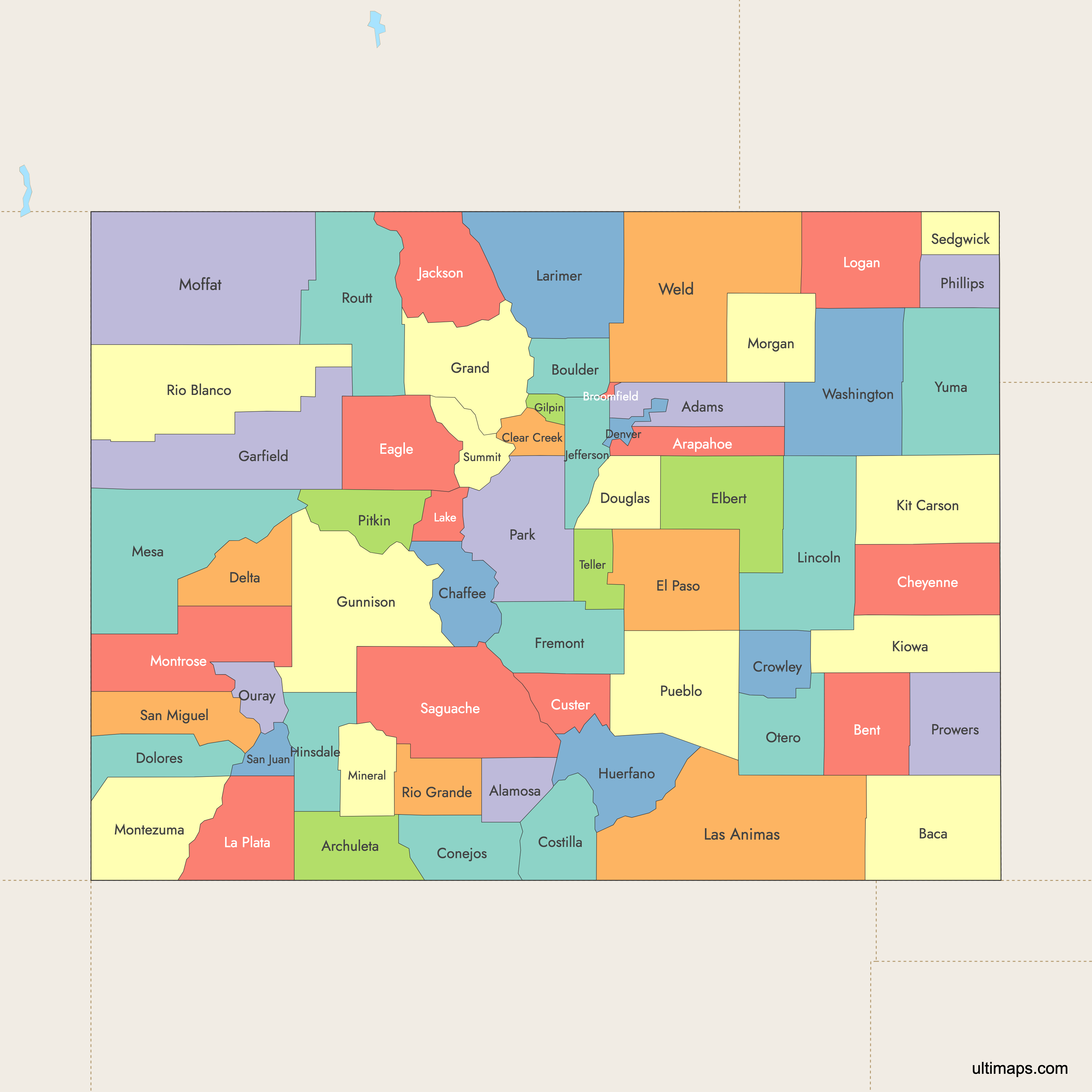 You can use Ultimaps to create custom maps of Colorado. Color-code counties manually or upload your data, place pins, customize the look and feel, and export to PNG, PDF, or SVG. No sign-up required.