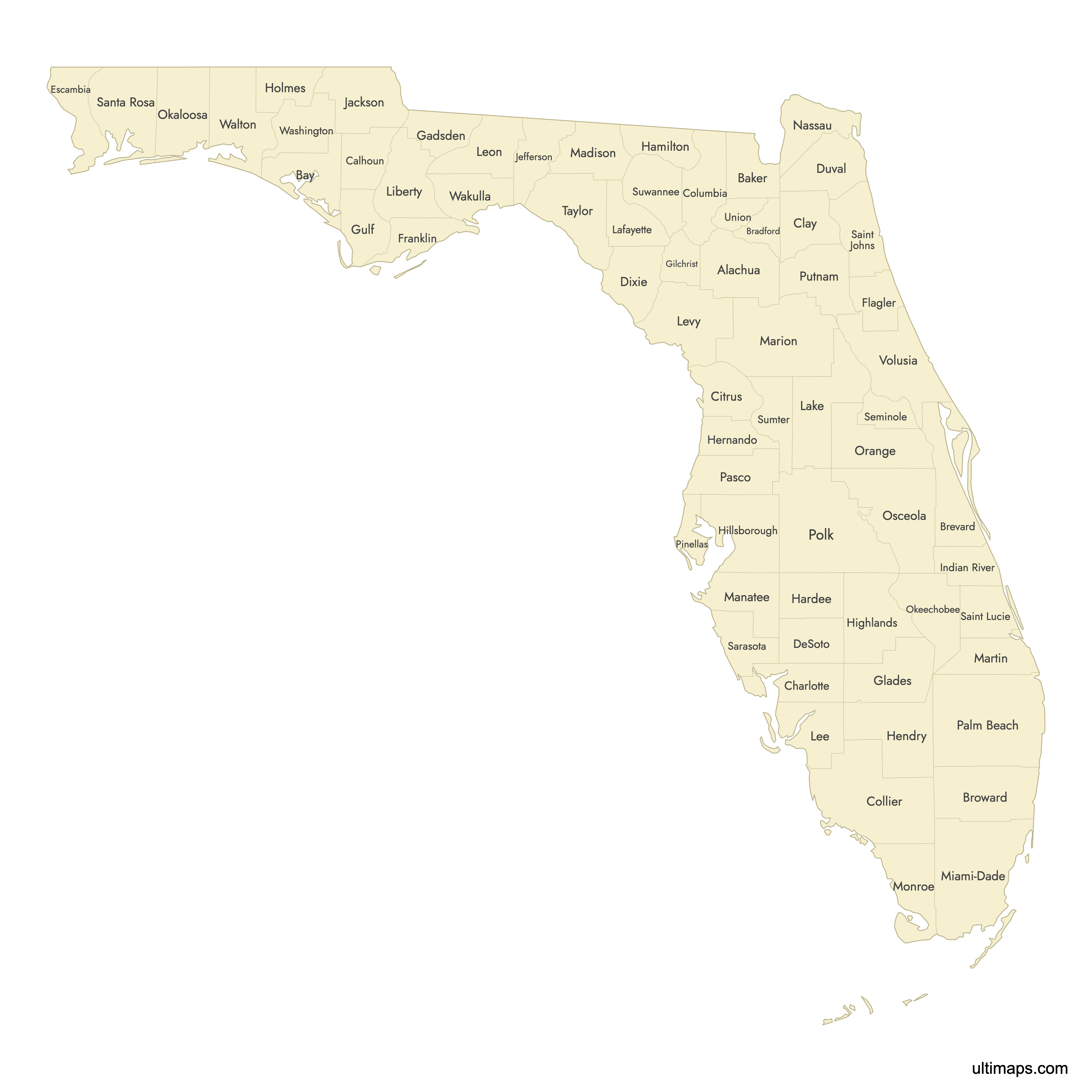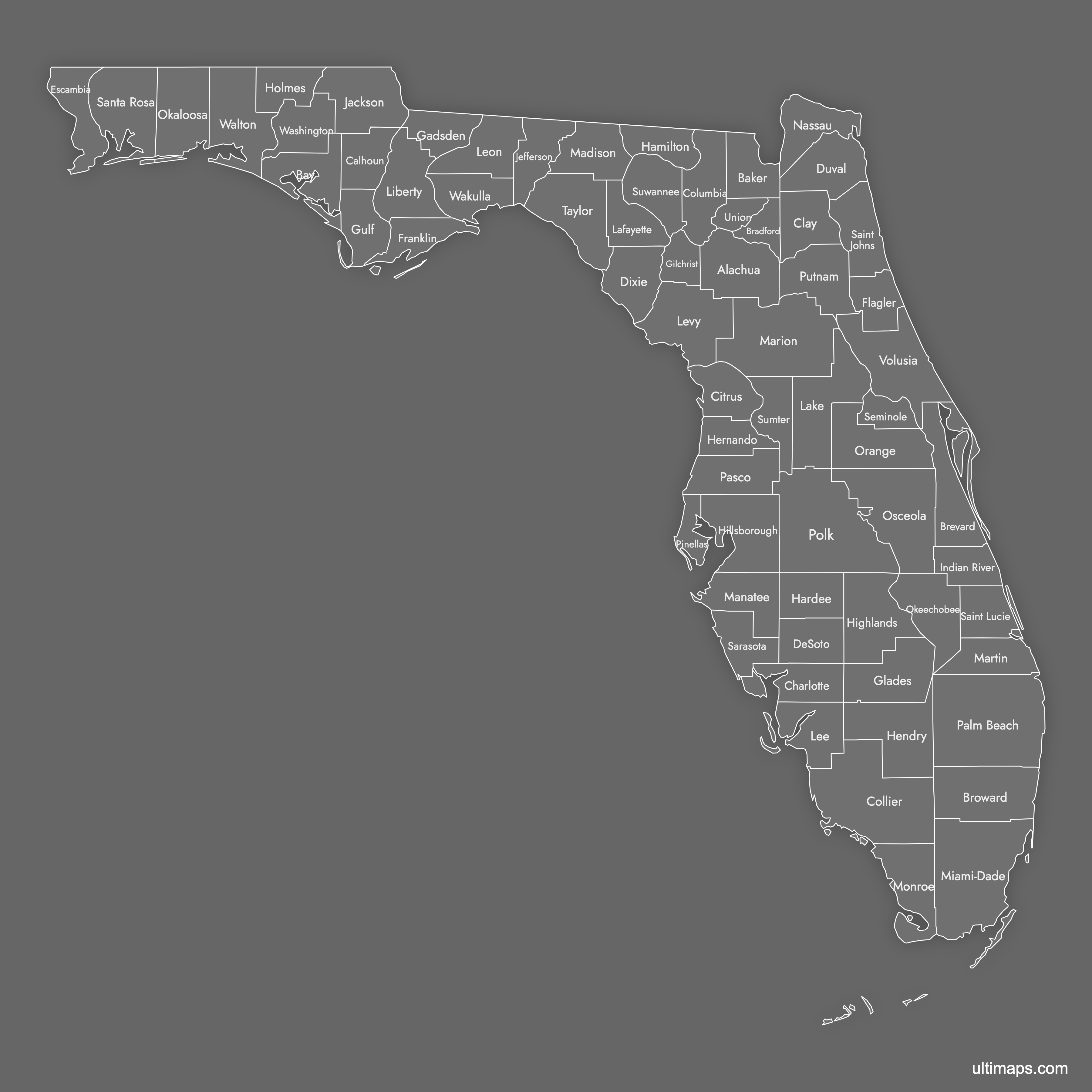 Below you can download free printable Map of Florida Counties in high resolution PNG or SVG formats.