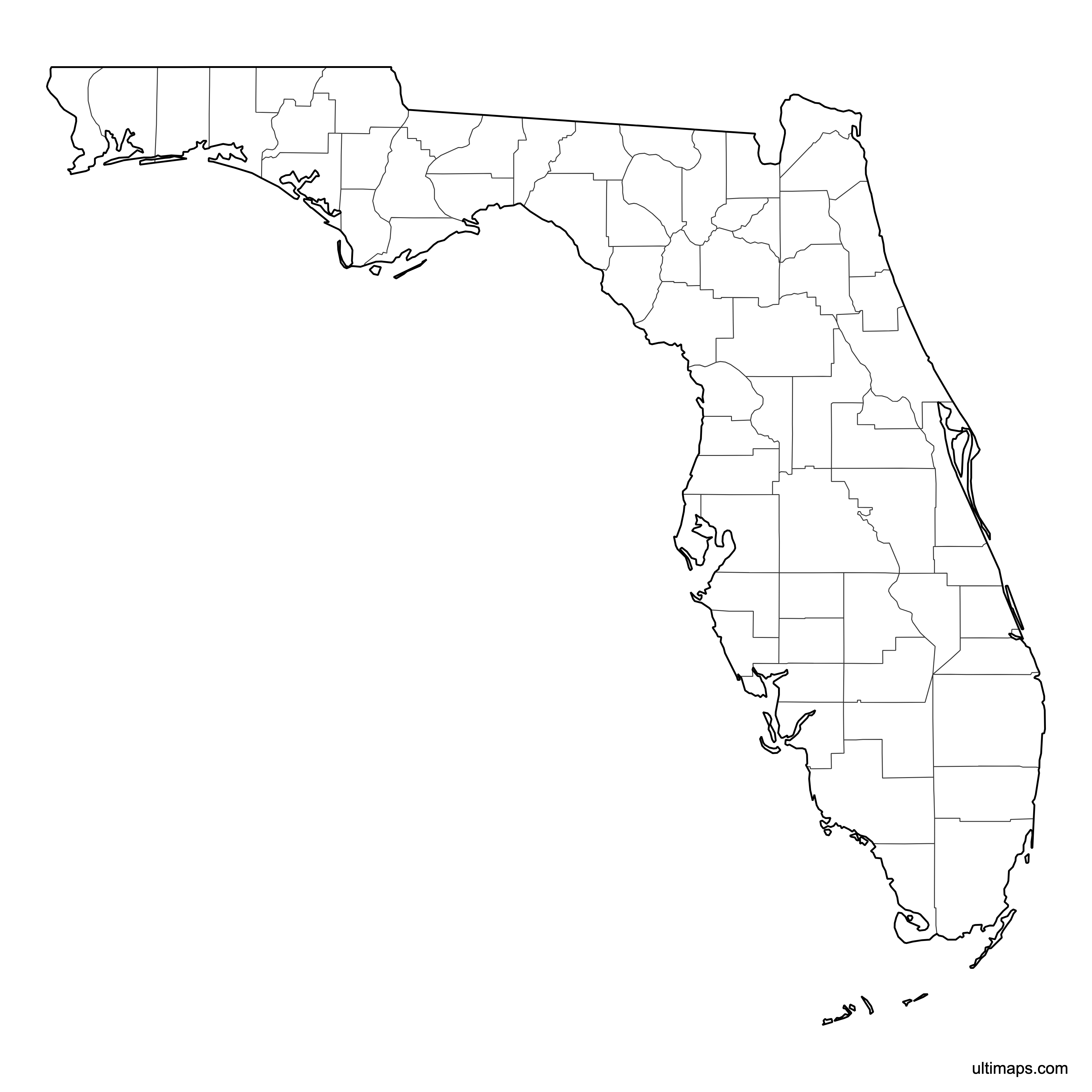 Create a custom map of Florida divided by its counties. Use Ultimaps to export your finished map in high-resolution PNG, SVG, or PDF formats, suitable for business presentations and documents. Import data directly from Excel, Google Sheets, or CSV files to automatically color each county according to your needs. You can also add pins for important city locations or offices.