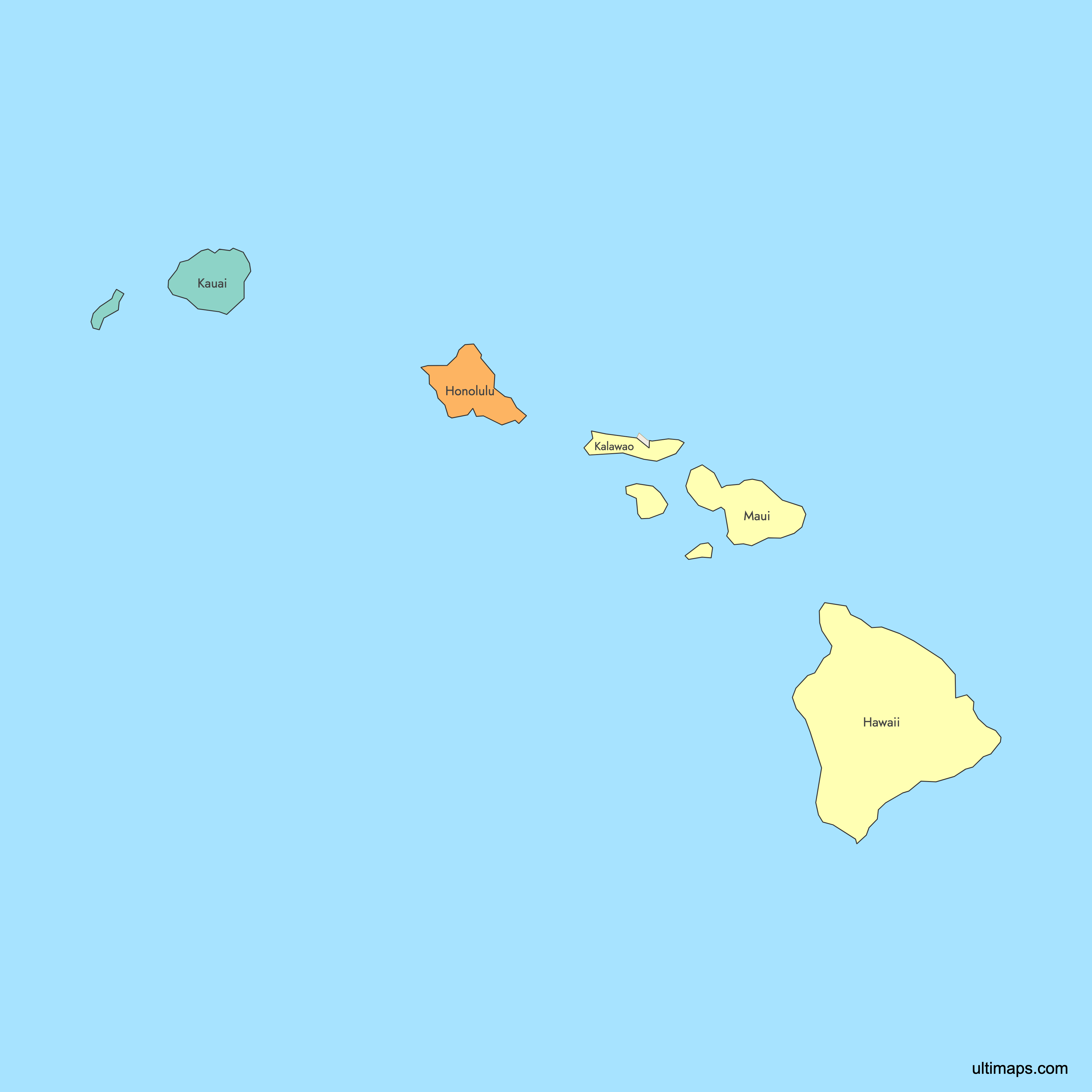 You can use Ultimaps to create custom maps of Hawaii. Color-code counties manually or upload your data, place pins, customize the look and feel, and export to PNG, PDF, or SVG. No sign-up required.