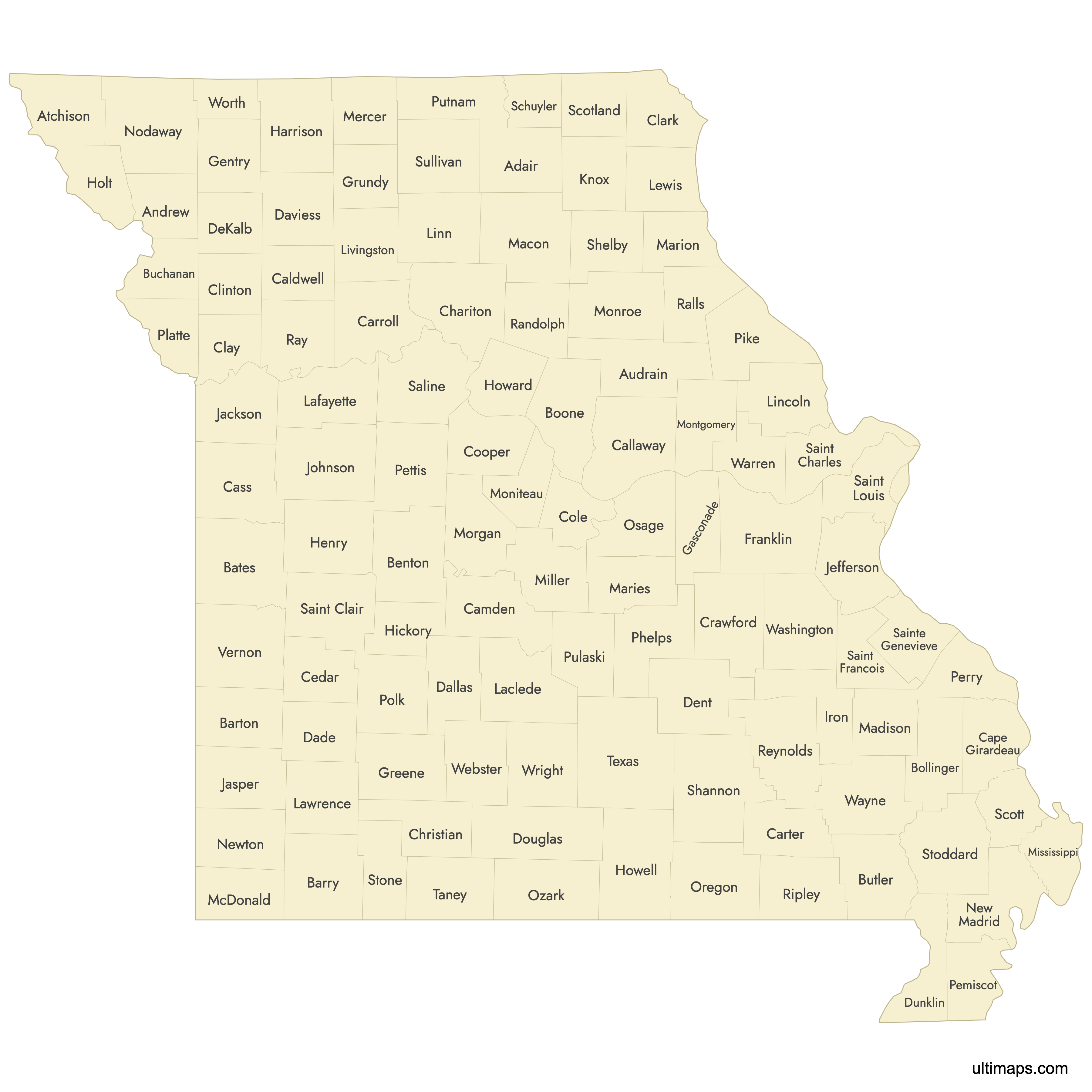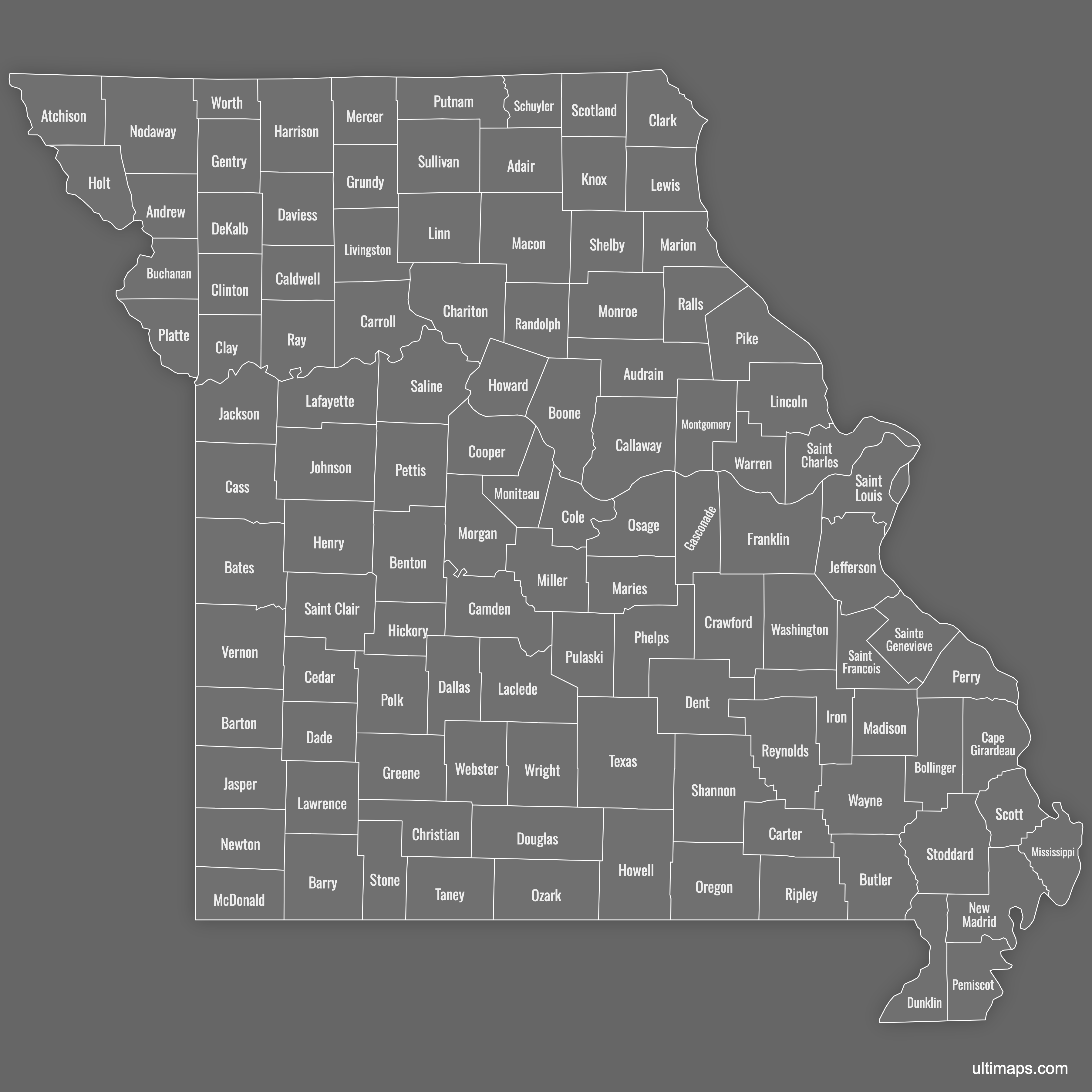 Below you can download free printable Map of Missouri Counties in high resolution PNG or SVG formats.