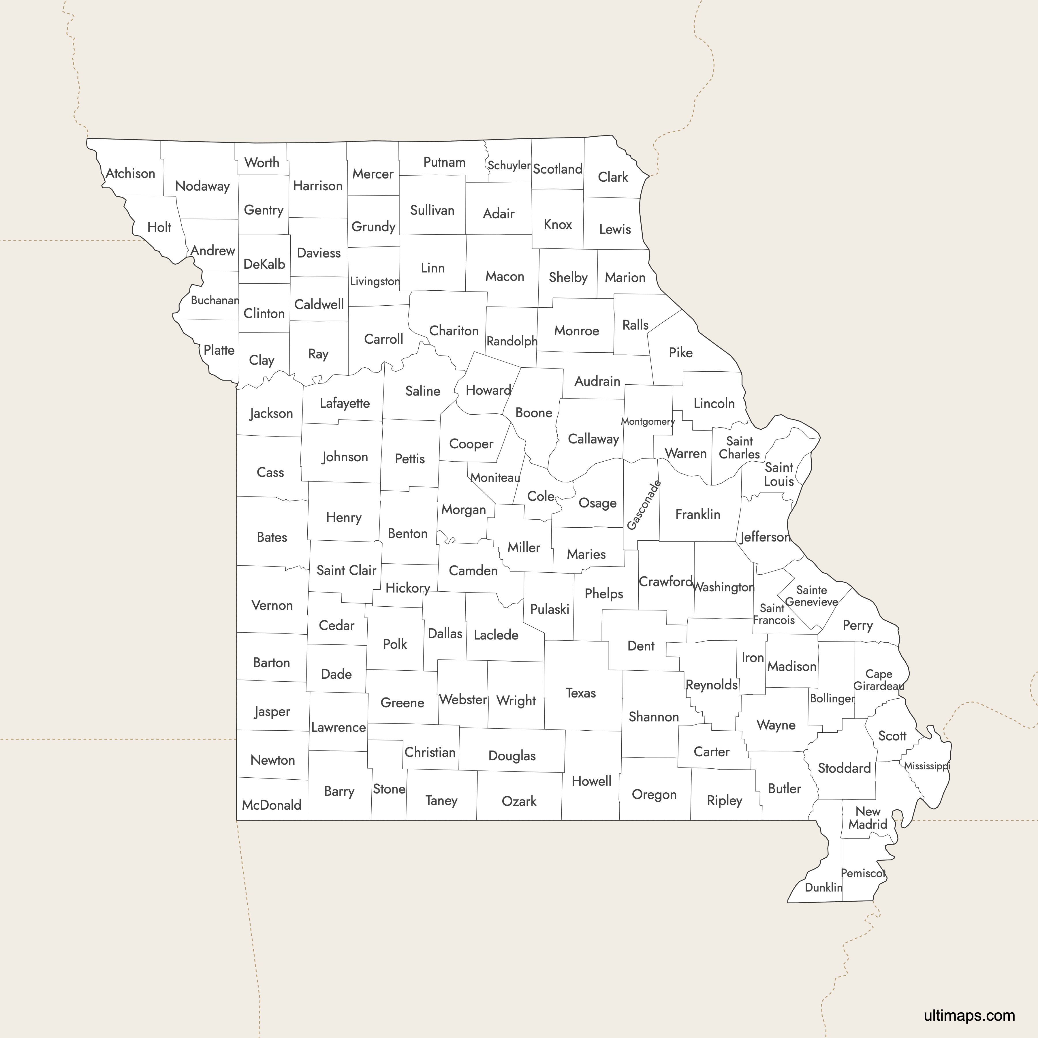 You can download free blank Map of Missouri Counties and other maps in high resolution PNG, SVG and PDF formats from the blank maps section of the site: Download Blank Map of Missouri Counties