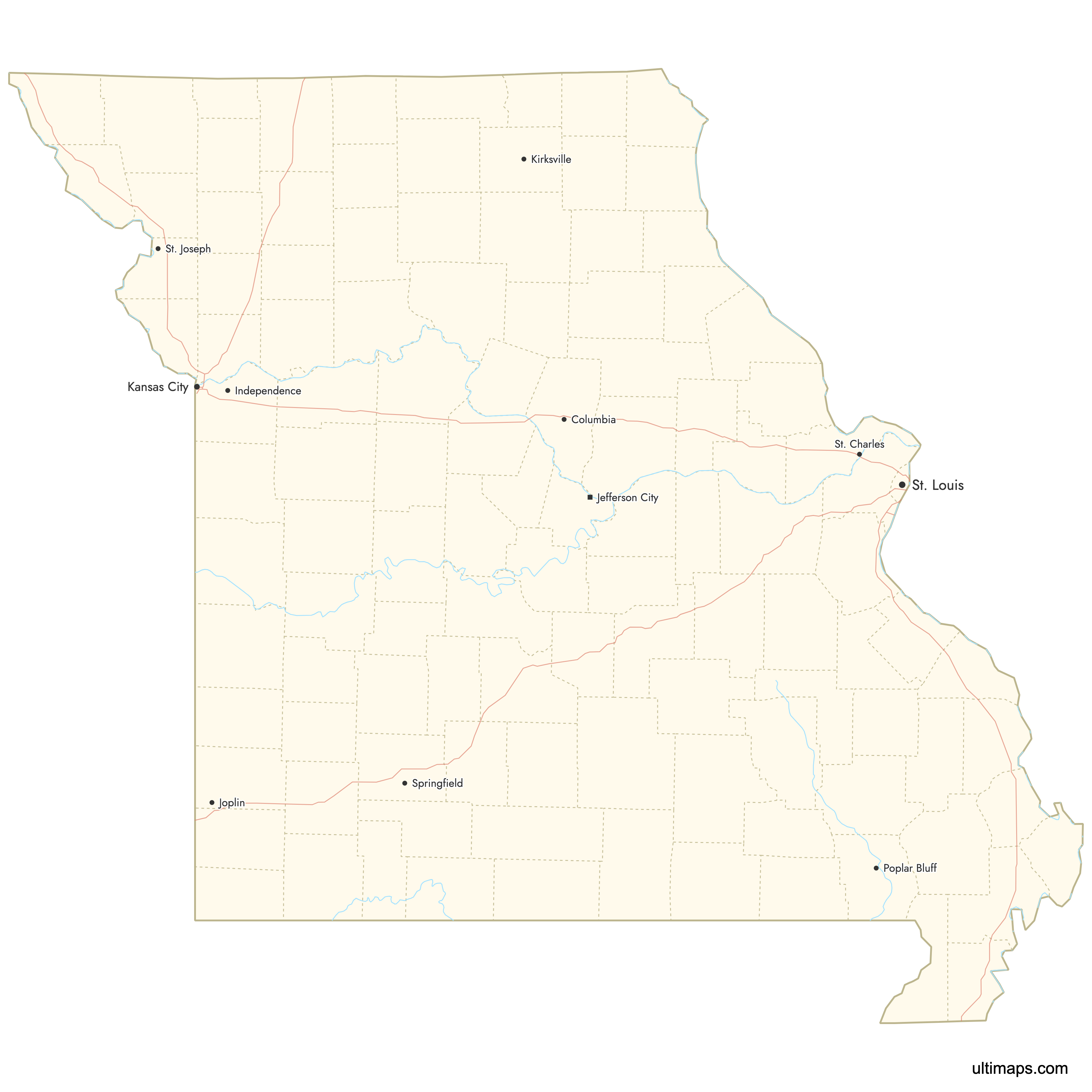 You can use Ultimaps to create custom maps of Missouri. Color-code counties manually or upload data, place pins, customize look and feel, and export to PNG, PDF, or SVG.
