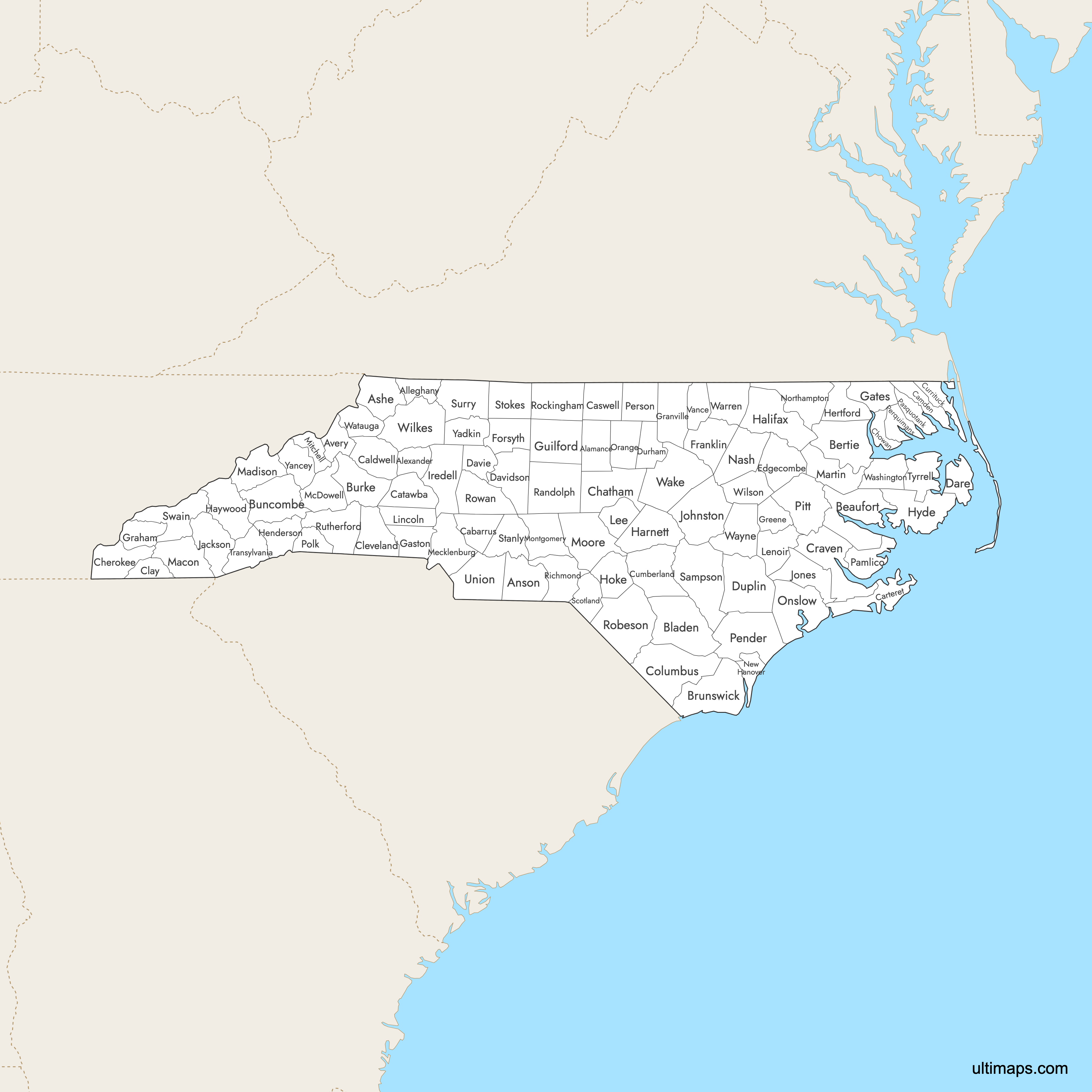 You can download free blank Map of North Carolina Counties and other maps in high resolution PNG, SVG and PDF formats from the blank maps section of the site: Download Blank Map of North Carolina Counties