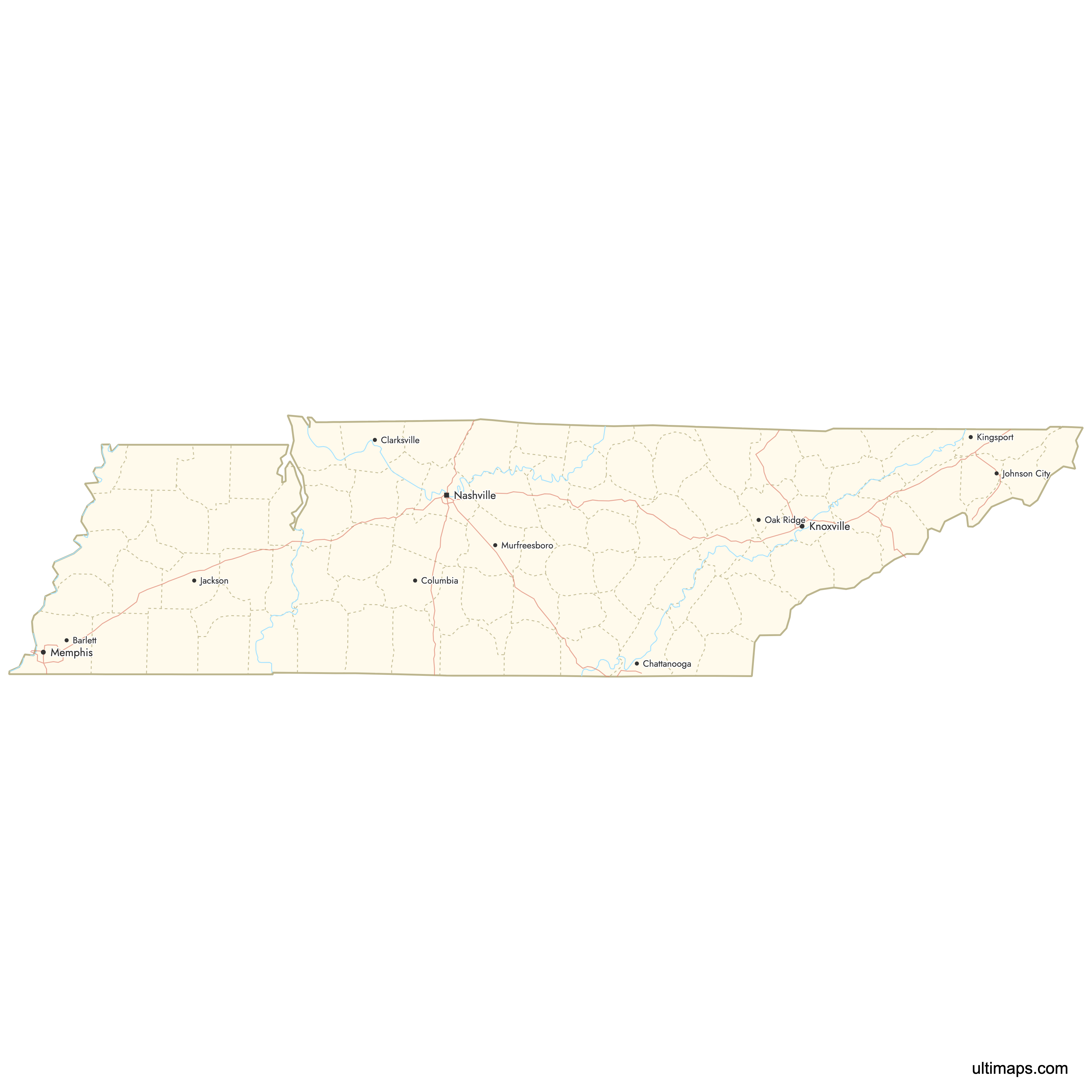 You can use Ultimaps to create custom maps of Tennessee. Color-code counties manually or upload data, place pins, customize the look and feel, and export to PNG, PDF, or SVG.