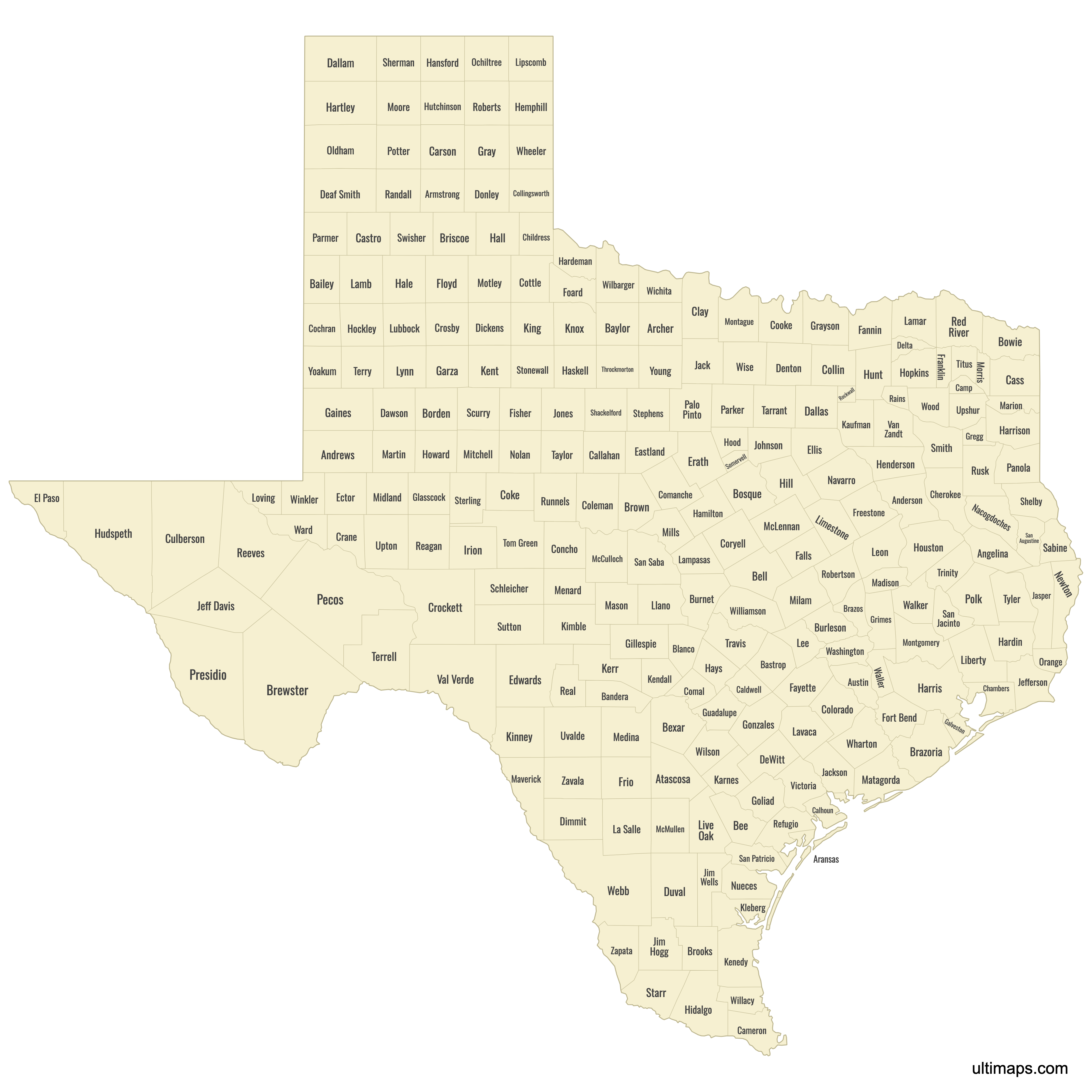 Below you can download free printable Map of Texas Counties in high resolution PNG or SVG formats.