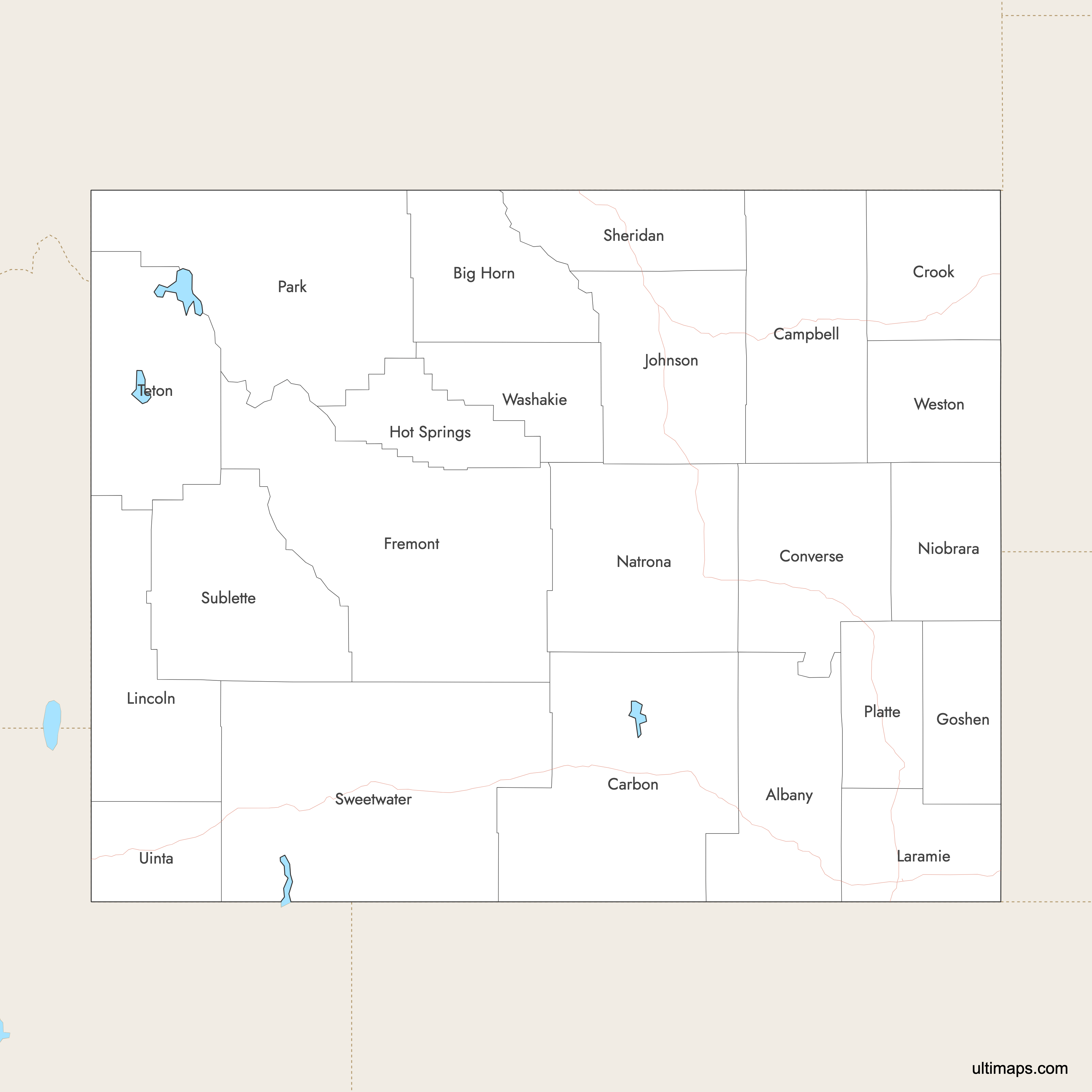 Wyoming is divided into 23 counties, each serving as a local government unit within the state. Use the interactive maps below to explore county boundaries. Download free maps or learn more about creating a custom map of Wyoming to visualize your own data.