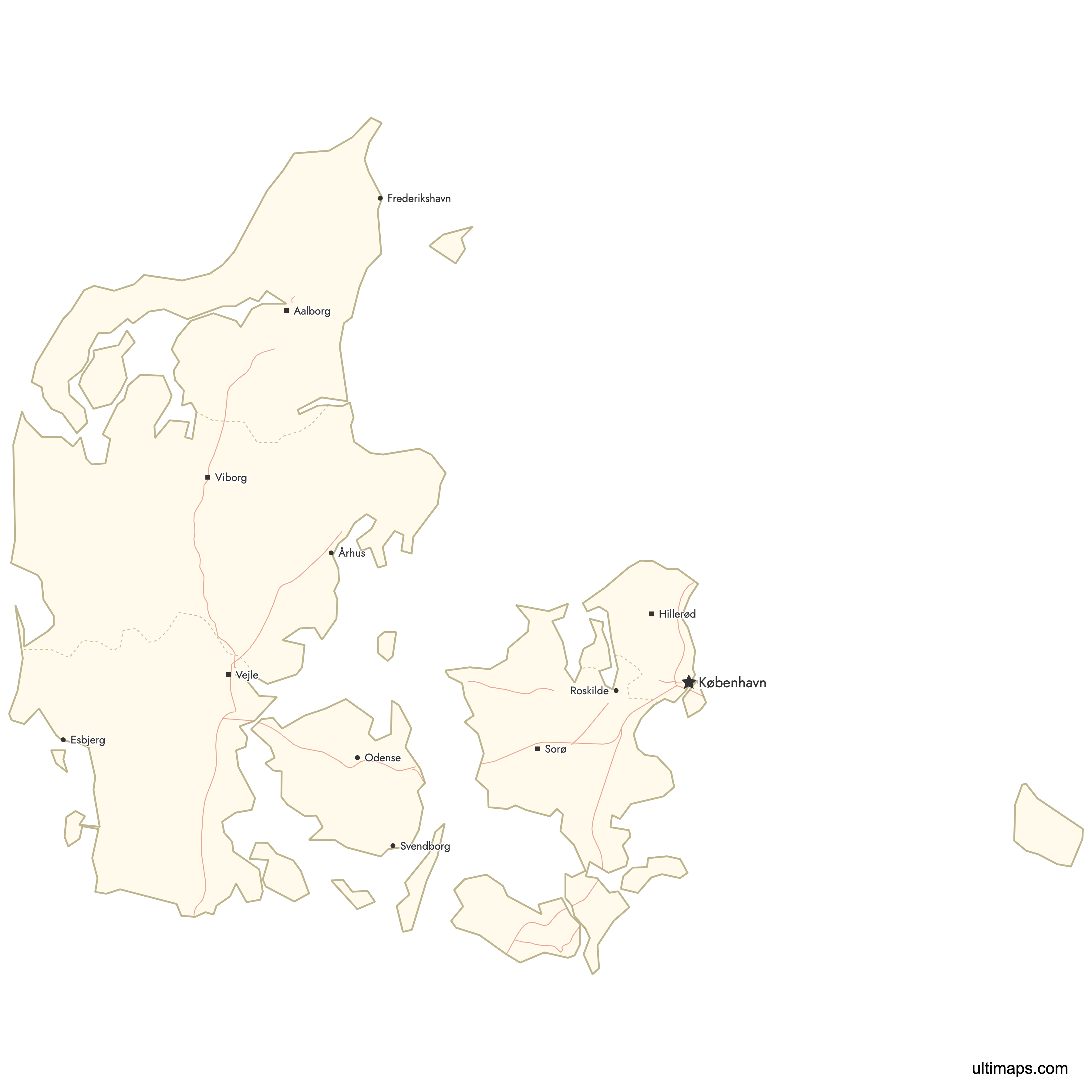 You can use Ultimaps to create custom maps of Denmark. Color-code regions manually or upload your data, place pins, customize the look and feel, and export to PNG, PDF, or SVG. No sign-up required.