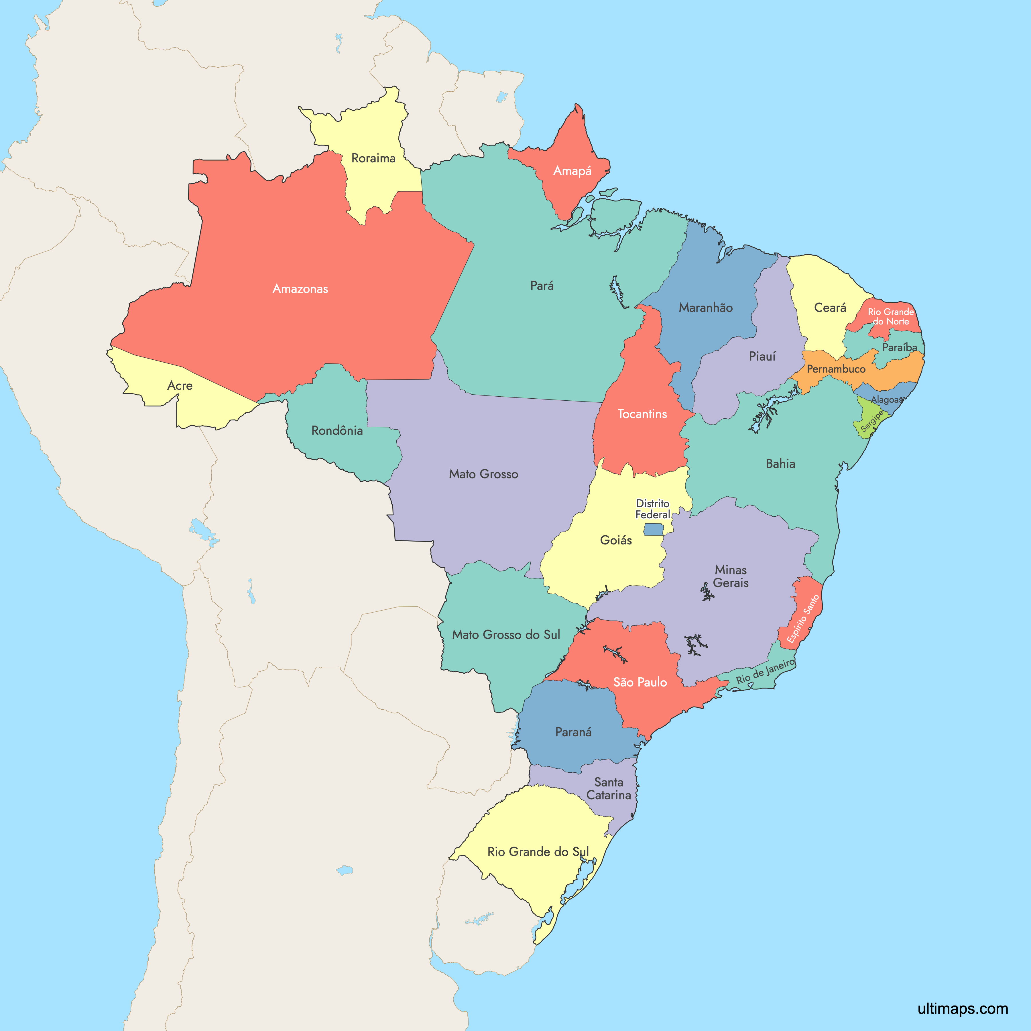 You can use Ultimaps to create custom maps of Brazil. Color-code states manually or upload data, place pins, customize look and feel, and export to PNG, PDF, or SVG.